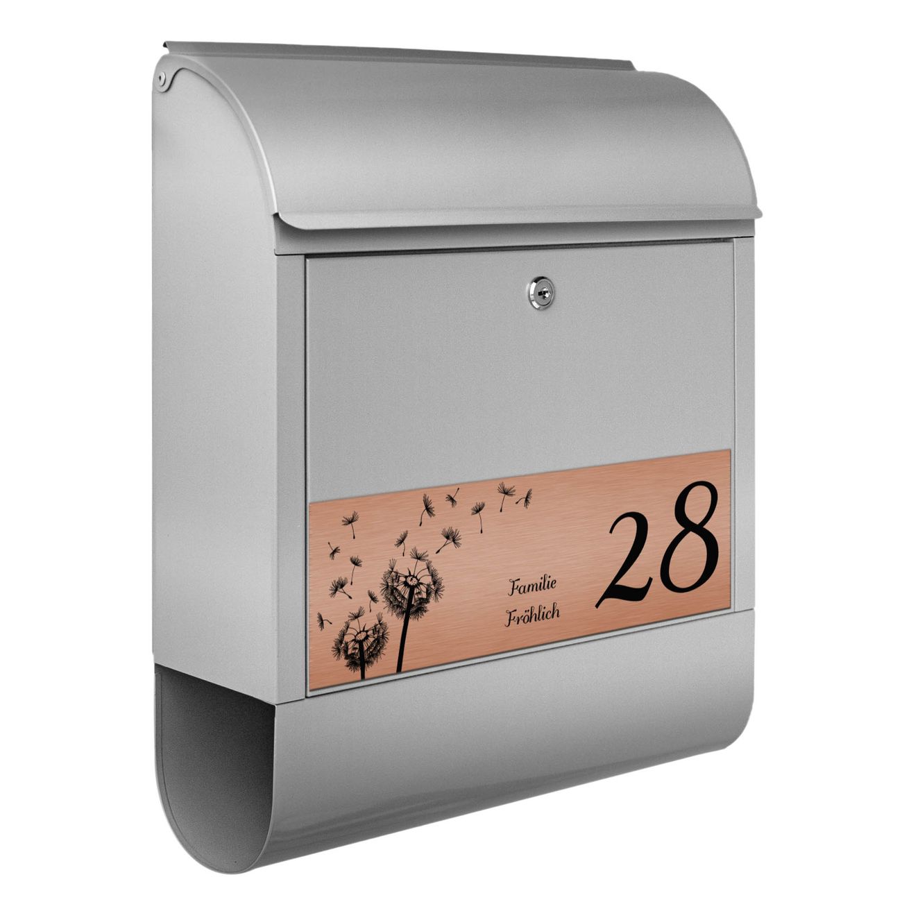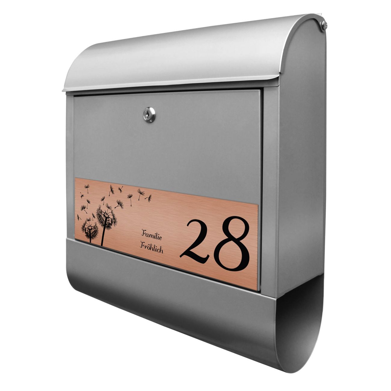 Der banjado Briefkasten mit dem Gravur Motiv Pusteblume bietet Ihnen mit seinem Fassungsvermögen genügend Platz auch für große A4 Sendungen. Die integrierte Zeitungsrolle eignet sich hervorragend, um unkompliziert die Tageszeitung zu fassen. Der Postkasten mit Motiv Pusteblume hat ein sehr ansprechendes und ausgefallenes Design, damit entlocken Sie Ihren Nachbarn und dem Postboten ein Lächeln. Heben Sie Sich von der tristen grauen Masse ab, ohne auf Funktionalität zu verzichten. Die Gravur Platte aus Acryl in Edelstahl, Gold oder Kupfer-Optik ist 33x10cm groß und schmückt die Vorderseite des Briefkastens. Das Material sieht Edelstahl, Gold und Kupfer zum Verwechseln ähnlich und ist ebenso witterungsbeständig wie dieser. Durch das Bearbeiten erscheint an den gravierten Stellen die schwarze Unterschicht und hebt so in einem guten Kontrast ihren Wunschtext, Ihre Hausnummer und das Gravur Motiv Pusteblume ab.