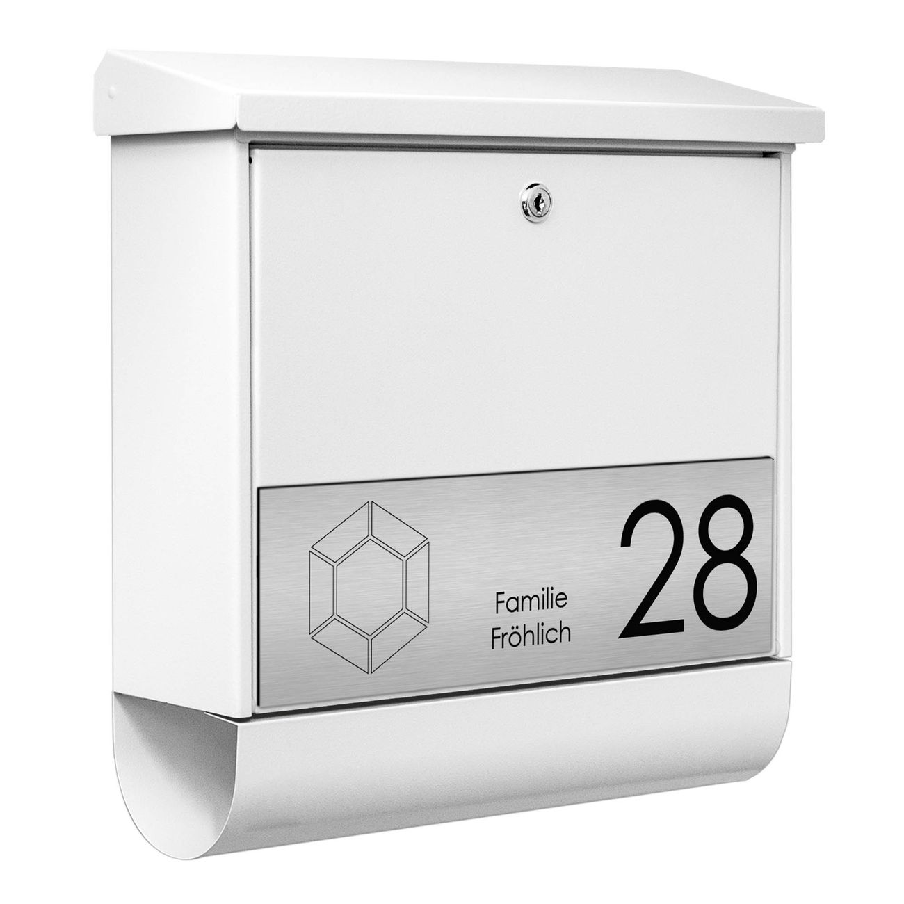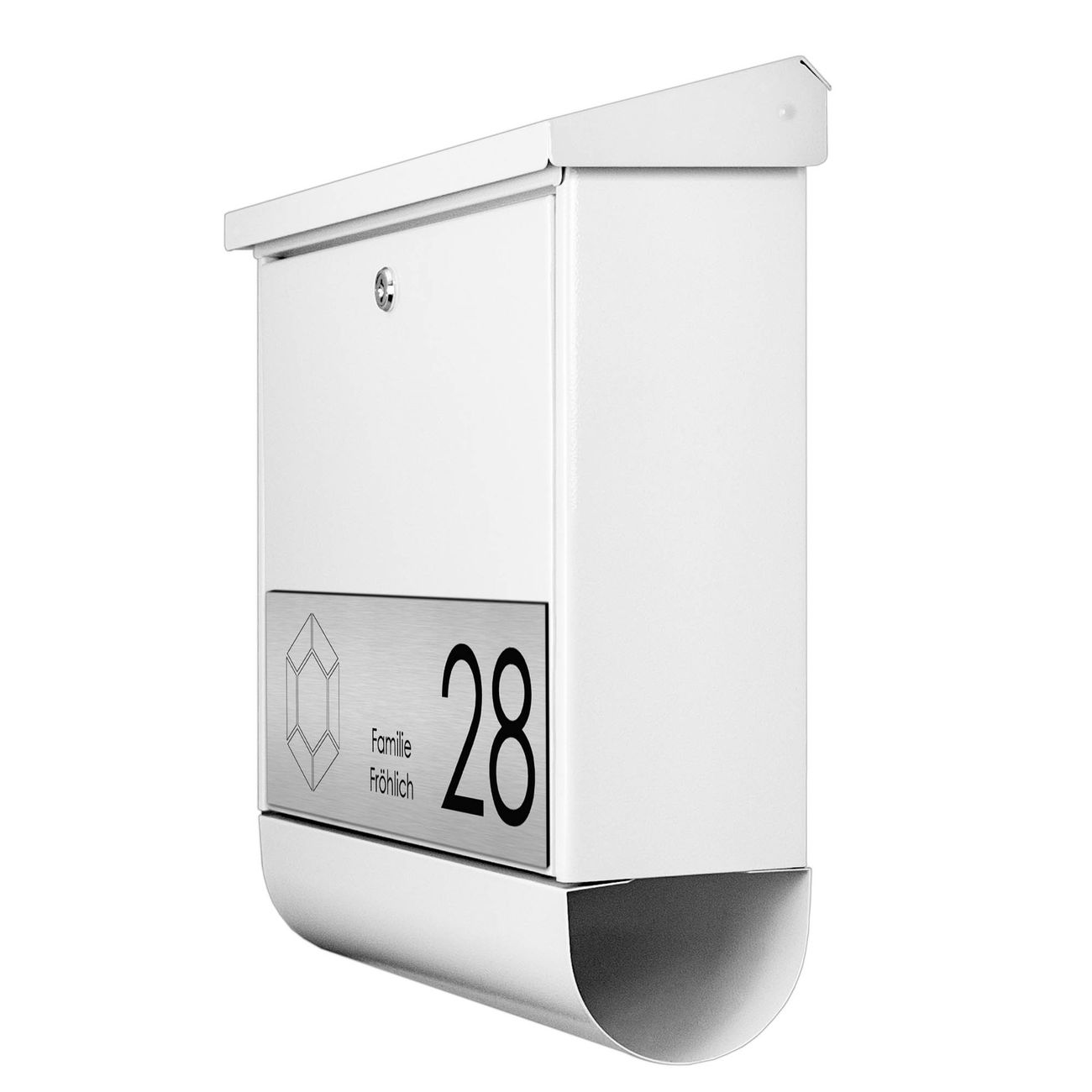 Der Briefkasten besteht aus Stahl, einem hochwertigen Material das äußerst unempfindlich gegenüber Witterungseinflüssen ist. Die Gravur Platte aus Acryl in Metall-Optik ist 33x10cm groß und schmückt die Vorderseite des Briefkastens. Das Material sieht Metall zum Verwechseln ähnlich und ist ebenso witterungsbeständig wie dieser. Durch das Bearbeiten erscheint an den gravierten Stellen die schwarze Unterschicht und hebt so in einem guten Kontrast ihren Wunschtext, Ihre Hausnummer und die Gravur immer ab. Der Postkasten ist 42,5cm hoch, 38cm breit und 11,5cm tief. Der Briefeinwurf ist 33,2cm x 3,1cm, Format DIN C4. Der Briefkasten wird mit Montagematerial und zwei Schlüsseln geliefert.