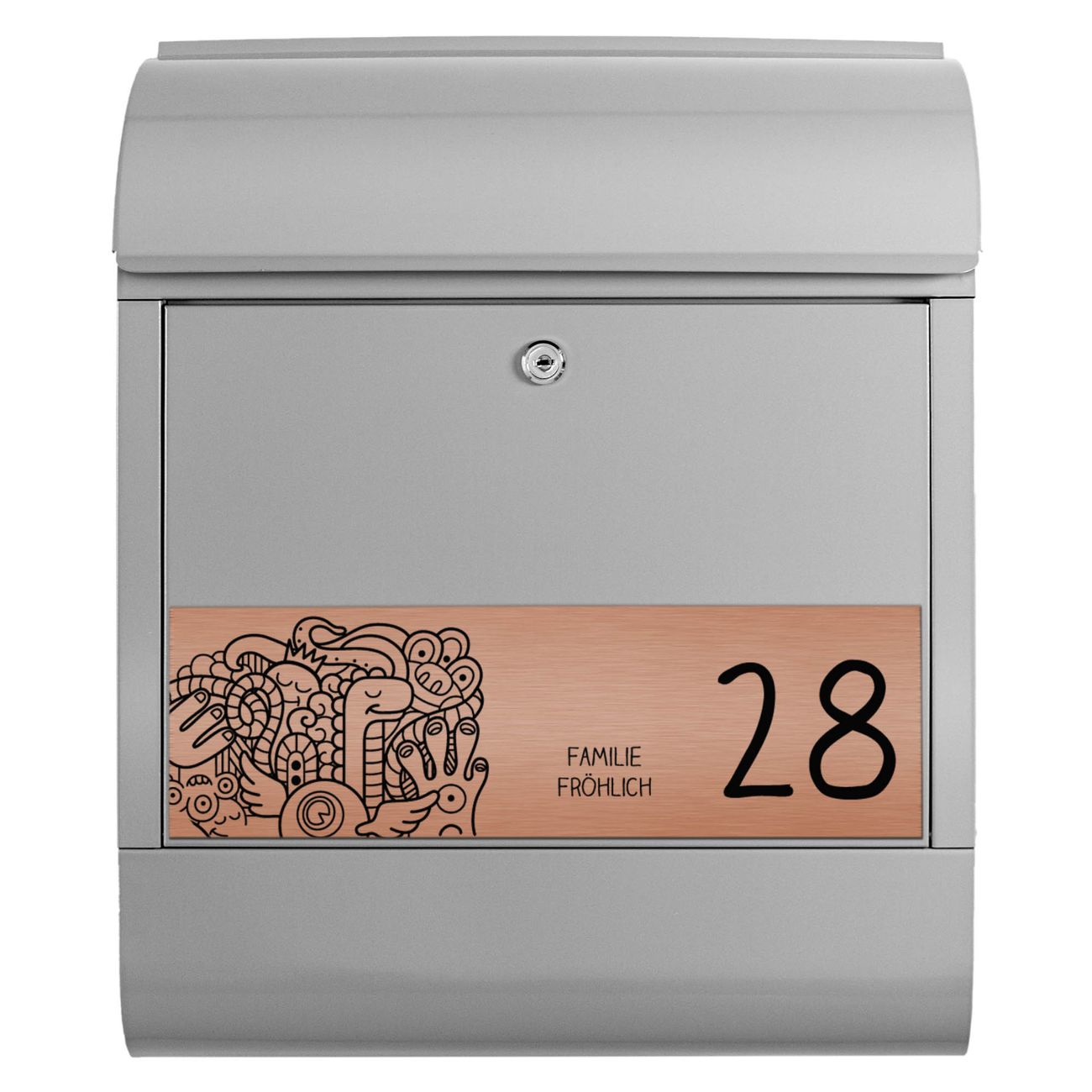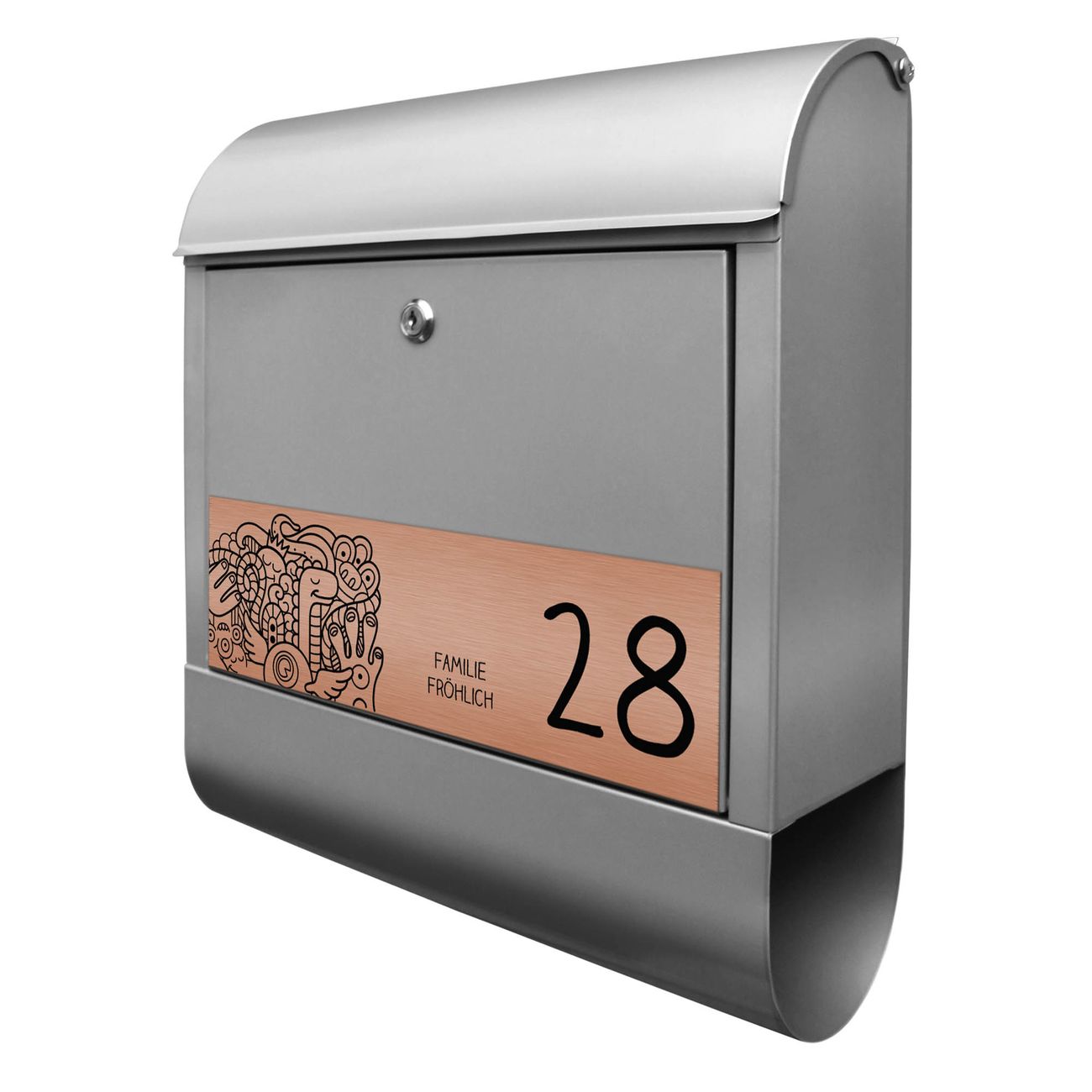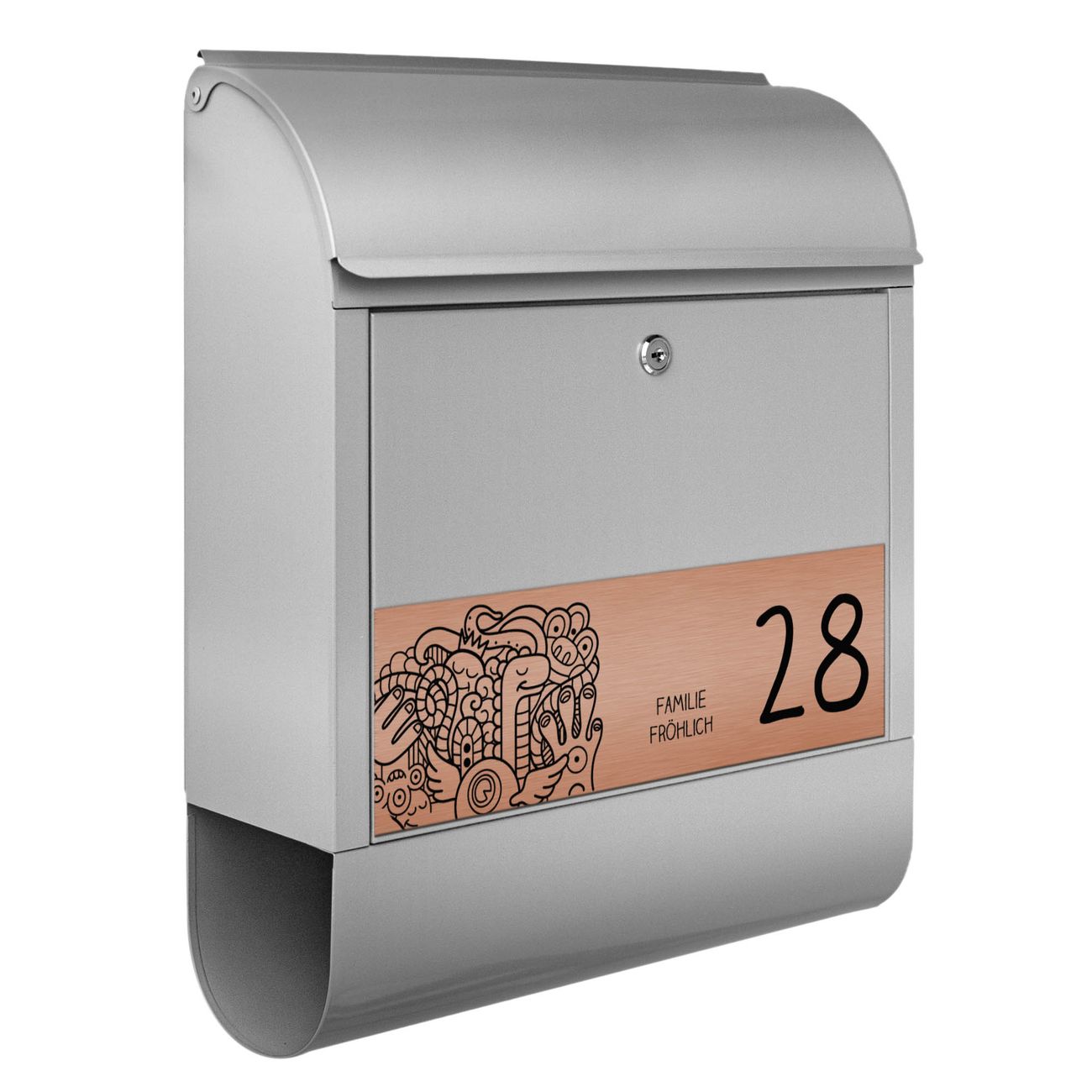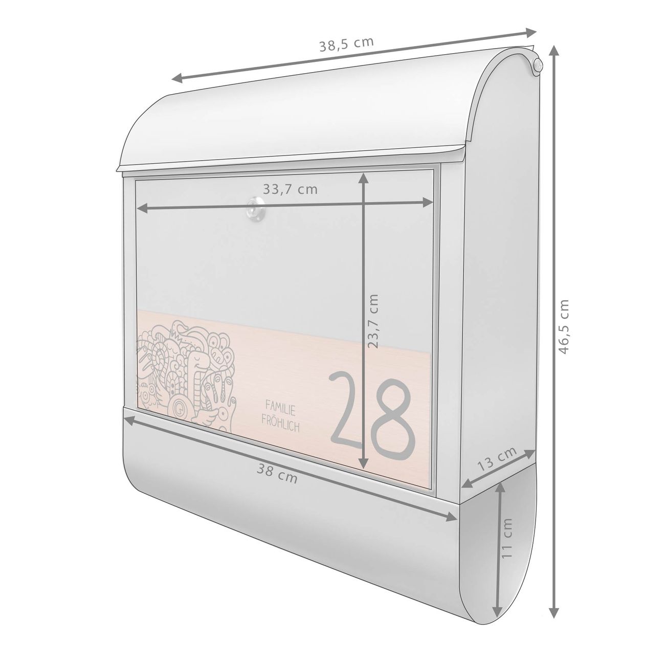 Der Postkasten besteht aus pulverbeschichtetem Stahl. Er ist 38x47x13cm groß. Die Gravur Platte besteht aus einem Laminat auf Acrylbasis mit authentisch metallischem Erscheinungsbild und ist wetter- sowie UV-resistent. Diese wir bereits von uns fest mit dem Briefkasten verklebt. Der Briefkasten wird mit Montagematerial, zwei Schlüsseln sowie einer Bohrschablone geliefert. Sie können diesen Briefkasten sowohl als Wandbriefkasten montieren oder einen passenden Briefkastenstandfuß kaufen und als Standbriefkasten einbetonieren. Auch für die Montage an einem Zaun bieten wir das passende Zubehör an. Die Größe bietet genügend Platz für Sendungen aller Art, der Einwurf fasst auch größere A4 Sendungen.