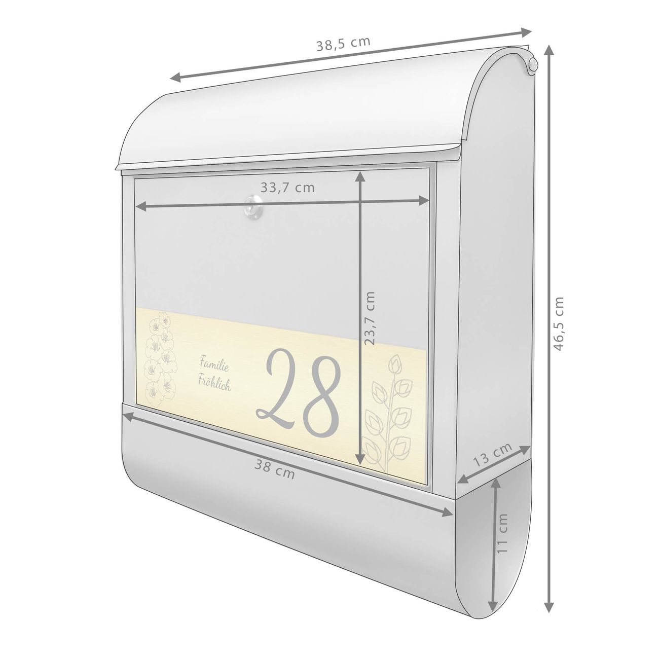 Der Postkasten besteht aus pulverbeschichtetem Stahl. Er ist 38x47x13cm groß. Die Gravur Platte besteht aus einem Laminat auf Acrylbasis mit authentisch metallischem Erscheinungsbild und ist wetter- sowie UV-resistent. Diese wir bereits von uns fest mit dem Briefkasten verklebt. Der Briefkasten wird mit Montagematerial, zwei Schlüsseln sowie einer Bohrschablone geliefert. Sie können diesen Briefkasten sowohl als Wandbriefkasten montieren oder einen passenden Briefkastenstandfuß kaufen und als Standbriefkasten einbetonieren. Auch für die Montage an einem Zaun bieten wir das passende Zubehör an. Die Größe bietet genügend Platz für Sendungen aller Art, der Einwurf fasst auch größere A4 Sendungen.