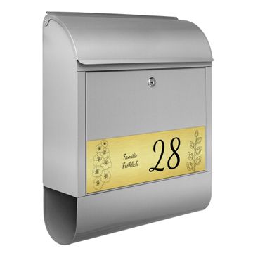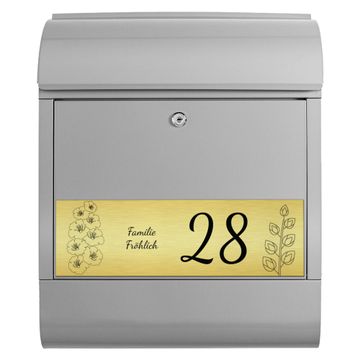 Der banjado Briefkasten mit dem Gravur Motiv Blumen bietet Ihnen mit seinem Fassungsvermögen genügend Platz auch für große A4 Sendungen. Die integrierte Zeitungsrolle eignet sich hervorragend, um unkompliziert die Tageszeitung zu fassen. Der Postkasten mit Motiv Blumen hat ein sehr ansprechendes und ausgefallenes Design, damit entlocken Sie Ihren Nachbarn und dem Postboten ein Lächeln. Heben Sie Sich von der tristen grauen Masse ab, ohne auf Funktionalität zu verzichten. Die Gravur Platte aus Acryl in Edelstahl, Gold oder Kupfer-Optik ist 33x10cm groß und schmückt die Vorderseite des Briefkastens. Das Material sieht Edelstahl, Gold und Kupfer zum Verwechseln ähnlich und ist ebenso witterungsbeständig wie dieser. Durch das Bearbeiten erscheint an den gravierten Stellen die schwarze Unterschicht und hebt so in einem guten Kontrast ihren Wunschtext, Ihre Hausnummer und das Gravur Motiv Blumen ab.
