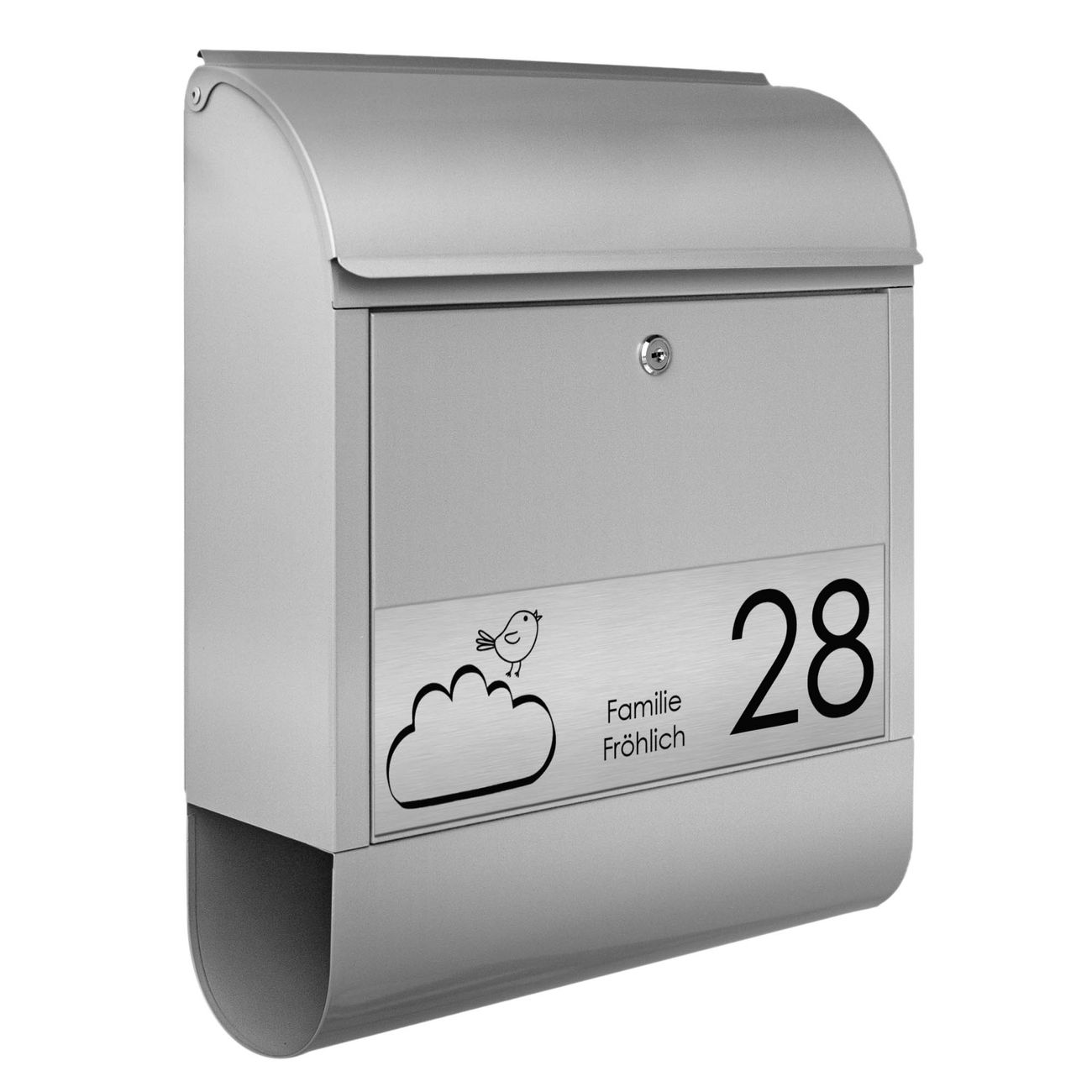 Der banjado Briefkasten mit dem Gravur Motiv Cloud Surfing bietet Ihnen mit seinem Fassungsvermögen genügend Platz auch für große A4 Sendungen. Die integrierte Zeitungsrolle eignet sich hervorragend, um unkompliziert die Tageszeitung zu fassen. Der Postkasten mit Motiv Cloud Surfing hat ein sehr ansprechendes und ausgefallenes Design, damit entlocken Sie Ihren Nachbarn und dem Postboten ein Lächeln. Heben Sie Sich von der tristen grauen Masse ab, ohne auf Funktionalität zu verzichten. Die Gravur Platte aus Acryl in Edelstahl, Gold oder Kupfer-Optik ist 33x10cm groß und schmückt die Vorderseite des Briefkastens. Das Material sieht Edelstahl, Gold und Kupfer zum Verwechseln ähnlich und ist ebenso witterungsbeständig wie dieser. Durch das Bearbeiten erscheint an den gravierten Stellen die schwarze Unterschicht und hebt so in einem guten Kontrast ihren Wunschtext, Ihre Hausnummer und das Gravur Motiv Cloud Surfing ab.