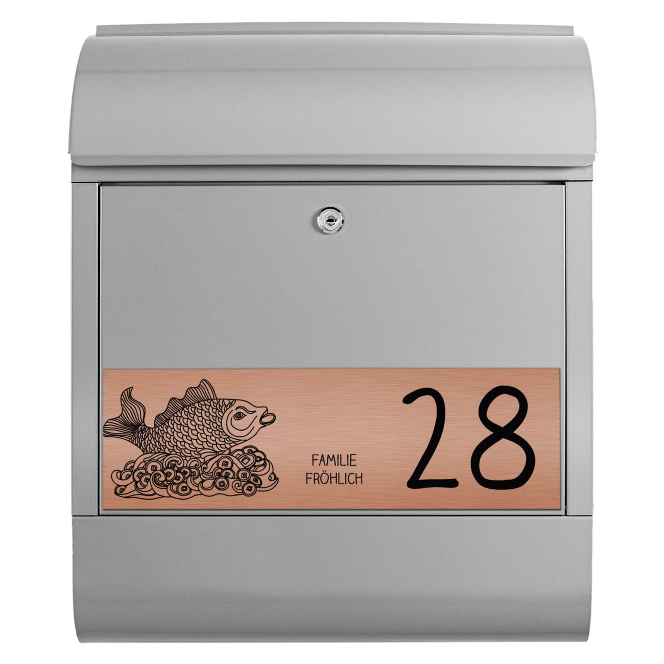 Der banjado Briefkasten mit dem Gravur Motiv Fisch bietet Ihnen mit seinem Fassungsvermögen genügend Platz auch für große A4 Sendungen. Die integrierte Zeitungsrolle eignet sich hervorragend, um unkompliziert die Tageszeitung zu fassen. Der Postkasten mit Motiv Fisch hat ein sehr ansprechendes und ausgefallenes Design, damit entlocken Sie Ihren Nachbarn und dem Postboten ein Lächeln. Heben Sie Sich von der tristen grauen Masse ab, ohne auf Funktionalität zu verzichten. Die Gravur Platte aus Acryl in Edelstahl, Gold oder Kupfer-Optik ist 33x10cm groß und schmückt die Vorderseite des Briefkastens. Das Material sieht Edelstahl, Gold und Kupfer zum Verwechseln ähnlich und ist ebenso witterungsbeständig wie dieser. Durch das Bearbeiten erscheint an den gravierten Stellen die schwarze Unterschicht und hebt so in einem guten Kontrast ihren Wunschtext, Ihre Hausnummer und das Gravur Motiv Fisch ab.