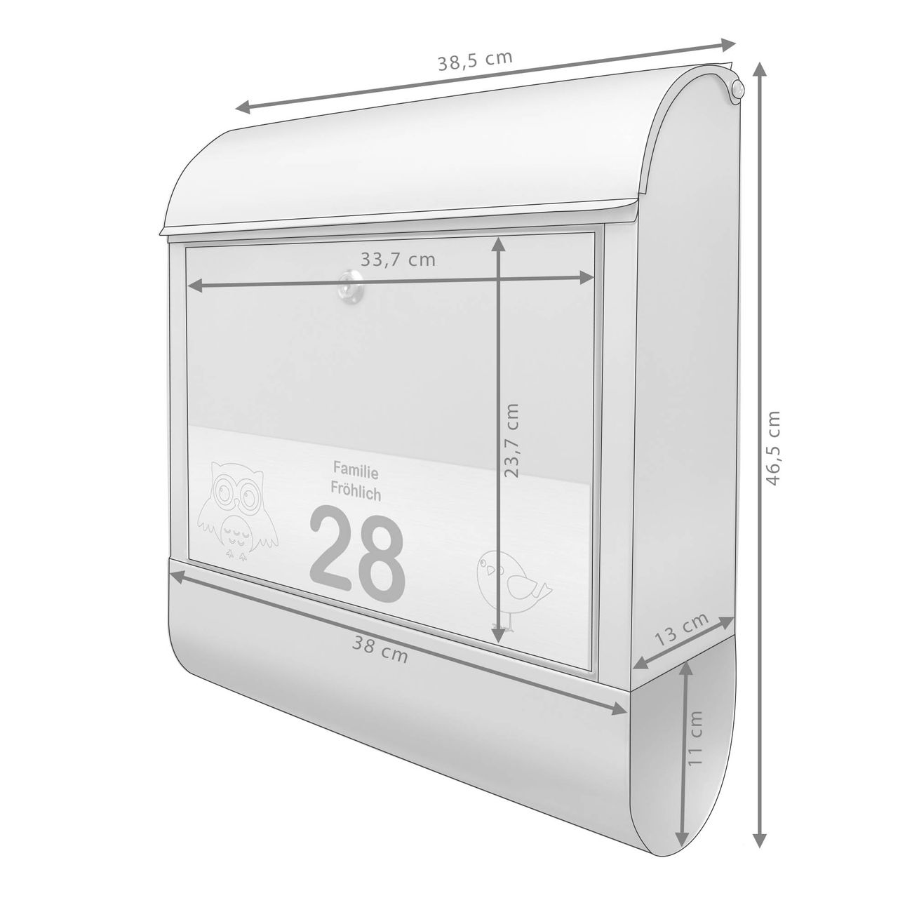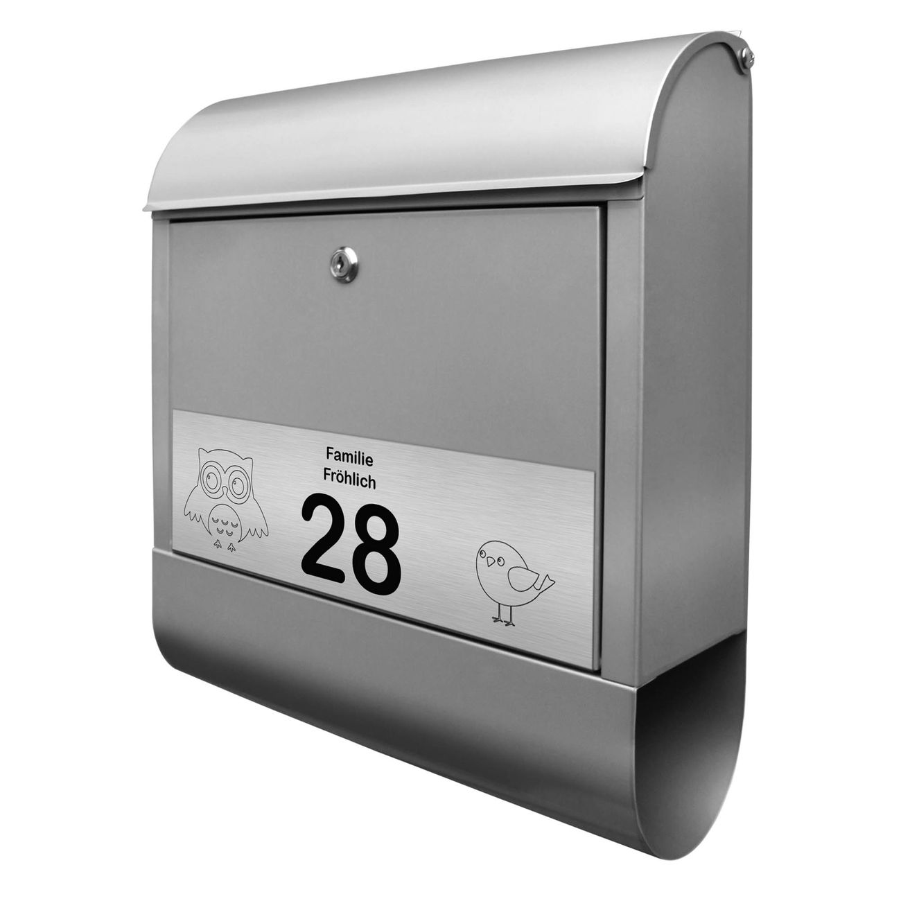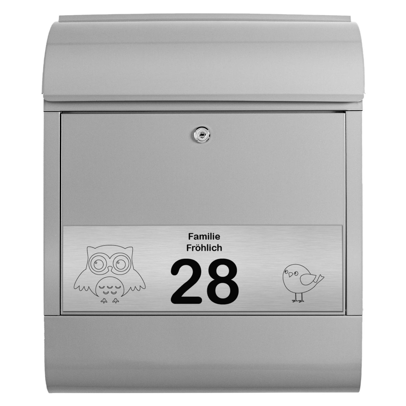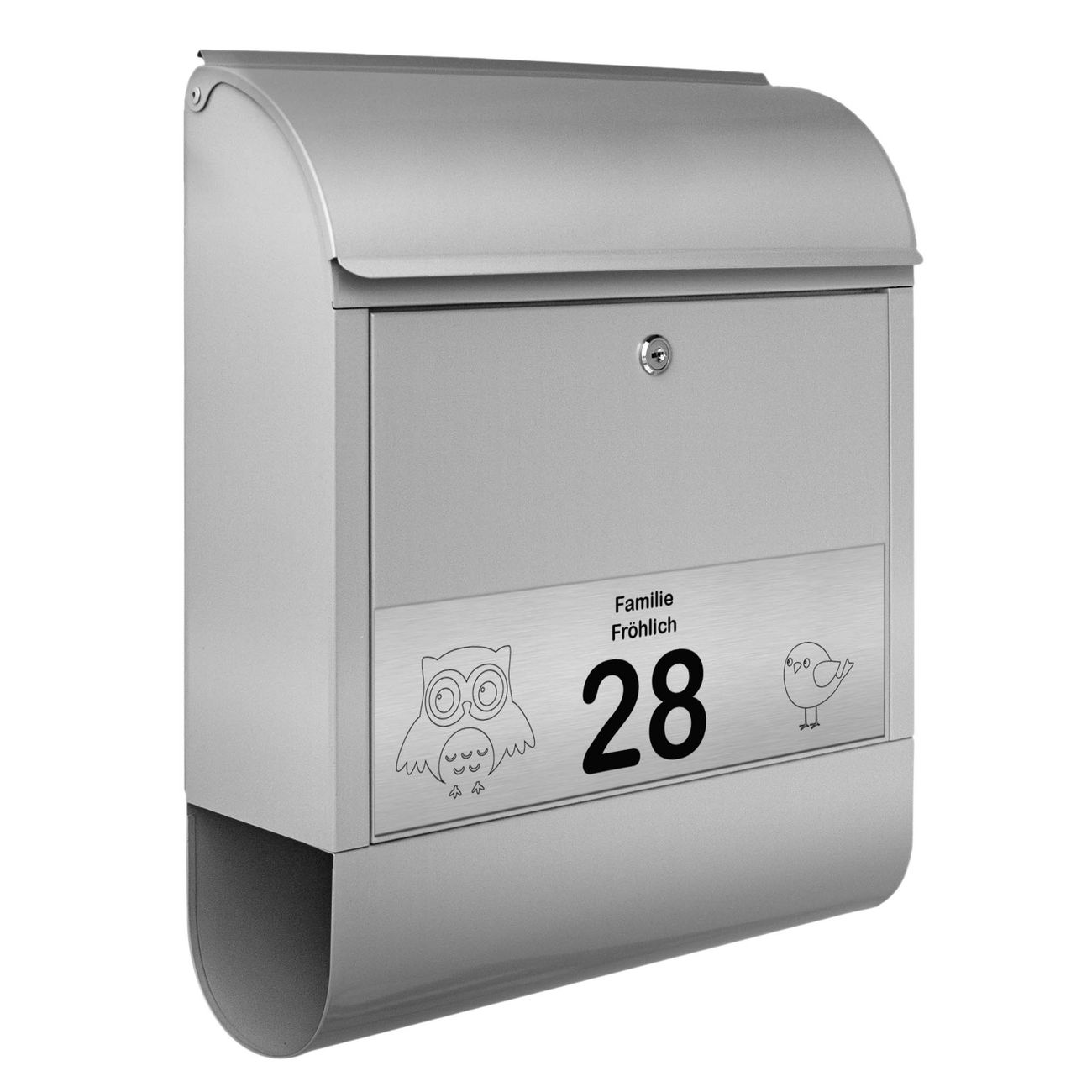 Der Postkasten besteht aus pulverbeschichtetem Stahl. Er ist 38x47x13cm groß. Die Gravur Platte besteht aus einem Laminat auf Acrylbasis mit authentisch metallischem Erscheinungsbild und ist wetter- sowie UV-resistent. Diese wir bereits von uns fest mit dem Briefkasten verklebt. Der Briefkasten wird mit Montagematerial, zwei Schlüsseln sowie einer Bohrschablone geliefert. Sie können diesen Briefkasten sowohl als Wandbriefkasten montieren oder einen passenden Briefkastenstandfuß kaufen und als Standbriefkasten einbetonieren. Auch für die Montage an einem Zaun bieten wir das passende Zubehör an. Die Größe bietet genügend Platz für Sendungen aller Art, der Einwurf fasst auch größere A4 Sendungen.