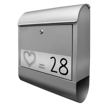 Der banjado Briefkasten mit dem Gravur Motiv Herzbordüre bietet Ihnen mit seinem Fassungsvermögen genügend Platz auch für große A4 Sendungen. Die integrierte Zeitungsrolle eignet sich hervorragend, um unkompliziert die Tageszeitung zu fassen. Der Postkasten mit Motiv Herzbordüre hat ein sehr ansprechendes und ausgefallenes Design, damit entlocken Sie Ihren Nachbarn und dem Postboten ein Lächeln. Heben Sie Sich von der tristen grauen Masse ab, ohne auf Funktionalität zu verzichten. Die Gravur Platte aus Acryl in Edelstahl, Gold oder Kupfer-Optik ist 33x10cm groß und schmückt die Vorderseite des Briefkastens. Das Material sieht Edelstahl, Gold und Kupfer zum Verwechseln ähnlich und ist ebenso witterungsbeständig wie dieser. Durch das Bearbeiten erscheint an den gravierten Stellen die schwarze Unterschicht und hebt so in einem guten Kontrast ihren Wunschtext, Ihre Hausnummer und das Gravur Motiv Herzbordüre ab.