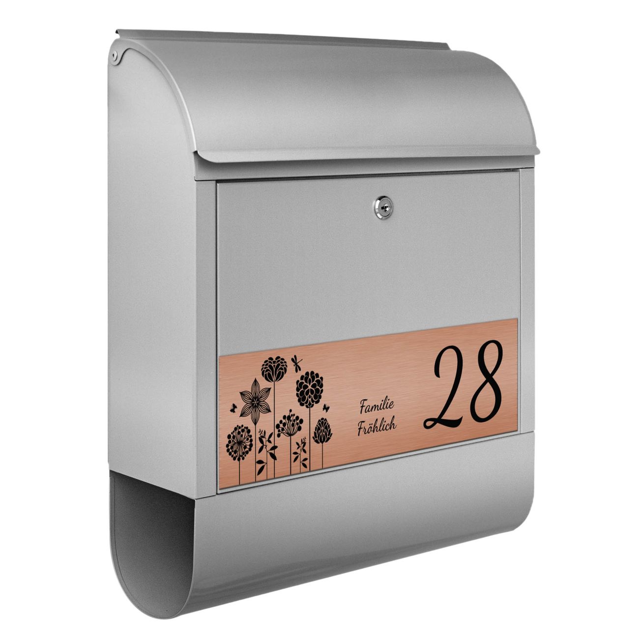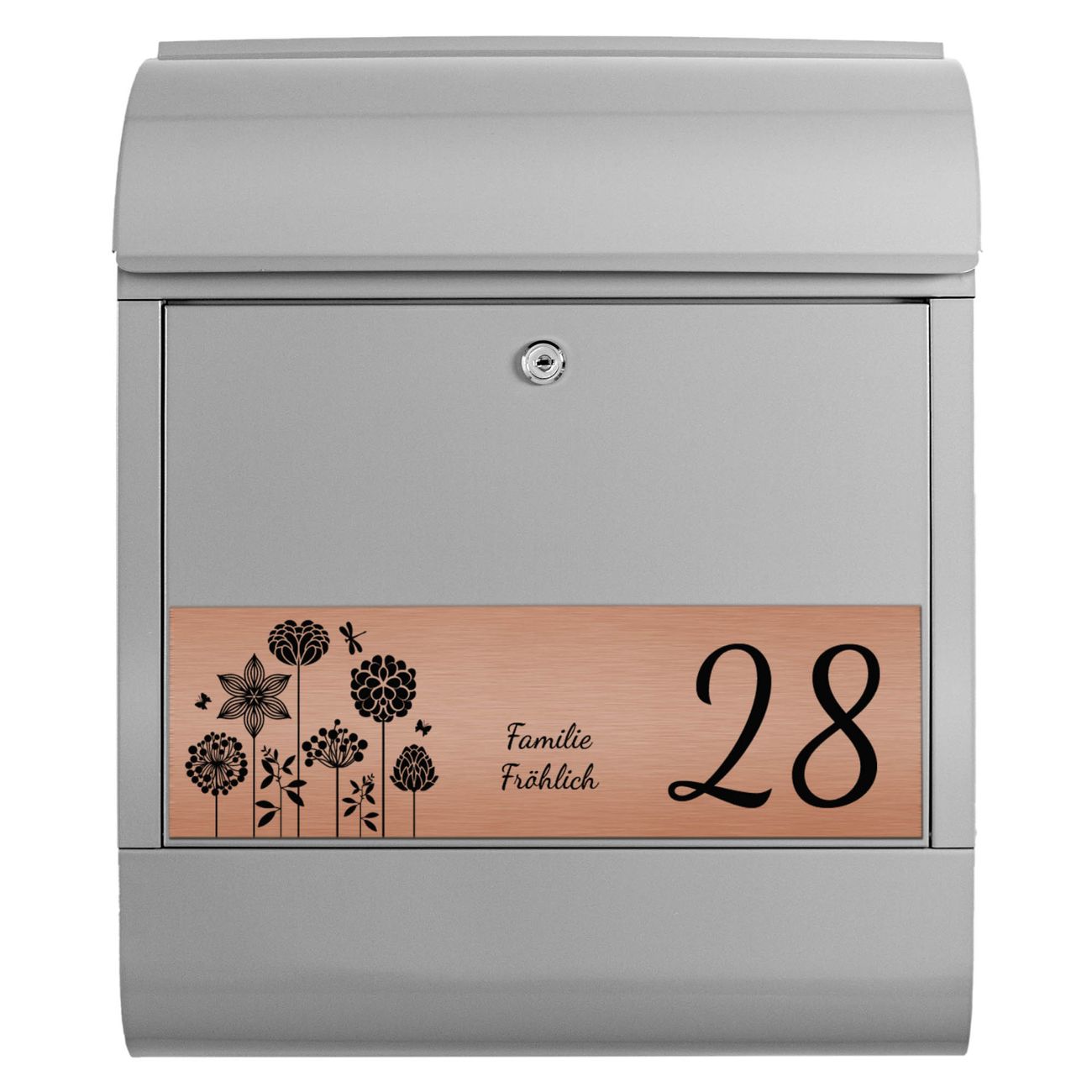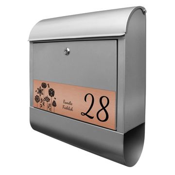 Der banjado Briefkasten mit dem Gravur Motiv Kräuterwiese bietet Ihnen mit seinem Fassungsvermögen genügend Platz auch für große A4 Sendungen. Die integrierte Zeitungsrolle eignet sich hervorragend, um unkompliziert die Tageszeitung zu fassen. Der Postkasten mit Motiv Kräuterwiese hat ein sehr ansprechendes und ausgefallenes Design, damit entlocken Sie Ihren Nachbarn und dem Postboten ein Lächeln. Heben Sie Sich von der tristen grauen Masse ab, ohne auf Funktionalität zu verzichten. Die Gravur Platte aus Acryl in Edelstahl, Gold oder Kupfer-Optik ist 33x10cm groß und schmückt die Vorderseite des Briefkastens. Das Material sieht Edelstahl, Gold und Kupfer zum Verwechseln ähnlich und ist ebenso witterungsbeständig wie dieser. Durch das Bearbeiten erscheint an den gravierten Stellen die schwarze Unterschicht und hebt so in einem guten Kontrast ihren Wunschtext, Ihre Hausnummer und das Gravur Motiv Kräuterwiese ab.