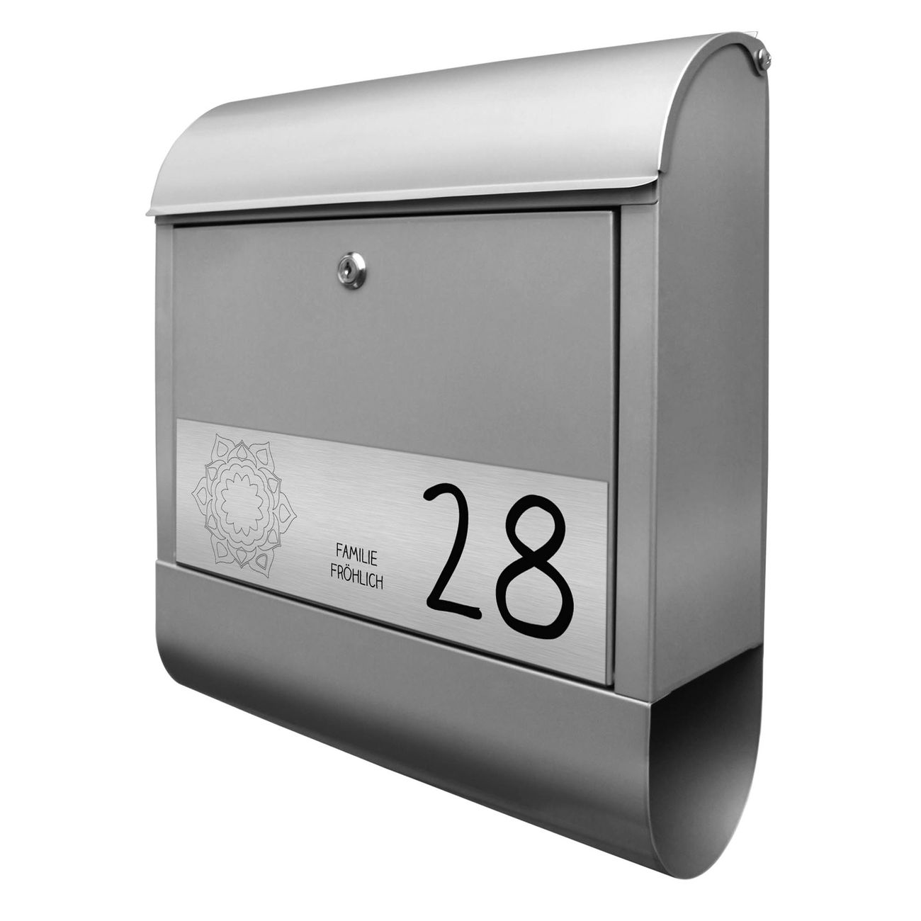 Der banjado Briefkasten mit dem Gravur Motiv Kreisornament bietet Ihnen mit seinem Fassungsvermögen genügend Platz auch für große A4 Sendungen. Die integrierte Zeitungsrolle eignet sich hervorragend, um unkompliziert die Tageszeitung zu fassen. Der Postkasten mit Motiv Kreisornament hat ein sehr ansprechendes und ausgefallenes Design, damit entlocken Sie Ihren Nachbarn und dem Postboten ein Lächeln. Heben Sie Sich von der tristen grauen Masse ab, ohne auf Funktionalität zu verzichten. Die Gravur Platte aus Acryl in Edelstahl, Gold oder Kupfer-Optik ist 33x10cm groß und schmückt die Vorderseite des Briefkastens. Das Material sieht Edelstahl, Gold und Kupfer zum Verwechseln ähnlich und ist ebenso witterungsbeständig wie dieser. Durch das Bearbeiten erscheint an den gravierten Stellen die schwarze Unterschicht und hebt so in einem guten Kontrast ihren Wunschtext, Ihre Hausnummer und das Gravur Motiv Kreisornament ab.