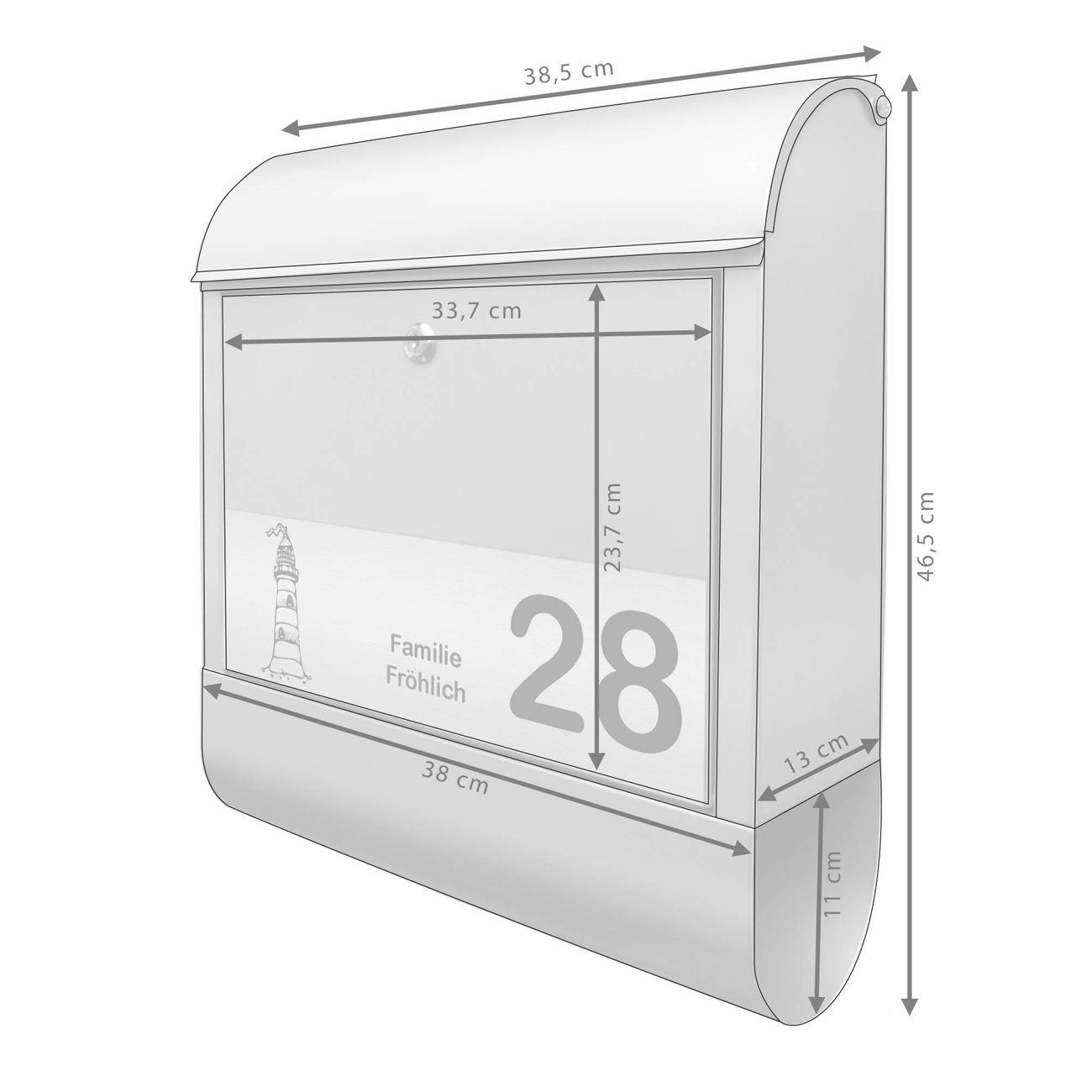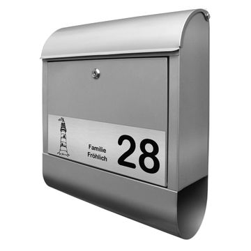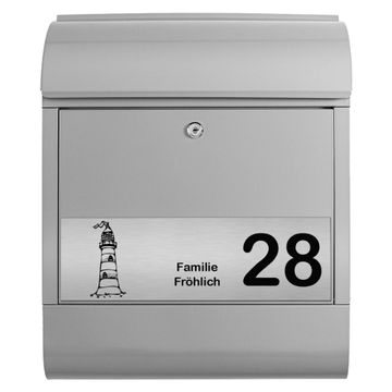 Der banjado Briefkasten mit dem Gravur Motiv Leuchtturm bietet Ihnen mit seinem Fassungsvermögen genügend Platz auch für große A4 Sendungen. Die integrierte Zeitungsrolle eignet sich hervorragend, um unkompliziert die Tageszeitung zu fassen. Der Postkasten mit Motiv Leuchtturm hat ein sehr ansprechendes und ausgefallenes Design, damit entlocken Sie Ihren Nachbarn und dem Postboten ein Lächeln. Heben Sie Sich von der tristen grauen Masse ab, ohne auf Funktionalität zu verzichten. Die Gravur Platte aus Acryl in Edelstahl, Gold oder Kupfer-Optik ist 33x10cm groß und schmückt die Vorderseite des Briefkastens. Das Material sieht Edelstahl, Gold und Kupfer zum Verwechseln ähnlich und ist ebenso witterungsbeständig wie dieser. Durch das Bearbeiten erscheint an den gravierten Stellen die schwarze Unterschicht und hebt so in einem guten Kontrast ihren Wunschtext, Ihre Hausnummer und das Gravur Motiv Leuchtturm ab.