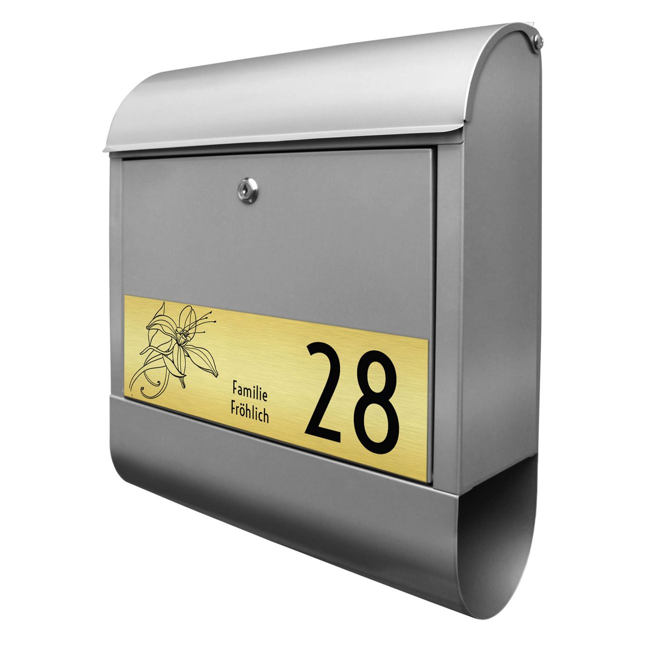 Der banjado Briefkasten mit dem Gravur Motiv Lilie bietet Ihnen mit seinem Fassungsvermögen genügend Platz auch für große A4 Sendungen. Die integrierte Zeitungsrolle eignet sich hervorragend, um unkompliziert die Tageszeitung zu fassen. Der Postkasten mit Motiv Lilie hat ein sehr ansprechendes und ausgefallenes Design, damit entlocken Sie Ihren Nachbarn und dem Postboten ein Lächeln. Heben Sie Sich von der tristen grauen Masse ab, ohne auf Funktionalität zu verzichten. Die Gravur Platte aus Acryl in Edelstahl, Gold oder Kupfer-Optik ist 33x10cm groß und schmückt die Vorderseite des Briefkastens. Das Material sieht Edelstahl, Gold und Kupfer zum Verwechseln ähnlich und ist ebenso witterungsbeständig wie dieser. Durch das Bearbeiten erscheint an den gravierten Stellen die schwarze Unterschicht und hebt so in einem guten Kontrast ihren Wunschtext, Ihre Hausnummer und das Gravur Motiv Lilie ab.