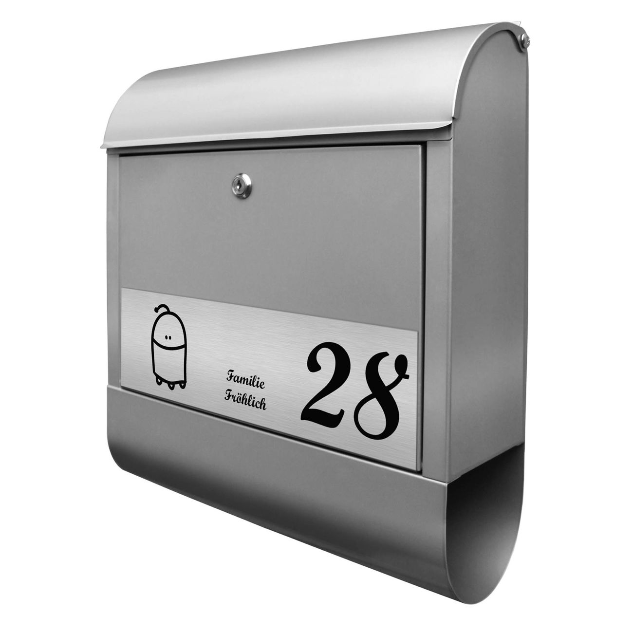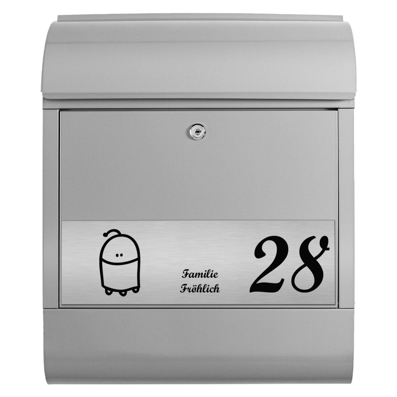 Der banjado Briefkasten mit dem Gravur Motiv Mr. Roboto bietet Ihnen mit seinem Fassungsvermögen genügend Platz auch für große A4 Sendungen. Die integrierte Zeitungsrolle eignet sich hervorragend, um unkompliziert die Tageszeitung zu fassen. Der Postkasten mit Motiv Mr. Roboto hat ein sehr ansprechendes und ausgefallenes Design, damit entlocken Sie Ihren Nachbarn und dem Postboten ein Lächeln. Heben Sie Sich von der tristen grauen Masse ab, ohne auf Funktionalität zu verzichten. Die Gravur Platte aus Acryl in Edelstahl, Gold oder Kupfer-Optik ist 33x10cm groß und schmückt die Vorderseite des Briefkastens. Das Material sieht Edelstahl, Gold und Kupfer zum Verwechseln ähnlich und ist ebenso witterungsbeständig wie dieser. Durch das Bearbeiten erscheint an den gravierten Stellen die schwarze Unterschicht und hebt so in einem guten Kontrast ihren Wunschtext, Ihre Hausnummer und das Gravur Motiv Mr. Roboto ab.