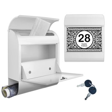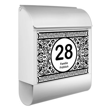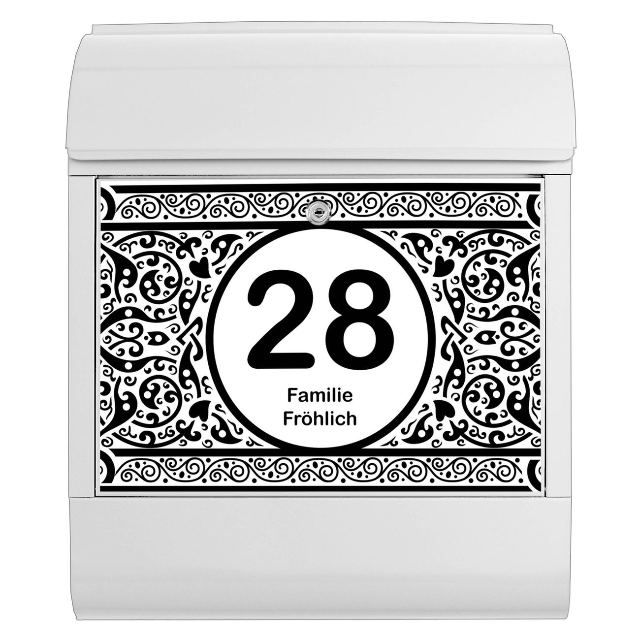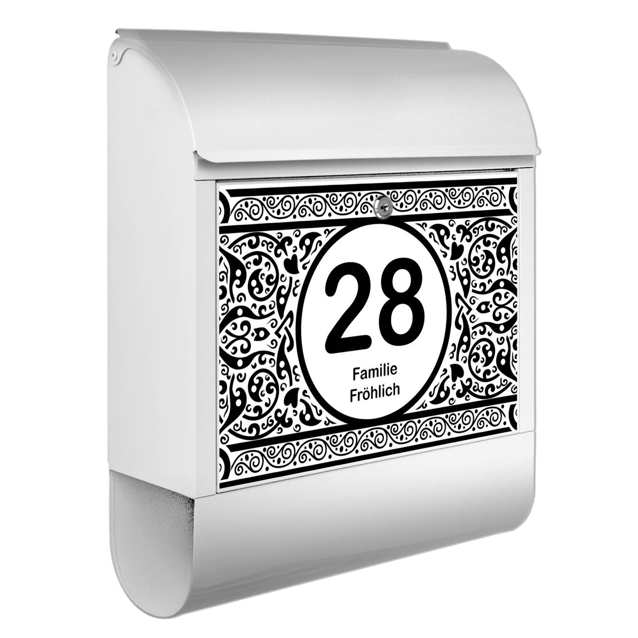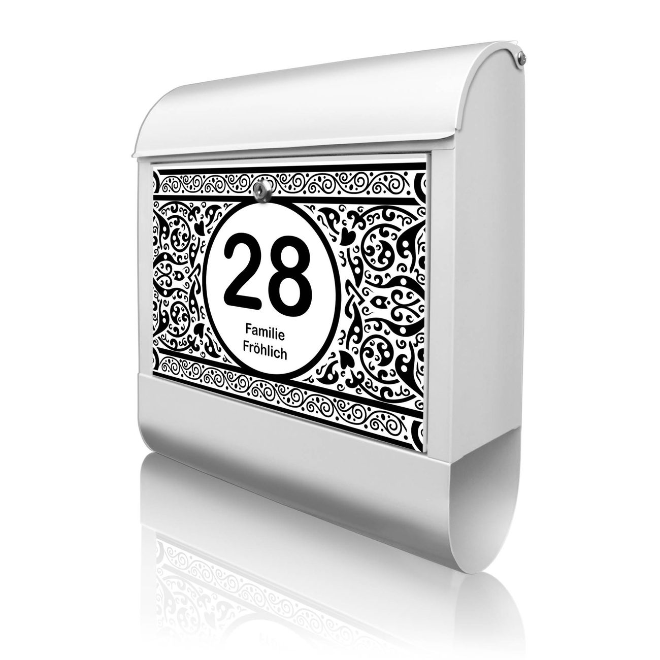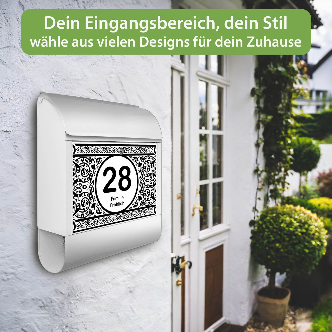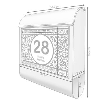 DESIGN: Der Postkasten mit Motiv Motiv Ornament SW hat ein sehr ansprechendes und ausgefallenes Design, damit entlocken Sie Ihren Nachbarn und dem Postboten ein Lächeln. Heben Sie Sich von der tristen grauen Masse ab, ohne auf Funktionalität zu verzichten. DETAILS: Der Postkasten besteht aus pulverbeschichtetem Stahl. Er ist 38x46x12,5cm groß. Das Motiv besteht aus einer wetter- und UV-resistenten Folie, die mit einem Schutzlaminat überzogen ist, sodass der Briefkasten zusätzlich vor Kratzern geschützt ist. Der Briefkasten wird mit Montagematerial, zusätzlich zwei Schlüssel sowie einer Bohrschablone geliefert. NUTZEN: Sie können diesen Briefkasten sowohl als Wandbriefkasten montieren oder einen passenden Ständer kaufen und als Standbriefkasten einbetonieren. Die Größe bietet genügend Platz für Sendungen aller Art, der Einwurf fasst auch größere A4 Sendungen. BANJADO: Ihr Briefkasten wird in Sachsen in einer kleinen Manufaktur von Hand veredelt. Die Motivfolie ist lösungsmittelfrei und schutzlaminiert für einen langen Halt. Wir legen großen Wert auf die Verbindung von Funktionalität und Design. Sie erhalten Handarbeit aus Sachsen.