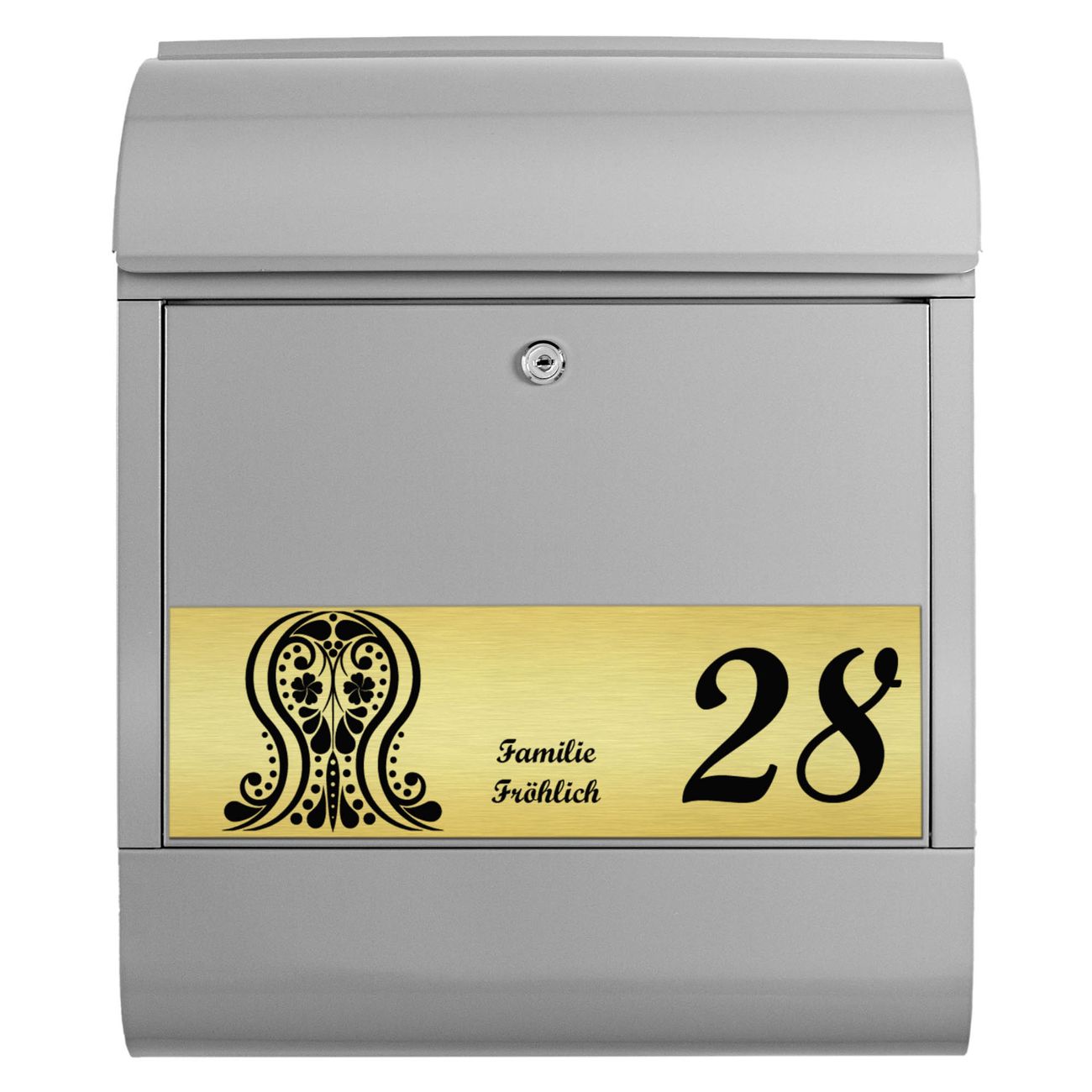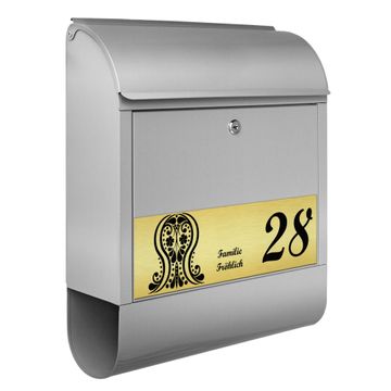 Der banjado Briefkasten mit dem Gravur Motiv Ornament bietet Ihnen mit seinem Fassungsvermögen genügend Platz auch für große A4 Sendungen. Die integrierte Zeitungsrolle eignet sich hervorragend, um unkompliziert die Tageszeitung zu fassen. Der Postkasten mit Motiv Ornament hat ein sehr ansprechendes und ausgefallenes Design, damit entlocken Sie Ihren Nachbarn und dem Postboten ein Lächeln. Heben Sie Sich von der tristen grauen Masse ab, ohne auf Funktionalität zu verzichten. Die Gravur Platte aus Acryl in Edelstahl, Gold oder Kupfer-Optik ist 33x10cm groß und schmückt die Vorderseite des Briefkastens. Das Material sieht Edelstahl, Gold und Kupfer zum Verwechseln ähnlich und ist ebenso witterungsbeständig wie dieser. Durch das Bearbeiten erscheint an den gravierten Stellen die schwarze Unterschicht und hebt so in einem guten Kontrast ihren Wunschtext, Ihre Hausnummer und das Gravur Motiv Ornament ab.