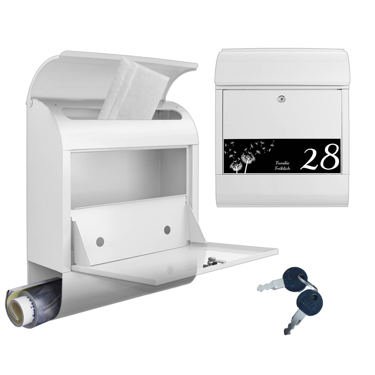 DESIGN: Der Postkasten mit Motiv Motiv Pusteblume SW kompakt hat ein sehr ansprechendes und ausgefallenes Design, damit entlocken Sie Ihren Nachbarn und dem Postboten ein Lächeln. Heben Sie Sich von der tristen grauen Masse ab, ohne auf Funktionalität zu verzichten. DETAILS: Der Postkasten besteht aus pulverbeschichtetem Stahl. Er ist 38x46x12,5cm groß. Das Motiv besteht aus einer wetter- und UV-resistenten Folie, die mit einem Schutzlaminat überzogen ist, sodass der Briefkasten zusätzlich vor Kratzern geschützt ist. Der Briefkasten wird mit Montagematerial, zusätzlich zwei Schlüssel sowie einer Bohrschablone geliefert. NUTZEN: Sie können diesen Briefkasten sowohl als Wandbriefkasten montieren oder einen passenden Ständer kaufen und als Standbriefkasten einbetonieren. Die Größe bietet genügend Platz für Sendungen aller Art, der Einwurf fasst auch größere A4 Sendungen. BANJADO: Ihr Briefkasten wird in Sachsen in einer kleinen Manufaktur von Hand veredelt. Die Motivfolie ist lösungsmittelfrei und schutzlaminiert für einen langen Halt. Wir legen großen Wert auf die Verbindung von Funktionalität und Design. Sie erhalten Handarbeit aus Sachsen.