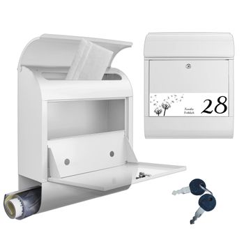 DESIGN: Der Postkasten mit Motiv Motiv Pusteblume WS kompakt hat ein sehr ansprechendes und ausgefallenes Design, damit entlocken Sie Ihren Nachbarn und dem Postboten ein Lächeln. Heben Sie Sich von der tristen grauen Masse ab, ohne auf Funktionalität zu verzichten. DETAILS: Der Postkasten besteht aus pulverbeschichtetem Stahl. Er ist 38x46x12,5cm groß. Das Motiv besteht aus einer wetter- und UV-resistenten Folie, die mit einem Schutzlaminat überzogen ist, sodass der Briefkasten zusätzlich vor Kratzern geschützt ist. Der Briefkasten wird mit Montagematerial, zusätzlich zwei Schlüssel sowie einer Bohrschablone geliefert. NUTZEN: Sie können diesen Briefkasten sowohl als Wandbriefkasten montieren oder einen passenden Ständer kaufen und als Standbriefkasten einbetonieren. Die Größe bietet genügend Platz für Sendungen aller Art, der Einwurf fasst auch größere A4 Sendungen. BANJADO: Ihr Briefkasten wird in Sachsen in einer kleinen Manufaktur von Hand veredelt. Die Motivfolie ist lösungsmittelfrei und schutzlaminiert für einen langen Halt. Wir legen großen Wert auf die Verbindung von Funktionalität und Design. Sie erhalten Handarbeit aus Sachsen.