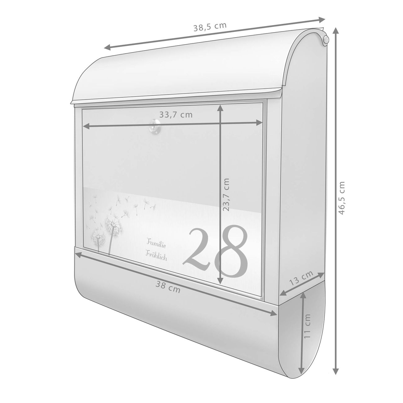 Der banjado Briefkasten mit dem Gravur Motiv Pusteblume bietet Ihnen mit seinem Fassungsvermögen genügend Platz auch für große A4 Sendungen. Die integrierte Zeitungsrolle eignet sich hervorragend, um unkompliziert die Tageszeitung zu fassen. Der Postkasten mit Motiv Pusteblume hat ein sehr ansprechendes und ausgefallenes Design, damit entlocken Sie Ihren Nachbarn und dem Postboten ein Lächeln. Heben Sie Sich von der tristen grauen Masse ab, ohne auf Funktionalität zu verzichten. Die Gravur Platte aus Acryl in Edelstahl, Gold oder Kupfer-Optik ist 33x10cm groß und schmückt die Vorderseite des Briefkastens. Das Material sieht Edelstahl, Gold und Kupfer zum Verwechseln ähnlich und ist ebenso witterungsbeständig wie dieser. Durch das Bearbeiten erscheint an den gravierten Stellen die schwarze Unterschicht und hebt so in einem guten Kontrast ihren Wunschtext, Ihre Hausnummer und das Gravur Motiv Pusteblume ab.