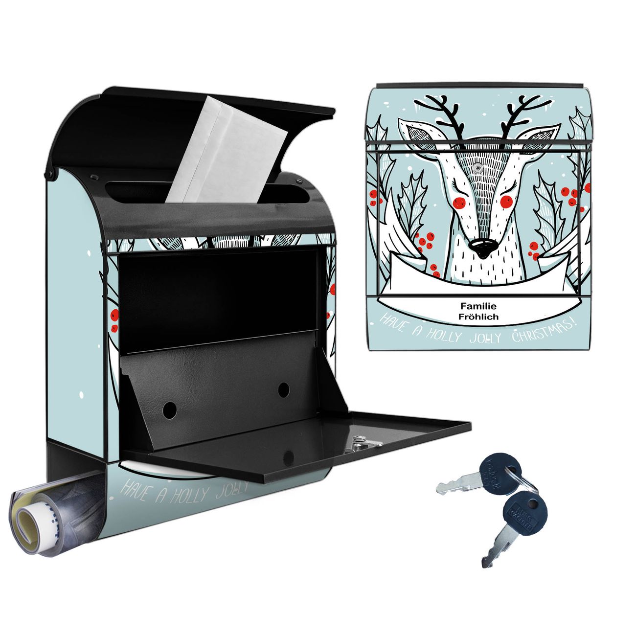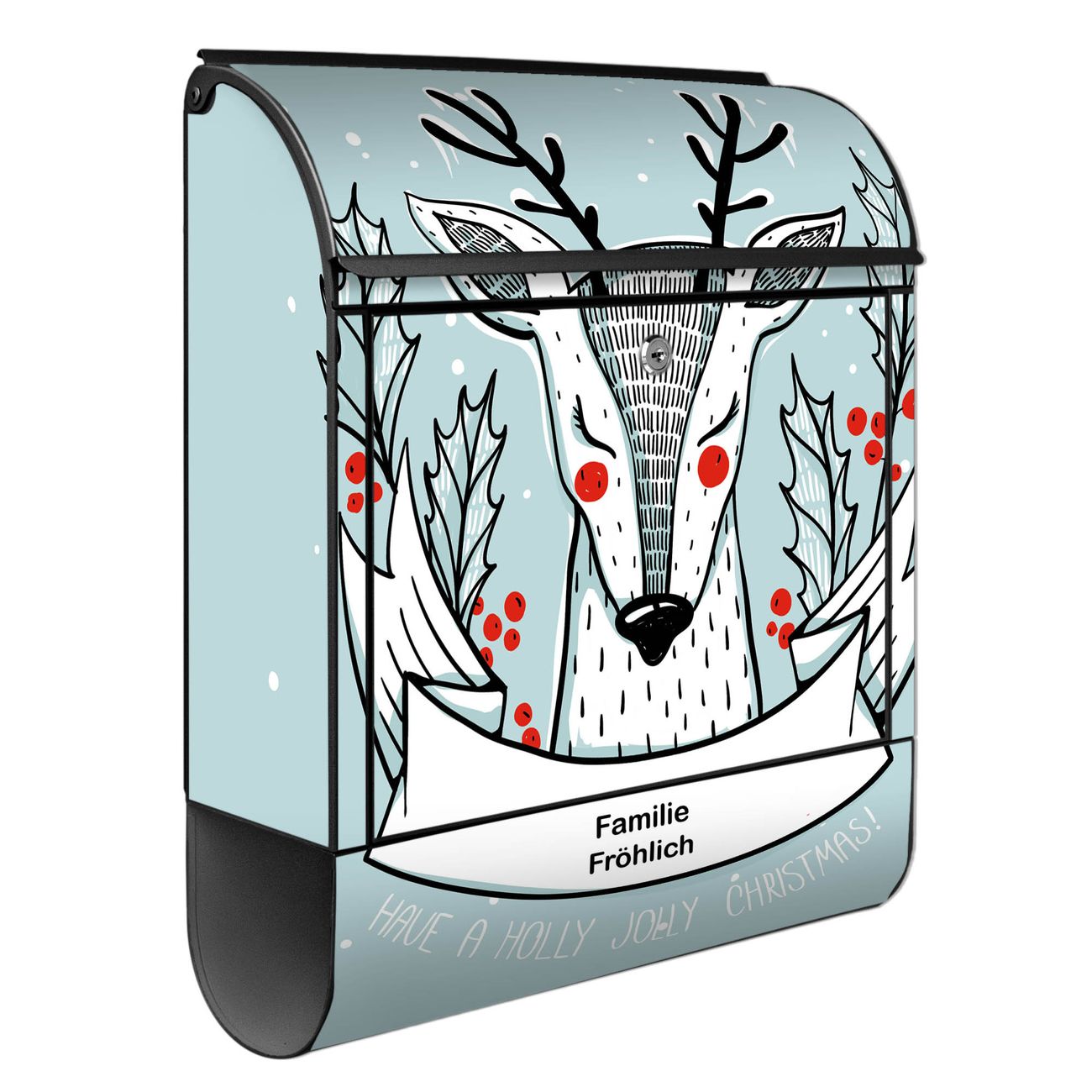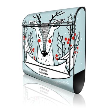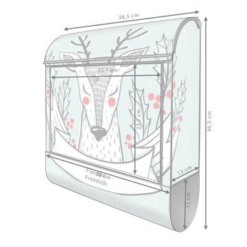 DESIGN: Der Postkasten mit Motiv Motiv Rentier hat ein sehr ansprechendes und ausgefallenes Design, damit entlocken Sie Ihren Nachbarn und dem Postboten ein Lächeln. Heben Sie Sich von der tristen grauen Masse ab, ohne auf Funktionalität zu verzichten. DETAILS: Der Postkasten besteht aus pulverbeschichtetem Stahl. Er ist 38x46x12,5cm groß. Das Motiv besteht aus einer wetter- und UV-resistenten Folie, die mit einem Schutzlaminat überzogen ist, sodass der Briefkasten zusätzlich vor Kratzern geschützt ist. Der Briefkasten wird mit Montagematerial, zusätzlich zwei Schlüssel sowie einer Bohrschablone geliefert. NUTZEN: Sie können diesen Briefkasten sowohl als Wandbriefkasten montieren oder einen passenden Ständer kaufen und als Standbriefkasten einbetonieren. Die Größe bietet genügend Platz für Sendungen aller Art, der Einwurf fasst auch größere A4 Sendungen. BANJADO: Ihr Briefkasten wird in Sachsen in einer kleinen Manufaktur von Hand veredelt. Die Motivfolie ist lösungsmittelfrei und schutzlaminiert für einen langen Halt. Wir legen großen Wert auf die Verbindung von Funktionalität und Design. Sie erhalten Handarbeit aus Sachsen.