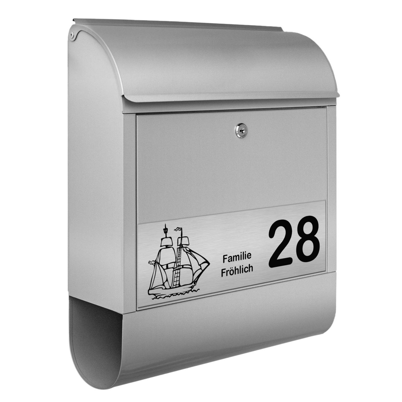 Der banjado Briefkasten mit dem Gravur Motiv Schiff bietet Ihnen mit seinem Fassungsvermögen genügend Platz auch für große A4 Sendungen. Die integrierte Zeitungsrolle eignet sich hervorragend, um unkompliziert die Tageszeitung zu fassen. Der Postkasten mit Motiv Schiff hat ein sehr ansprechendes und ausgefallenes Design, damit entlocken Sie Ihren Nachbarn und dem Postboten ein Lächeln. Heben Sie Sich von der tristen grauen Masse ab, ohne auf Funktionalität zu verzichten. Die Gravur Platte aus Acryl in Edelstahl, Gold oder Kupfer-Optik ist 33x10cm groß und schmückt die Vorderseite des Briefkastens. Das Material sieht Edelstahl, Gold und Kupfer zum Verwechseln ähnlich und ist ebenso witterungsbeständig wie dieser. Durch das Bearbeiten erscheint an den gravierten Stellen die schwarze Unterschicht und hebt so in einem guten Kontrast ihren Wunschtext, Ihre Hausnummer und das Gravur Motiv Schiff ab.