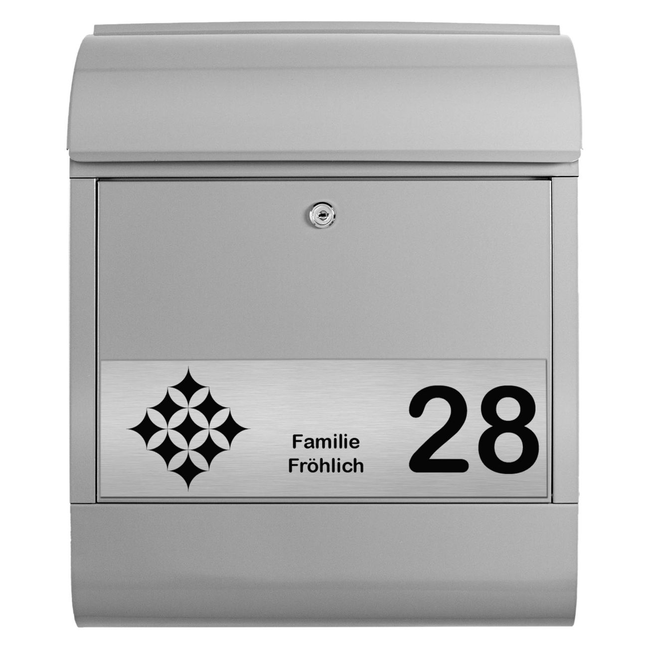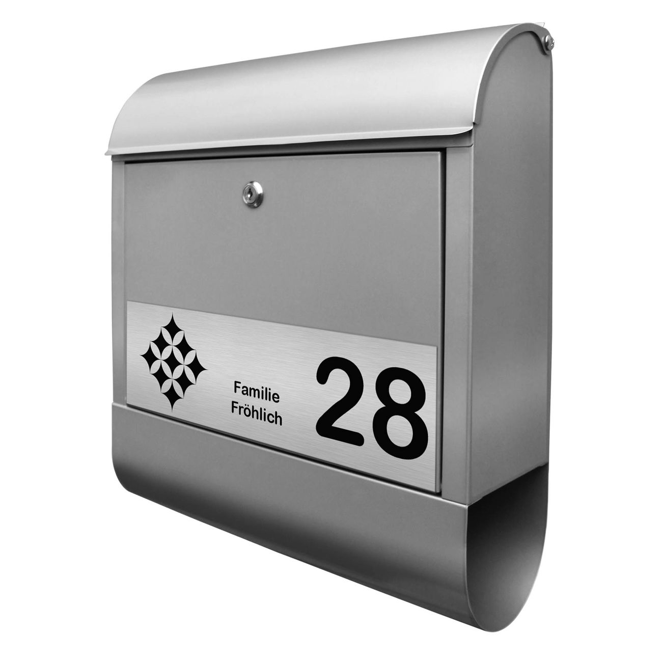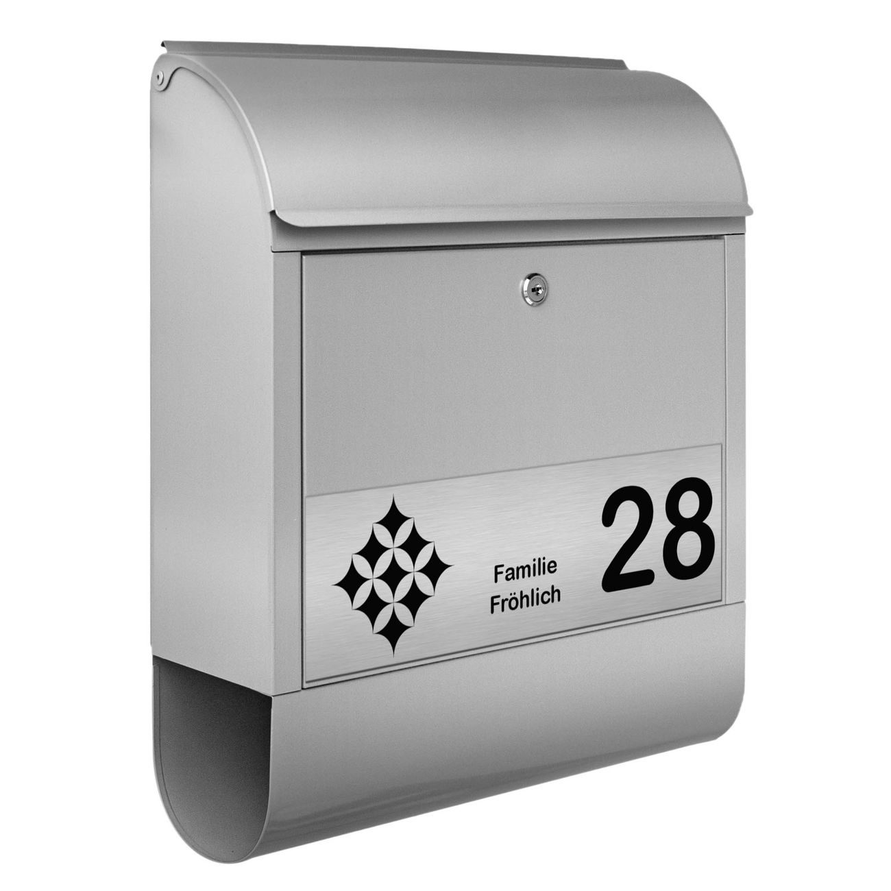 Der Postkasten besteht aus pulverbeschichtetem Stahl. Er ist 38x47x13cm groß. Die Gravur Platte besteht aus einem Laminat auf Acrylbasis mit authentisch metallischem Erscheinungsbild und ist wetter- sowie UV-resistent. Diese wir bereits von uns fest mit dem Briefkasten verklebt. Der Briefkasten wird mit Montagematerial, zwei Schlüsseln sowie einer Bohrschablone geliefert. Sie können diesen Briefkasten sowohl als Wandbriefkasten montieren oder einen passenden Briefkastenstandfuß kaufen und als Standbriefkasten einbetonieren. Auch für die Montage an einem Zaun bieten wir das passende Zubehör an. Die Größe bietet genügend Platz für Sendungen aller Art, der Einwurf fasst auch größere A4 Sendungen.