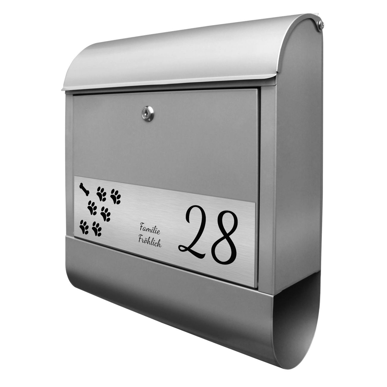 Der banjado Briefkasten mit dem Gravur Motiv Tatzen bietet Ihnen mit seinem Fassungsvermögen genügend Platz auch für große A4 Sendungen. Die integrierte Zeitungsrolle eignet sich hervorragend, um unkompliziert die Tageszeitung zu fassen. Der Postkasten mit Motiv Tatzen hat ein sehr ansprechendes und ausgefallenes Design, damit entlocken Sie Ihren Nachbarn und dem Postboten ein Lächeln. Heben Sie Sich von der tristen grauen Masse ab, ohne auf Funktionalität zu verzichten. Die Gravur Platte aus Acryl in Edelstahl, Gold oder Kupfer-Optik ist 33x10cm groß und schmückt die Vorderseite des Briefkastens. Das Material sieht Edelstahl, Gold und Kupfer zum Verwechseln ähnlich und ist ebenso witterungsbeständig wie dieser. Durch das Bearbeiten erscheint an den gravierten Stellen die schwarze Unterschicht und hebt so in einem guten Kontrast ihren Wunschtext, Ihre Hausnummer und das Gravur Motiv Tatzen ab.
