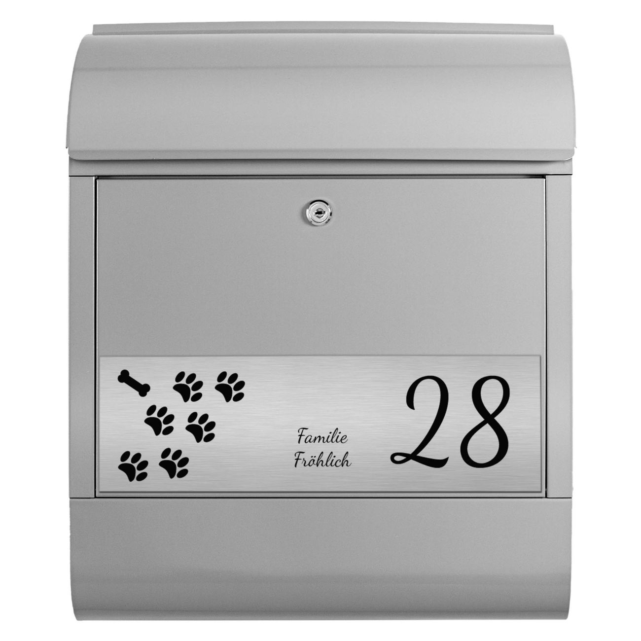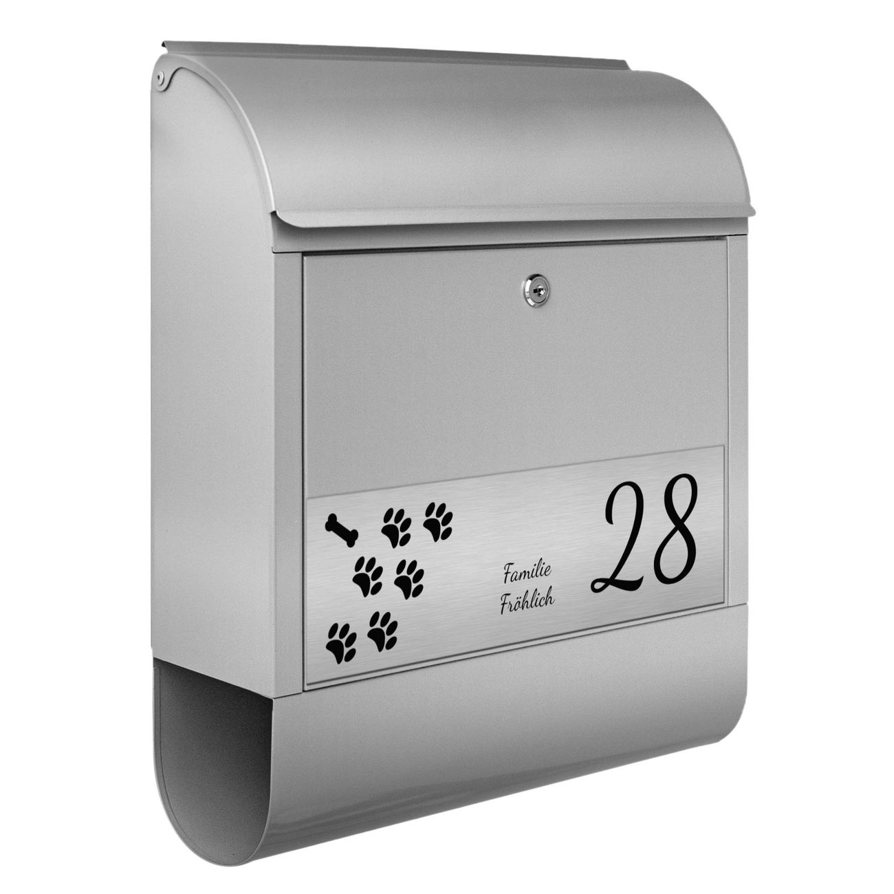 Der Postkasten besteht aus pulverbeschichtetem Stahl. Er ist 38x47x13cm groß. Die Gravur Platte besteht aus einem Laminat auf Acrylbasis mit authentisch metallischem Erscheinungsbild und ist wetter- sowie UV-resistent. Diese wir bereits von uns fest mit dem Briefkasten verklebt. Der Briefkasten wird mit Montagematerial, zwei Schlüsseln sowie einer Bohrschablone geliefert. Sie können diesen Briefkasten sowohl als Wandbriefkasten montieren oder einen passenden Briefkastenstandfuß kaufen und als Standbriefkasten einbetonieren. Auch für die Montage an einem Zaun bieten wir das passende Zubehör an. Die Größe bietet genügend Platz für Sendungen aller Art, der Einwurf fasst auch größere A4 Sendungen.