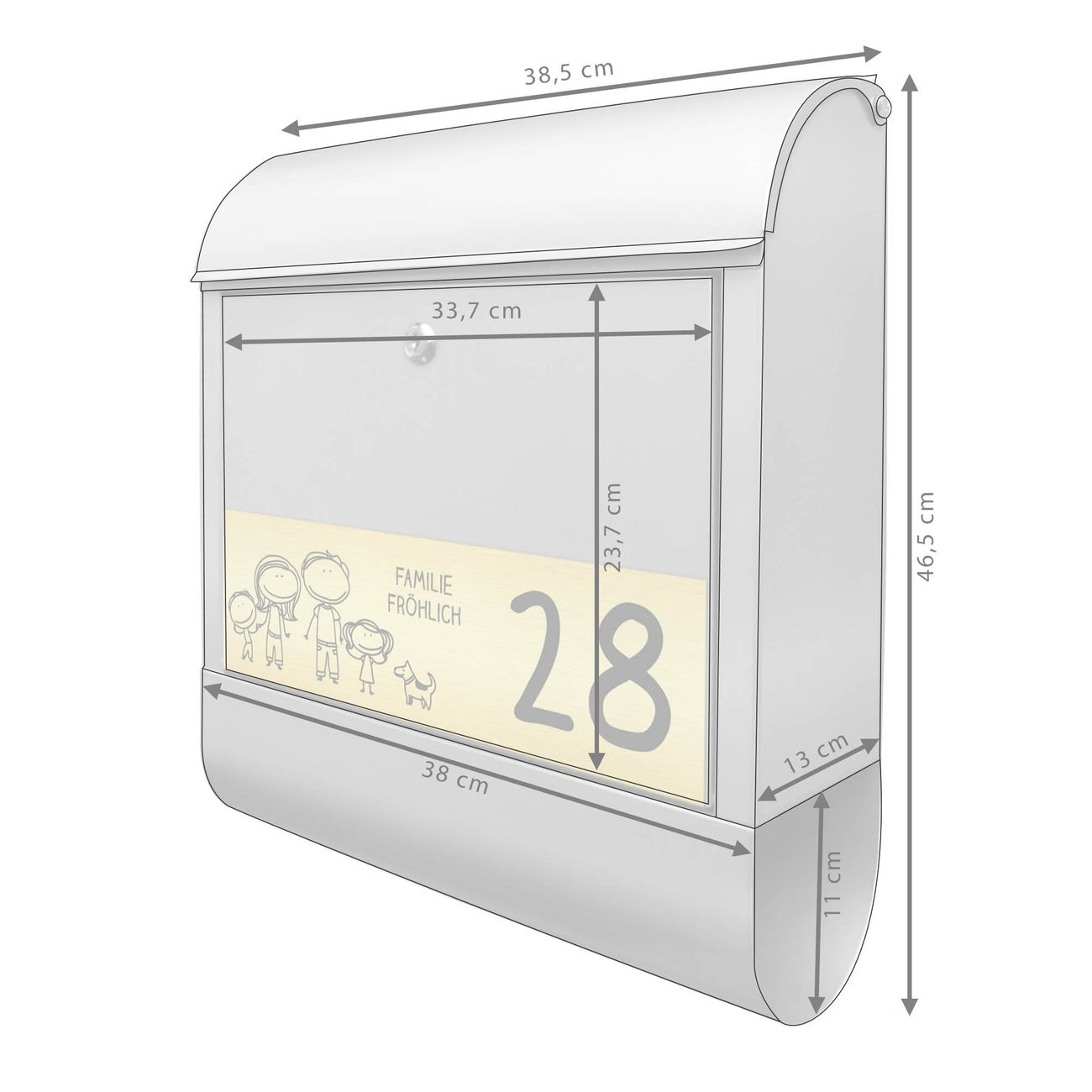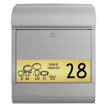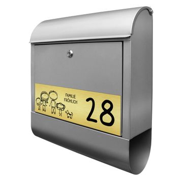 Der banjado Briefkasten mit dem Gravur Motiv Vater, Mutter, Junge, Mädchen, Hund bietet Ihnen mit seinem Fassungsvermögen genügend Platz auch für große A4 Sendungen. Die integrierte Zeitungsrolle eignet sich hervorragend, um unkompliziert die Tageszeitung zu fassen. Der Postkasten mit Motiv Vater, Mutter, Junge, Mädchen, Hund hat ein sehr ansprechendes und ausgefallenes Design, damit entlocken Sie Ihren Nachbarn und dem Postboten ein Lächeln. Heben Sie Sich von der tristen grauen Masse ab, ohne auf Funktionalität zu verzichten. Die Gravur Platte aus Acryl in Edelstahl, Gold oder Kupfer-Optik ist 33x10cm groß und schmückt die Vorderseite des Briefkastens. Das Material sieht Edelstahl, Gold und Kupfer zum Verwechseln ähnlich und ist ebenso witterungsbeständig wie dieser. Durch das Bearbeiten erscheint an den gravierten Stellen die schwarze Unterschicht und hebt so in einem guten Kontrast ihren Wunschtext, Ihre Hausnummer und das Gravur Motiv Vater, Mutter, Junge, Mädchen, Hund ab.