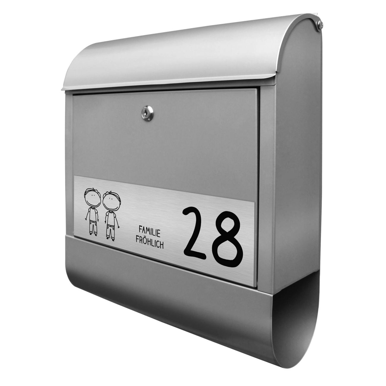 Der Postkasten besteht aus pulverbeschichtetem Stahl. Er ist 38x47x13cm groß. Die Gravur Platte besteht aus einem Laminat auf Acrylbasis mit authentisch metallischem Erscheinungsbild und ist wetter- sowie UV-resistent. Diese wir bereits von uns fest mit dem Briefkasten verklebt. Der Briefkasten wird mit Montagematerial, zwei Schlüsseln sowie einer Bohrschablone geliefert. Sie können diesen Briefkasten sowohl als Wandbriefkasten montieren oder einen passenden Briefkastenstandfuß kaufen und als Standbriefkasten einbetonieren. Auch für die Montage an einem Zaun bieten wir das passende Zubehör an. Die Größe bietet genügend Platz für Sendungen aller Art, der Einwurf fasst auch größere A4 Sendungen.