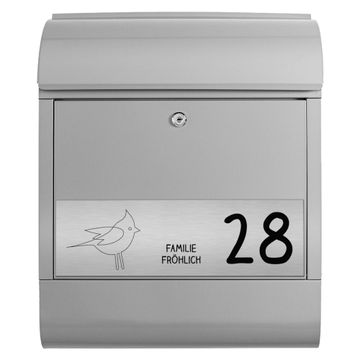 Der banjado Briefkasten mit dem Gravur Motiv Vogel bietet Ihnen mit seinem Fassungsvermögen genügend Platz auch für große A4 Sendungen. Die integrierte Zeitungsrolle eignet sich hervorragend, um unkompliziert die Tageszeitung zu fassen. Der Postkasten mit Motiv Vogel hat ein sehr ansprechendes und ausgefallenes Design, damit entlocken Sie Ihren Nachbarn und dem Postboten ein Lächeln. Heben Sie Sich von der tristen grauen Masse ab, ohne auf Funktionalität zu verzichten. Die Gravur Platte aus Acryl in Edelstahl, Gold oder Kupfer-Optik ist 33x10cm groß und schmückt die Vorderseite des Briefkastens. Das Material sieht Edelstahl, Gold und Kupfer zum Verwechseln ähnlich und ist ebenso witterungsbeständig wie dieser. Durch das Bearbeiten erscheint an den gravierten Stellen die schwarze Unterschicht und hebt so in einem guten Kontrast ihren Wunschtext, Ihre Hausnummer und das Gravur Motiv Vogel ab.