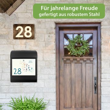 DESIGN: Der Postkasten mit Motiv Motiv Vogelschwarm Bunt hat ein sehr ansprechendes und ausgefallenes Design, damit entlocken Sie Ihren Nachbarn und dem Postboten ein Lächeln. Heben Sie Sich von der tristen grauen Masse ab, ohne auf Funktionalität zu verzichten. DETAILS: Der Postkasten besteht aus pulverbeschichtetem Stahl. Er ist 38x46x12,5cm groß. Das Motiv besteht aus einer wetter- und UV-resistenten Folie, die mit einem Schutzlaminat überzogen ist, sodass der Briefkasten zusätzlich vor Kratzern geschützt ist. Der Briefkasten wird mit Montagematerial, zusätzlich zwei Schlüssel sowie einer Bohrschablone geliefert. NUTZEN: Sie können diesen Briefkasten sowohl als Wandbriefkasten montieren oder einen passenden Ständer kaufen und als Standbriefkasten einbetonieren. Die Größe bietet genügend Platz für Sendungen aller Art, der Einwurf fasst auch größere A4 Sendungen. BANJADO: Ihr Briefkasten wird in Sachsen in einer kleinen Manufaktur von Hand veredelt. Die Motivfolie ist lösungsmittelfrei und schutzlaminiert für einen langen Halt. Wir legen großen Wert auf die Verbindung von Funktionalität und Design. Sie erhalten Handarbeit aus Sachsen.
