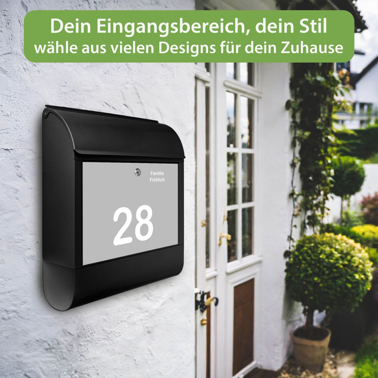 DESIGN: Der Postkasten mit Motiv Motiv Weiß auf Grau hat ein sehr ansprechendes und ausgefallenes Design, damit entlocken Sie Ihren Nachbarn und dem Postboten ein Lächeln. Heben Sie Sich von der tristen grauen Masse ab, ohne auf Funktionalität zu verzichten. DETAILS: Der Postkasten besteht aus pulverbeschichtetem Stahl. Er ist 38x46x12,5cm groß. Das Motiv besteht aus einer wetter- und UV-resistenten Folie, die mit einem Schutzlaminat überzogen ist, sodass der Briefkasten zusätzlich vor Kratzern geschützt ist. Der Briefkasten wird mit Montagematerial, zusätzlich zwei Schlüssel sowie einer Bohrschablone geliefert. NUTZEN: Sie können diesen Briefkasten sowohl als Wandbriefkasten montieren oder einen passenden Ständer kaufen und als Standbriefkasten einbetonieren. Die Größe bietet genügend Platz für Sendungen aller Art, der Einwurf fasst auch größere A4 Sendungen. BANJADO: Ihr Briefkasten wird in Sachsen in einer kleinen Manufaktur von Hand veredelt. Die Motivfolie ist lösungsmittelfrei und schutzlaminiert für einen langen Halt. Wir legen großen Wert auf die Verbindung von Funktionalität und Design. Sie erhalten Handarbeit aus Sachsen.
