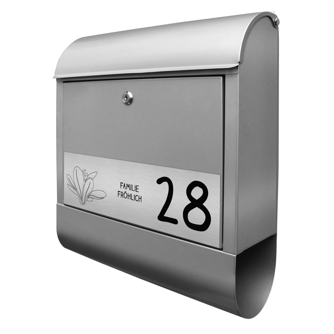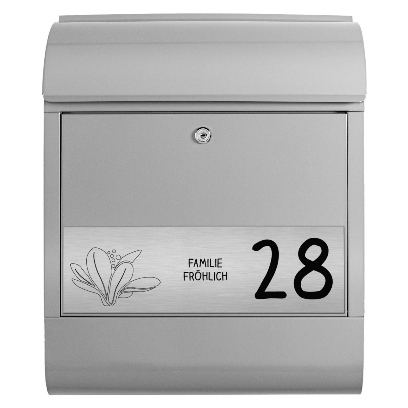 Der banjado Briefkasten mit dem Gravur Motiv WT Magnolien bietet Ihnen mit seinem Fassungsvermögen genügend Platz auch für große A4 Sendungen. Die integrierte Zeitungsrolle eignet sich hervorragend, um unkompliziert die Tageszeitung zu fassen. Der Postkasten mit Motiv WT Magnolien hat ein sehr ansprechendes und ausgefallenes Design, damit entlocken Sie Ihren Nachbarn und dem Postboten ein Lächeln. Heben Sie Sich von der tristen grauen Masse ab, ohne auf Funktionalität zu verzichten. Die Gravur Platte aus Acryl in Edelstahl, Gold oder Kupfer-Optik ist 33x10cm groß und schmückt die Vorderseite des Briefkastens. Das Material sieht Edelstahl, Gold und Kupfer zum Verwechseln ähnlich und ist ebenso witterungsbeständig wie dieser. Durch das Bearbeiten erscheint an den gravierten Stellen die schwarze Unterschicht und hebt so in einem guten Kontrast ihren Wunschtext, Ihre Hausnummer und das Gravur Motiv WT Magnolien ab.