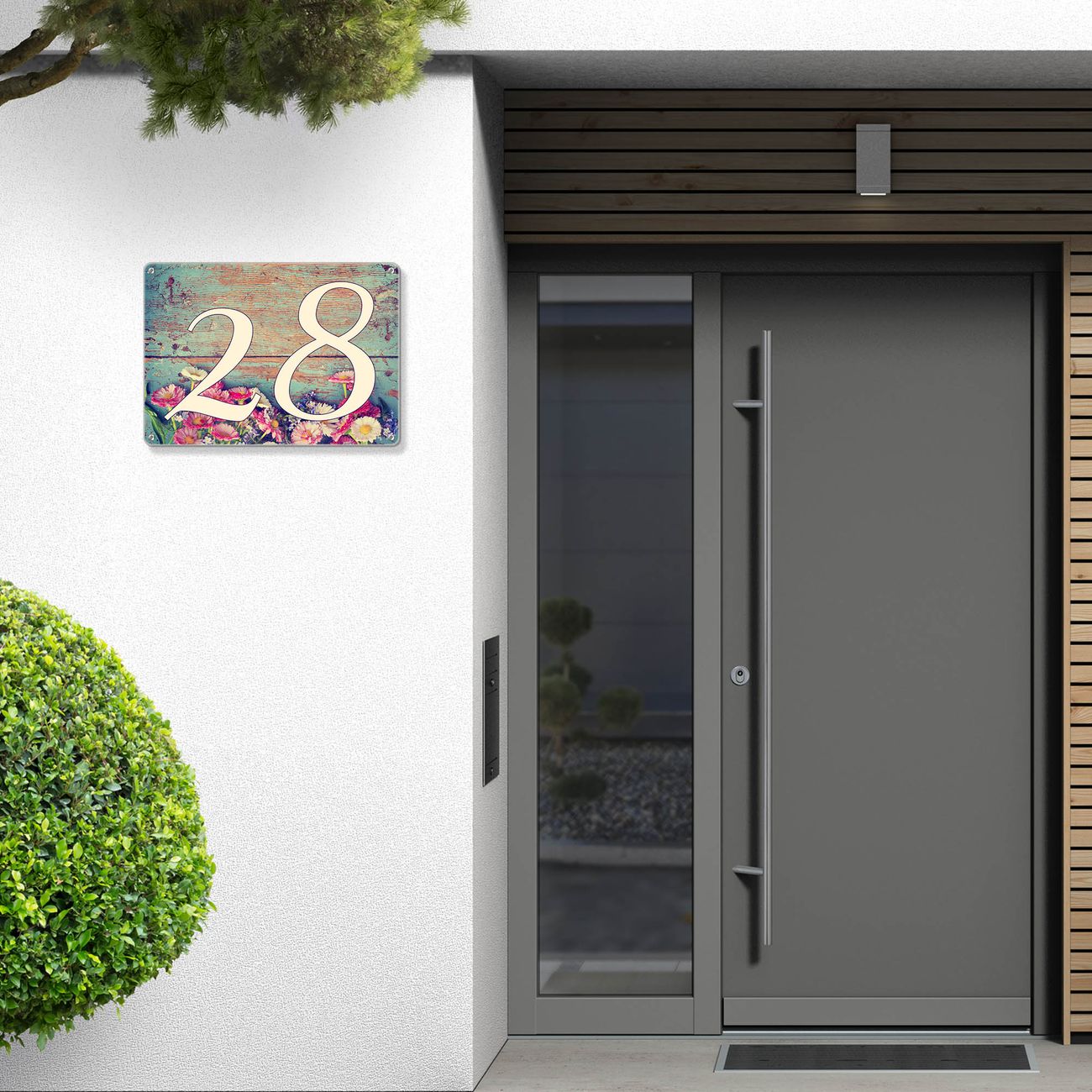 Das banjado Hausnummer Schild ist mit 4 Schrauben einfach am Haus anzubringen und zeigt dank der Größe stilsicher Ihre Hausnummer oder auch individuell Hausnummer mit Straßennamen. Das Hausschild personalisiert können Sie ganz auf Ihre Wünsche anpassen. Wir bieten verschiedenste Motive an. Dazu können Sie das Schild mit Ihrer Hausnummer anpassen.