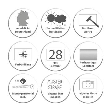 Das banjado Hausnummer Schild ist mit 4 Schrauben einfach am Haus anzubringen und zeigt dank der Größe stilsicher Ihre Hausnummer oder auch individuell Hausnummer mit Straßennamen. Das Hausschild personalisiert können Sie ganz auf Ihre Wünsche anpassen. Wir bieten verschiedenste Motive an. Dazu können Sie das Schild mit Ihrer Hausnummer anpassen.
