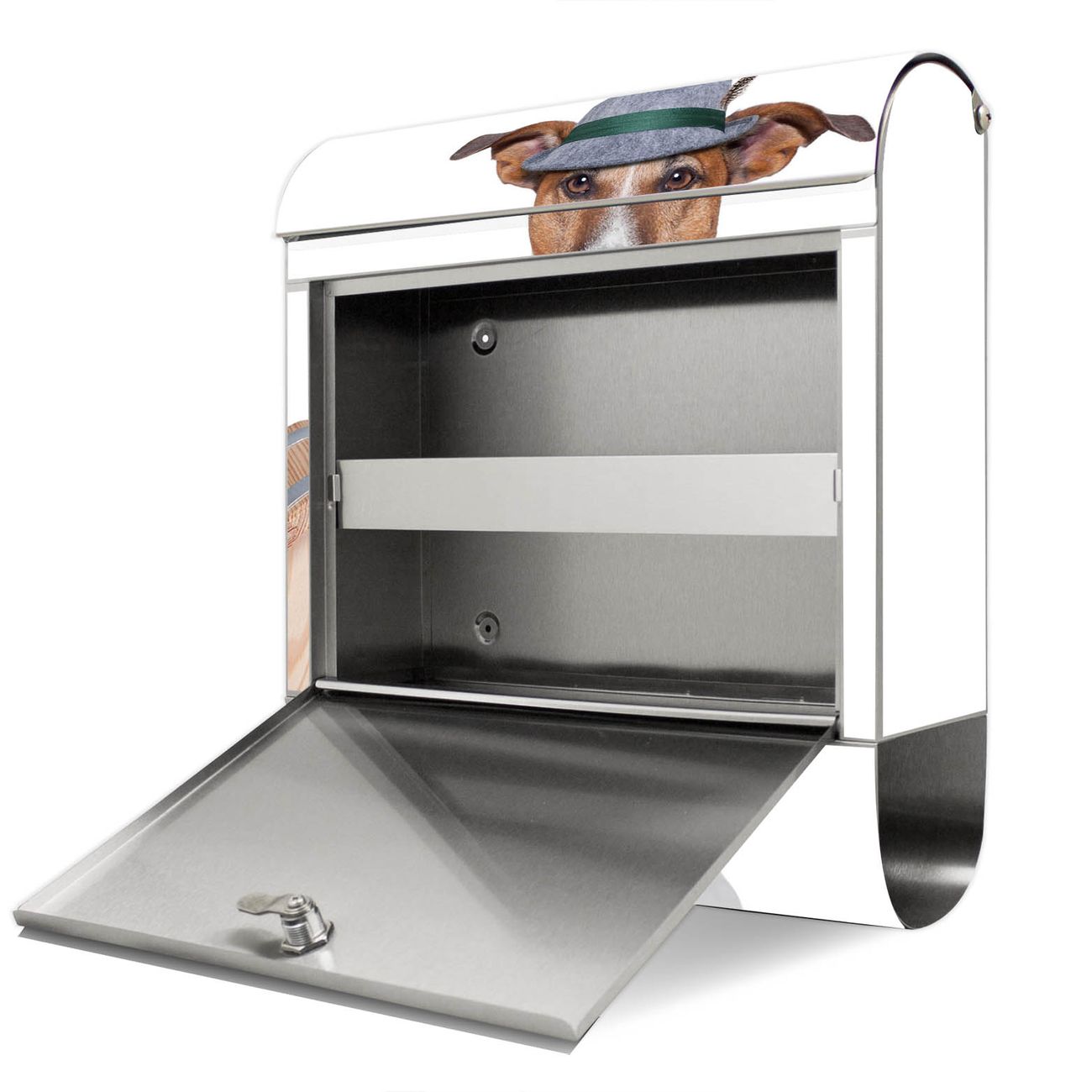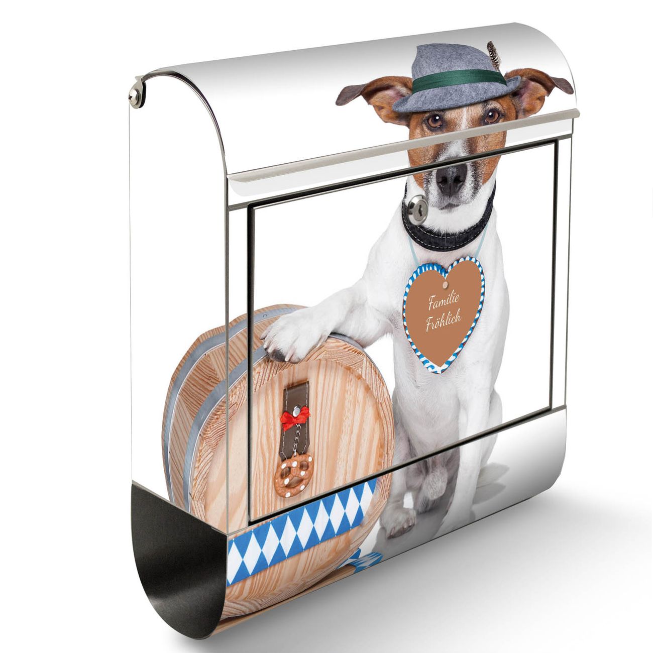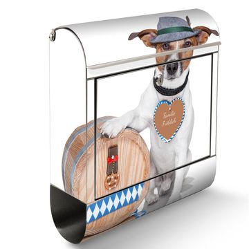 Der banjado Edelstahl Standbriefkasten mit Motiv Bayer Jack Russel und eigenem Wunschtext bietet Ihnen mit seinem Fassungsvermögen genügend Platz auch für große A4 Sendungen. Das integrierte Zeitungsfach eignet sich hervorragend, um unkompliziert die Tageszeitung zu fassen.