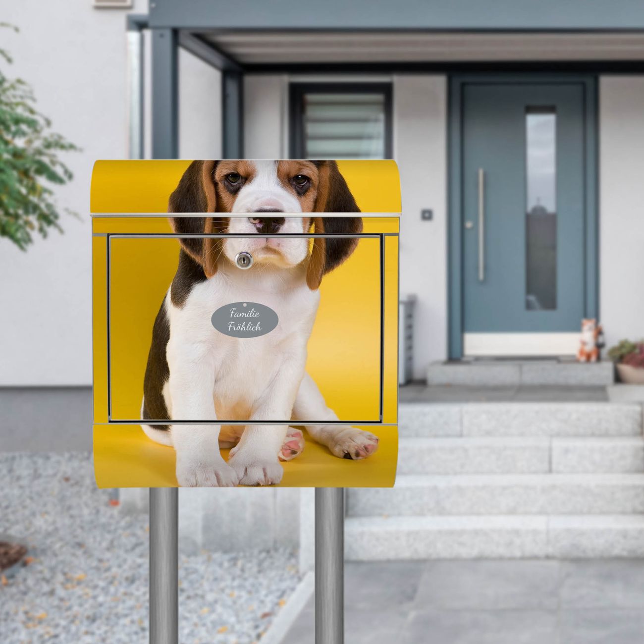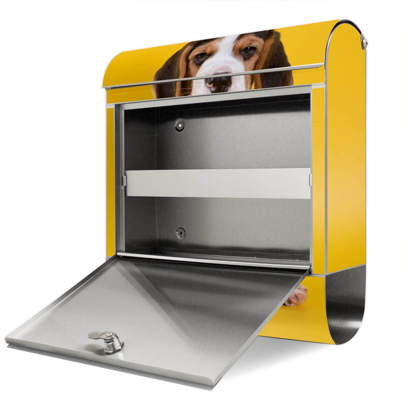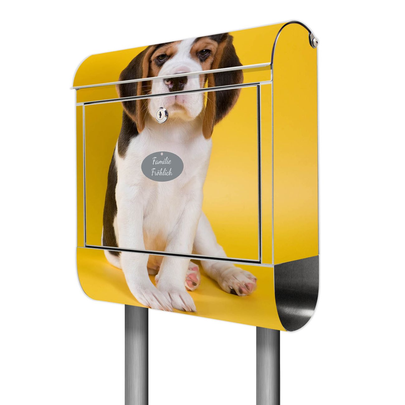 Der Motivstandbriefkasten hat ein sehr ansprechendes und ausgefallenes Design, damit entlocken Sie Ihren Nachbarn und dem Postboten ein Lächeln. Heben Sie Sich ab von der tristen grauen Masse, ohne auf Funktionalität zu verzichten. Der Briefkasten besteht aus hochwertigem 18/0 Edelstahl und die Wetter- und UV-resistenten Folie mit Beagle Motiv ist zusätzlich mit einem Schutzlaminat überzogen. Der Standbriefkasten wird mit Montagematerial und zwei Schlüsseln geliefert.