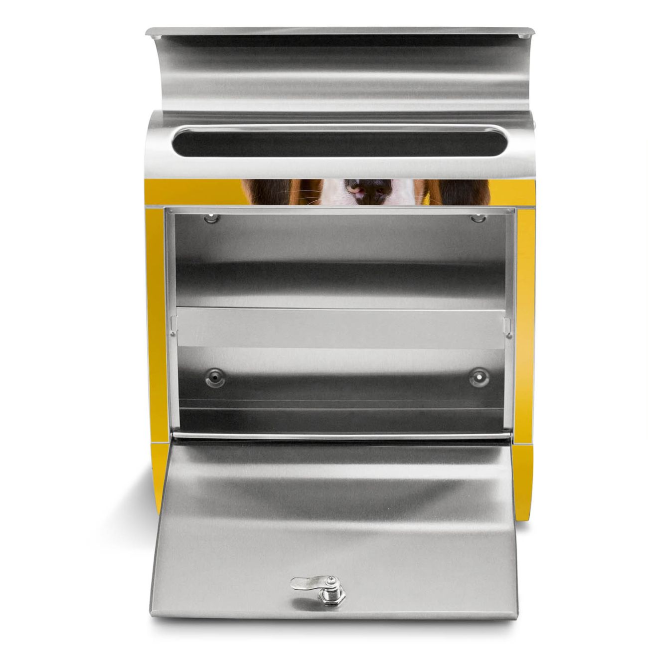 Der banjado Edelstahl Standbriefkasten mit Motiv Beagle und eigenem Wunschtext bietet Ihnen mit seinem Fassungsvermögen genügend Platz auch für große A4 Sendungen. Das integrierte Zeitungsfach eignet sich hervorragend, um unkompliziert die Tageszeitung zu fassen.