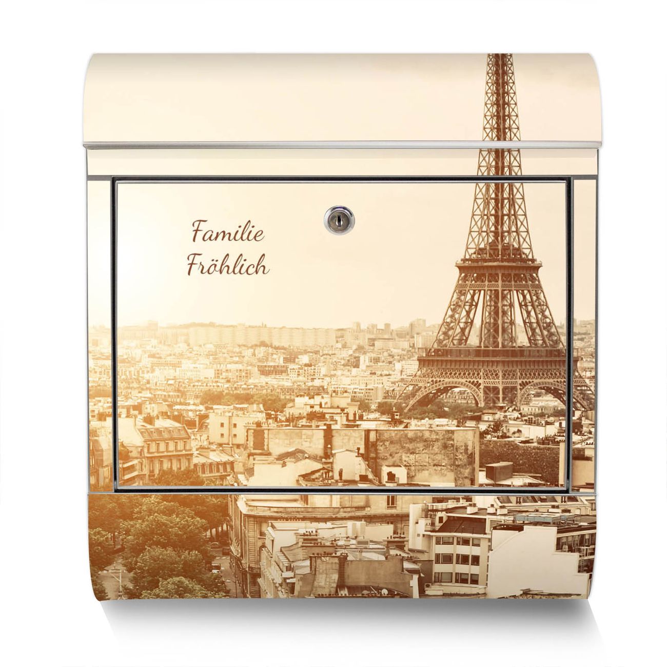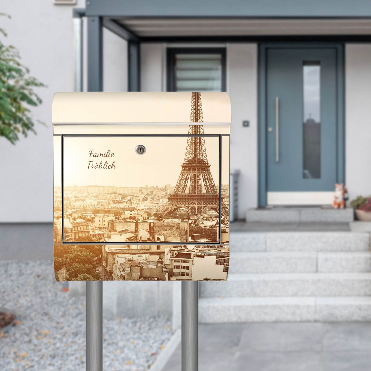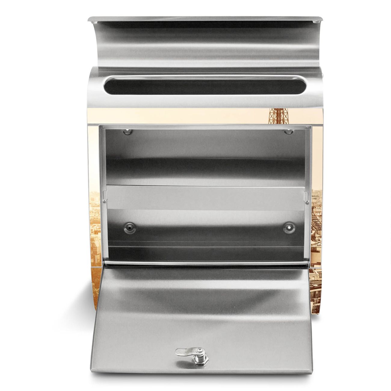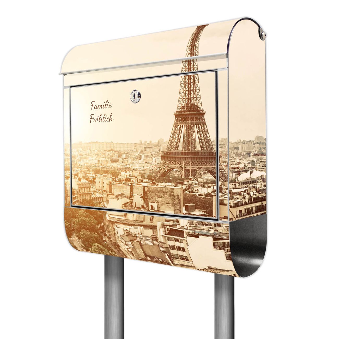 Der banjado Edelstahl Standbriefkasten mit Motiv Dächer Von Paris und eigenem Wunschtext bietet Ihnen mit seinem Fassungsvermögen genügend Platz auch für große A4 Sendungen. Das integrierte Zeitungsfach eignet sich hervorragend, um unkompliziert die Tageszeitung zu fassen.