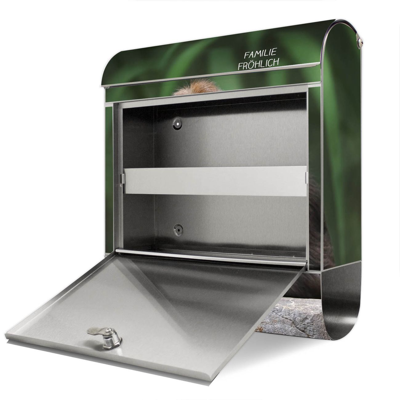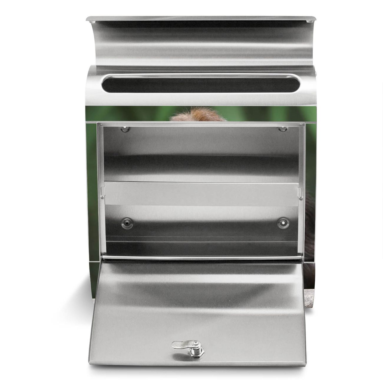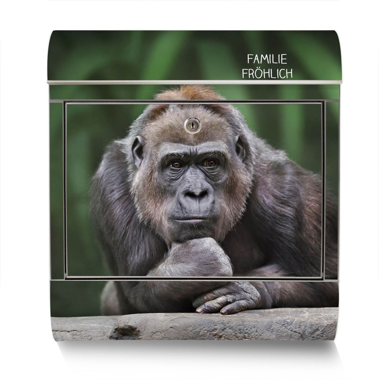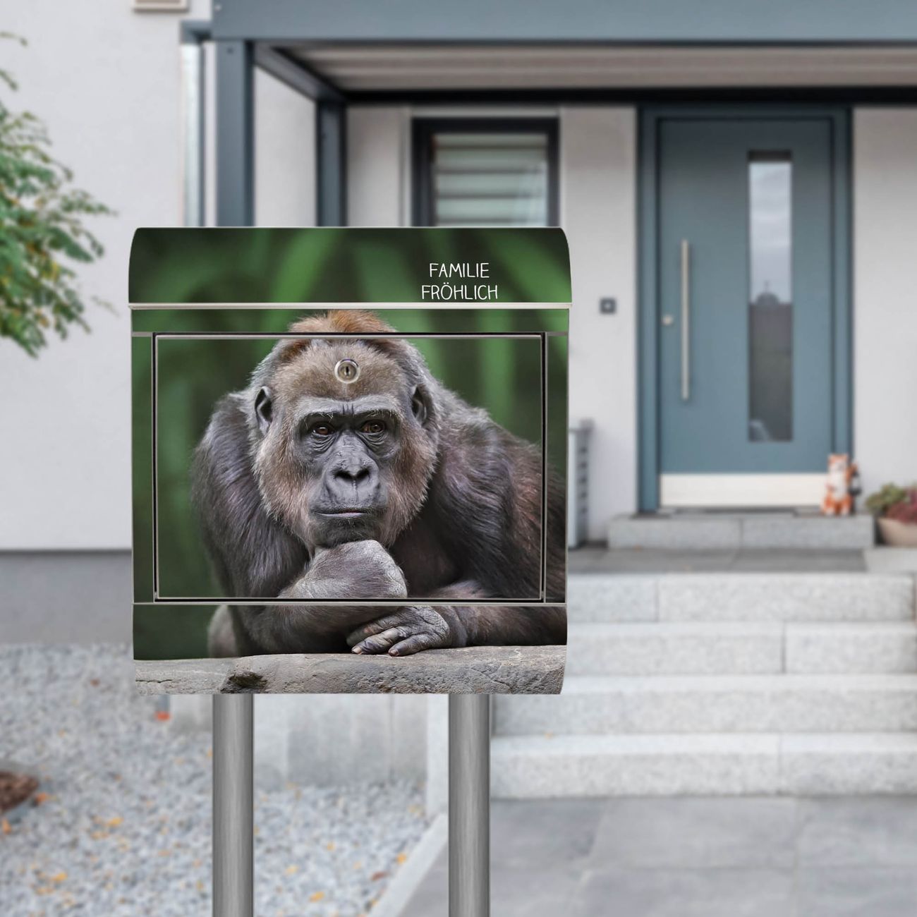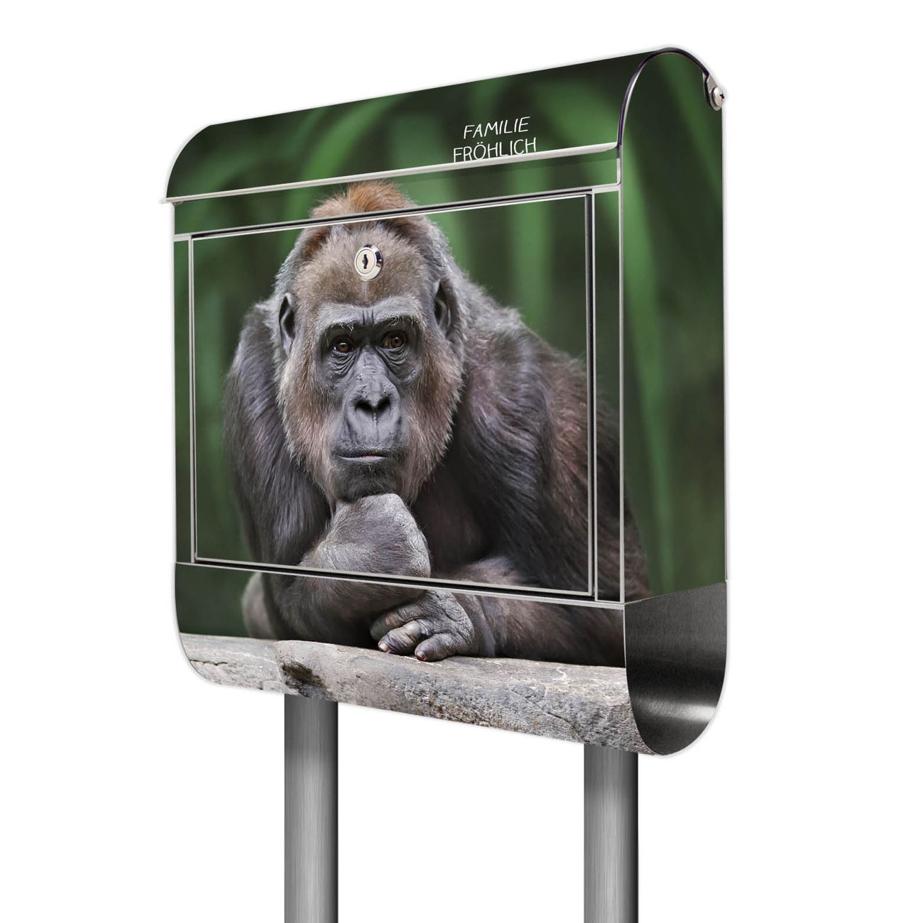 Der banjado Edelstahl Standbriefkasten mit Motiv Gorilla und eigenem Wunschtext bietet Ihnen mit seinem Fassungsvermögen genügend Platz auch für große A4 Sendungen. Das integrierte Zeitungsfach eignet sich hervorragend, um unkompliziert die Tageszeitung zu fassen.