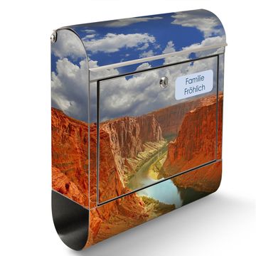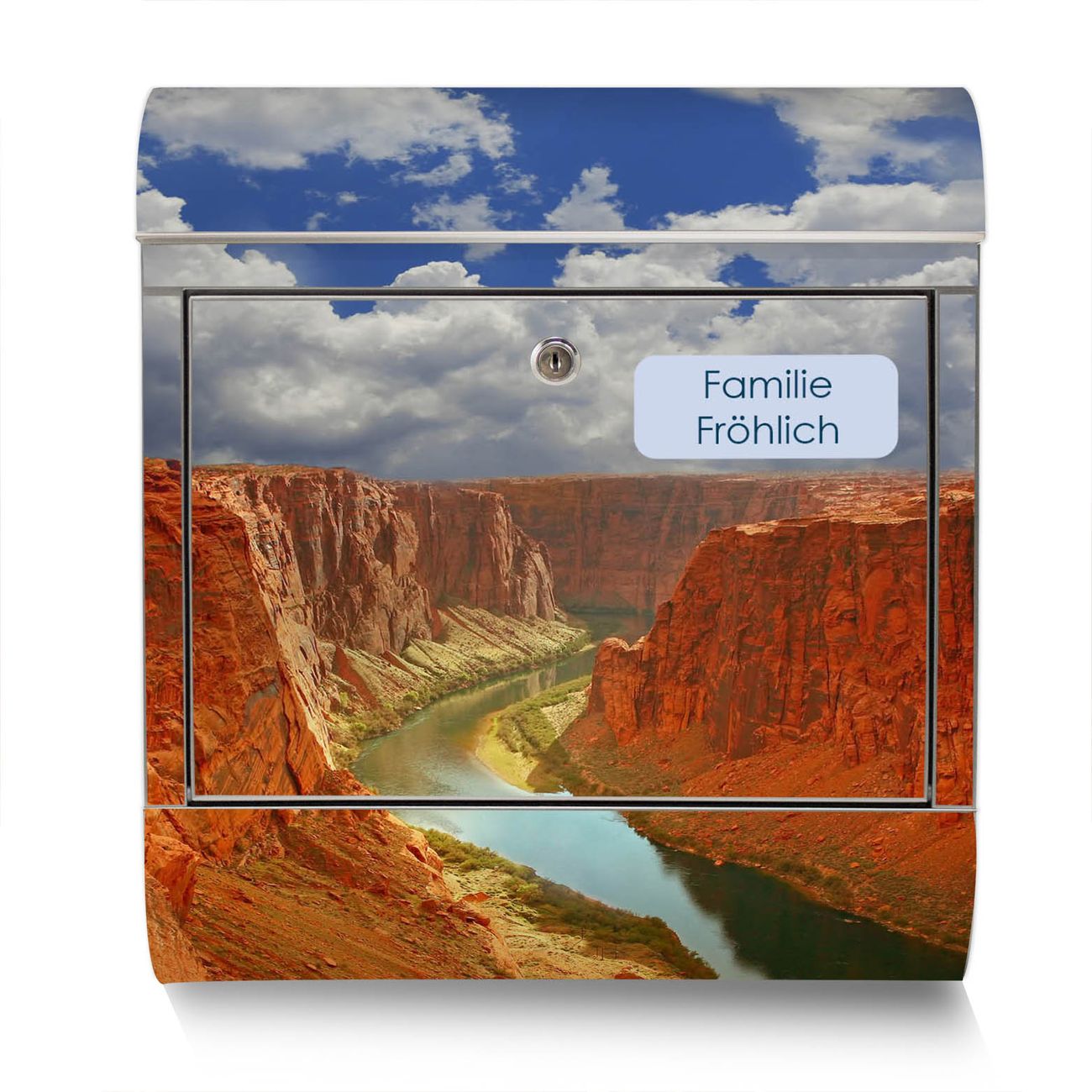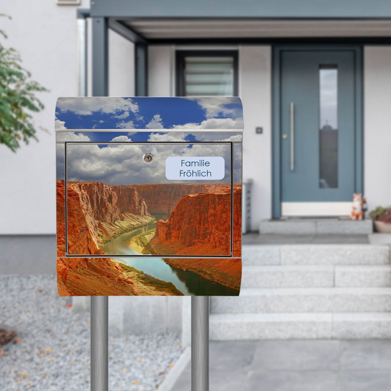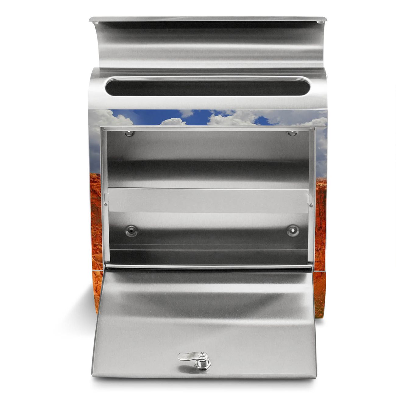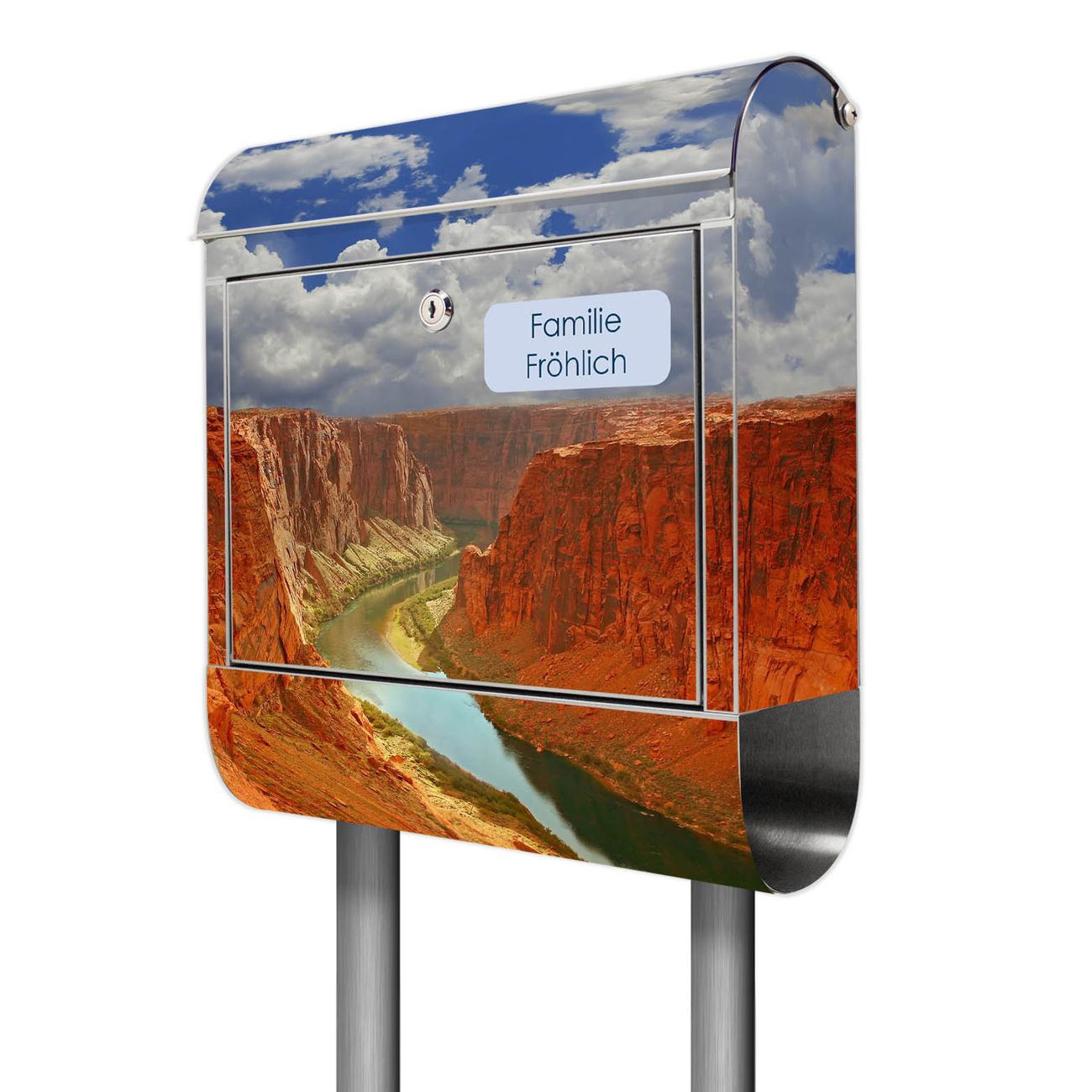 Der banjado Edelstahl Standbriefkasten mit Motiv Grand Canyon und eigenem Wunschtext bietet Ihnen mit seinem Fassungsvermögen genügend Platz auch für große A4 Sendungen. Das integrierte Zeitungsfach eignet sich hervorragend, um unkompliziert die Tageszeitung zu fassen.