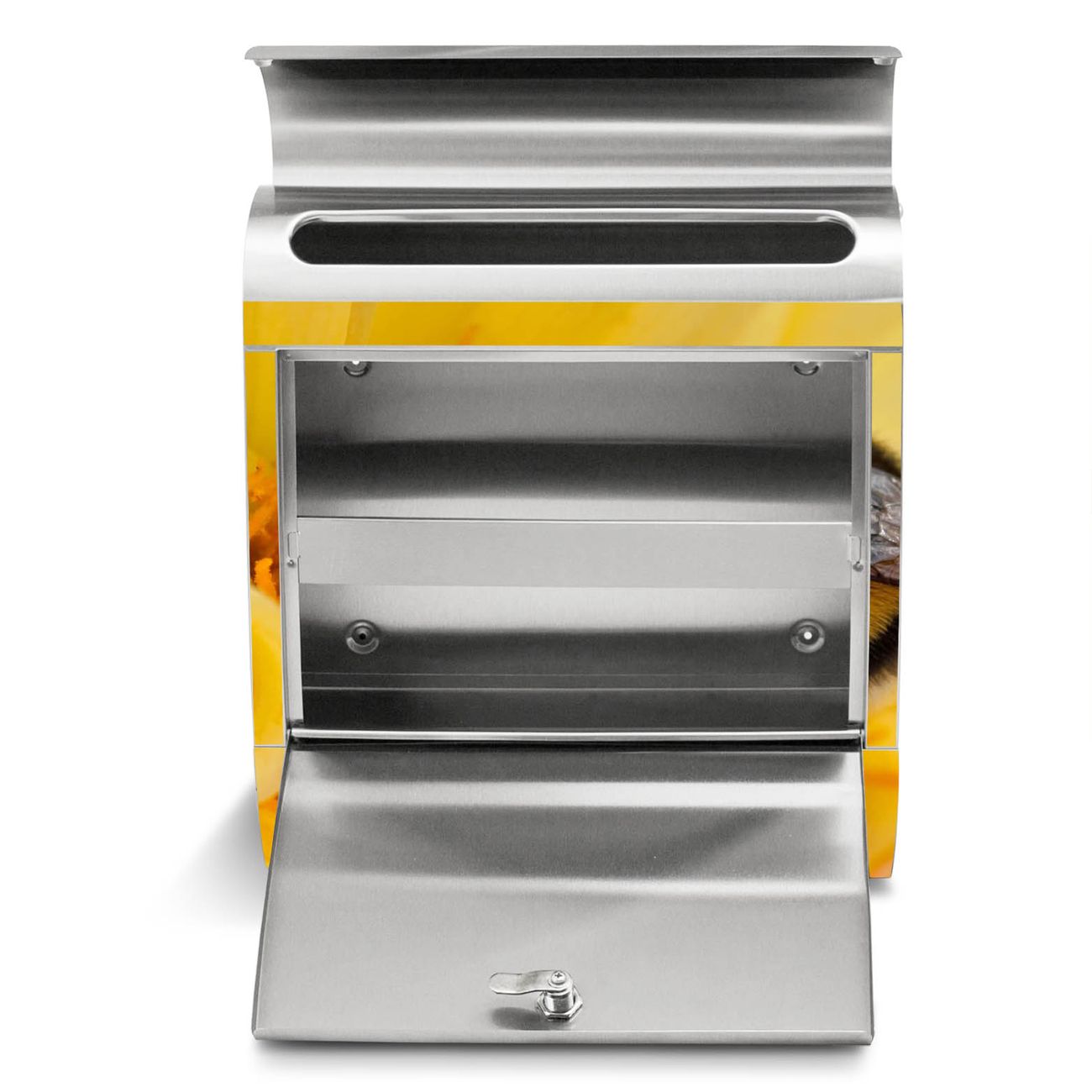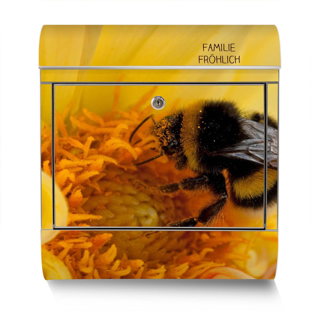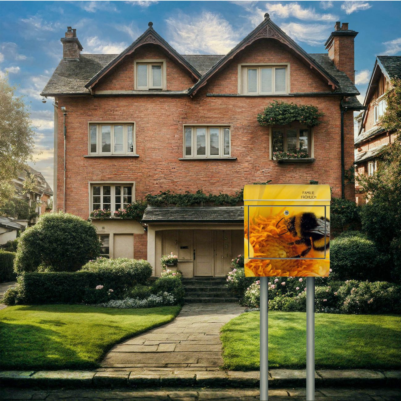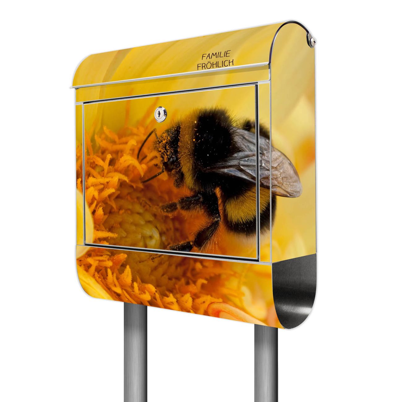 Der banjado Edelstahl Standbriefkasten mit Motiv Hummel und eigenem Wunschtext bietet Ihnen mit seinem Fassungsvermögen genügend Platz auch für große A4 Sendungen. Das integrierte Zeitungsfach eignet sich hervorragend, um unkompliziert die Tageszeitung zu fassen.