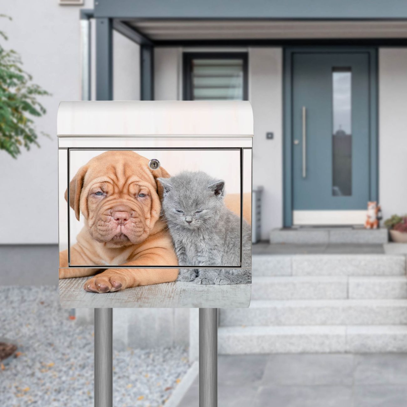 Der Motivstandbriefkasten hat ein sehr ansprechendes und ausgefallenes Design, damit entlocken Sie Ihren Nachbarn und dem Postboten ein Lächeln. Heben Sie Sich ab von der tristen grauen Masse, ohne auf Funktionalität zu verzichten. Der Briefkasten besteht aus hochwertigem 18/0 Edelstahl und die Wetter- und UV-resistenten Folie mit Hund und Katze Motiv ist zusätzlich mit einem Schutzlaminat überzogen. Der Standbriefkasten wird mit Montagematerial und zwei Schlüsseln geliefert.