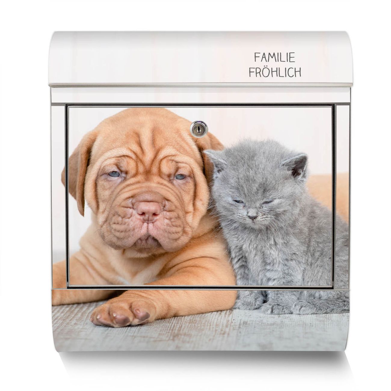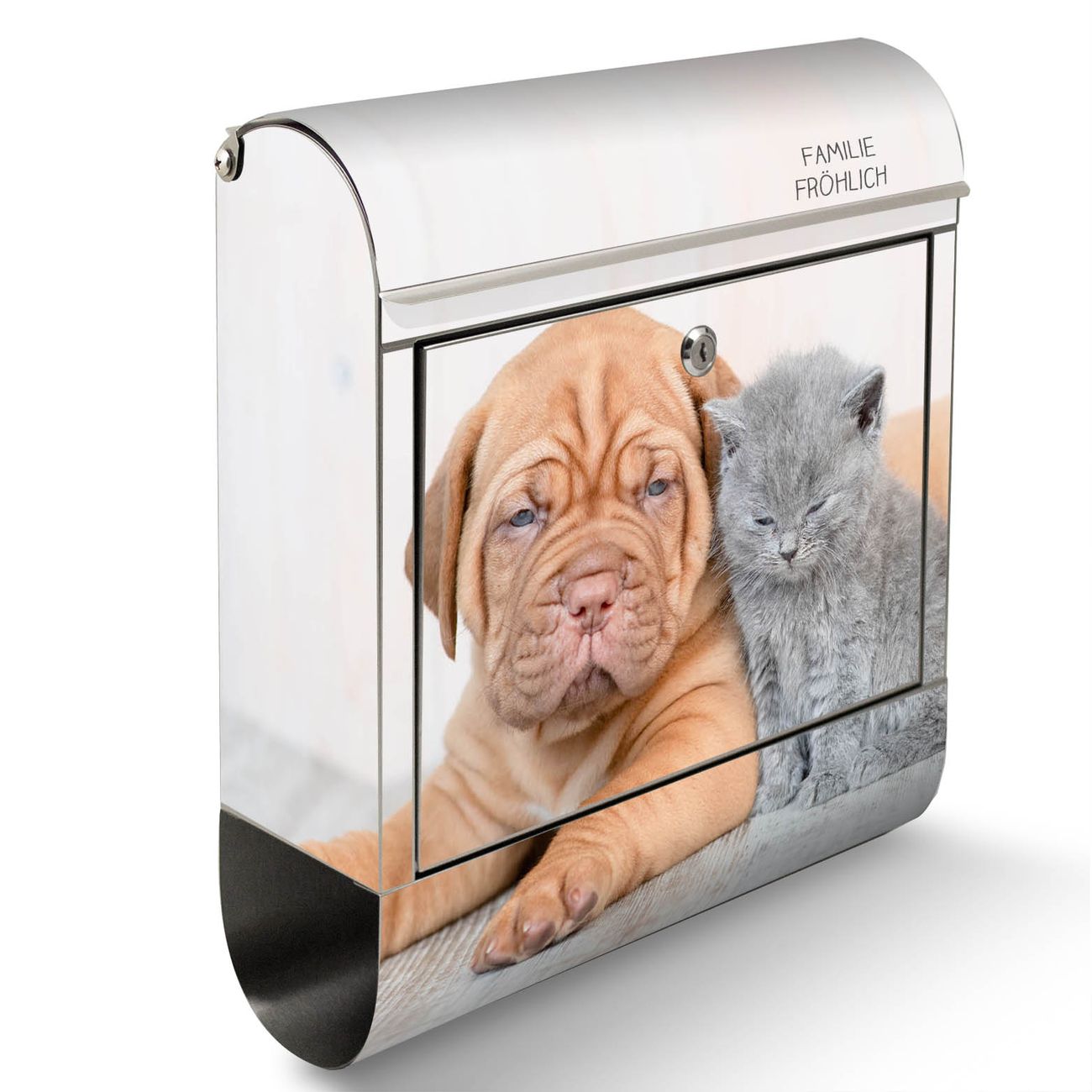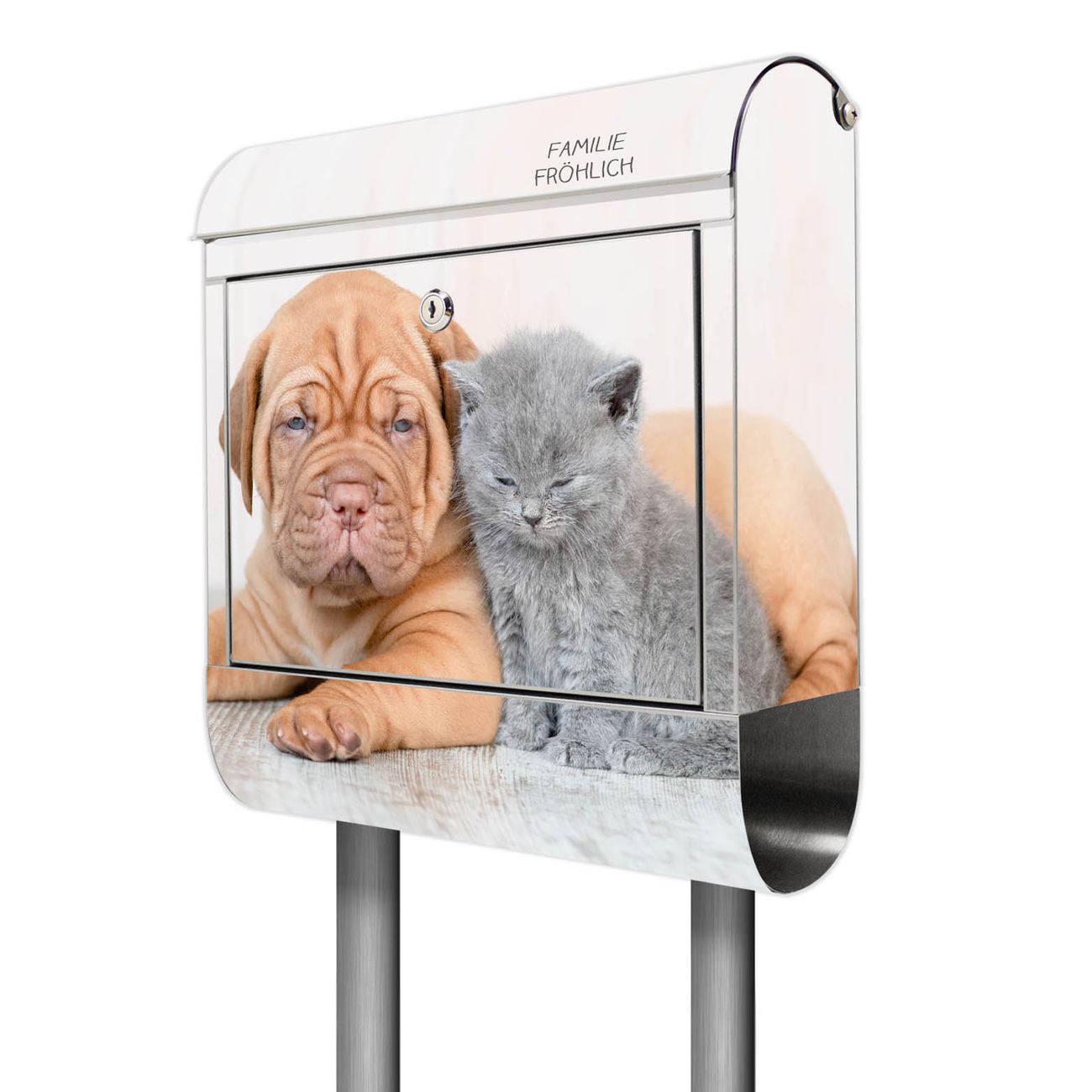 Der banjado Edelstahl Standbriefkasten mit Motiv Hund und Katze und eigenem Wunschtext bietet Ihnen mit seinem Fassungsvermögen genügend Platz auch für große A4 Sendungen. Das integrierte Zeitungsfach eignet sich hervorragend, um unkompliziert die Tageszeitung zu fassen.