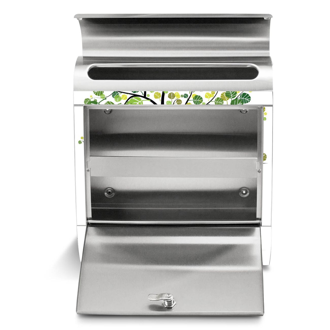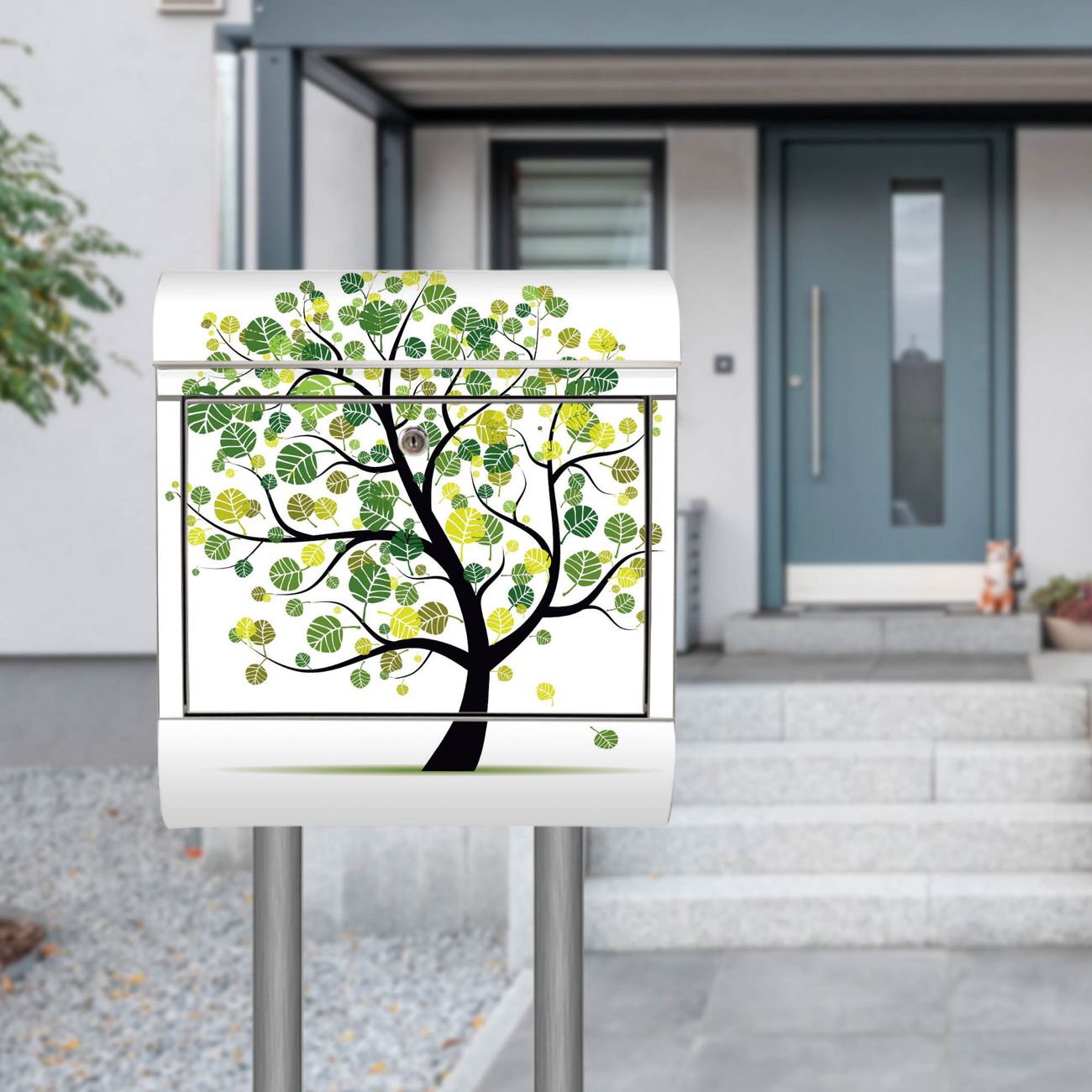 Der Motivstandbriefkasten hat ein sehr ansprechendes und ausgefallenes Design, damit entlocken Sie Ihren Nachbarn und dem Postboten ein Lächeln. Heben Sie Sich ab von der tristen grauen Masse, ohne auf Funktionalität zu verzichten. Der Briefkasten besteht aus hochwertigem 18/0 Edelstahl und die Wetter- und UV-resistenten Folie mit Laubzauberbaum Motiv ist zusätzlich mit einem Schutzlaminat überzogen. Der Standbriefkasten wird mit Montagematerial und zwei Schlüsseln geliefert.