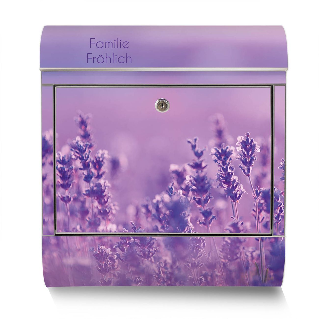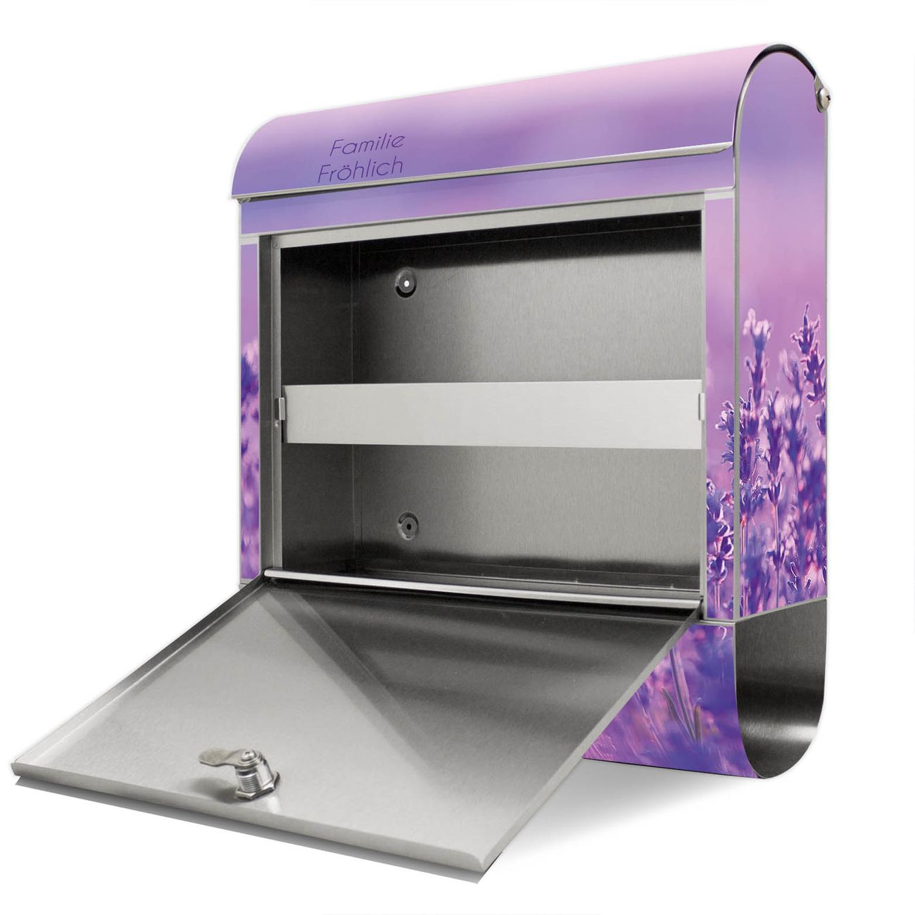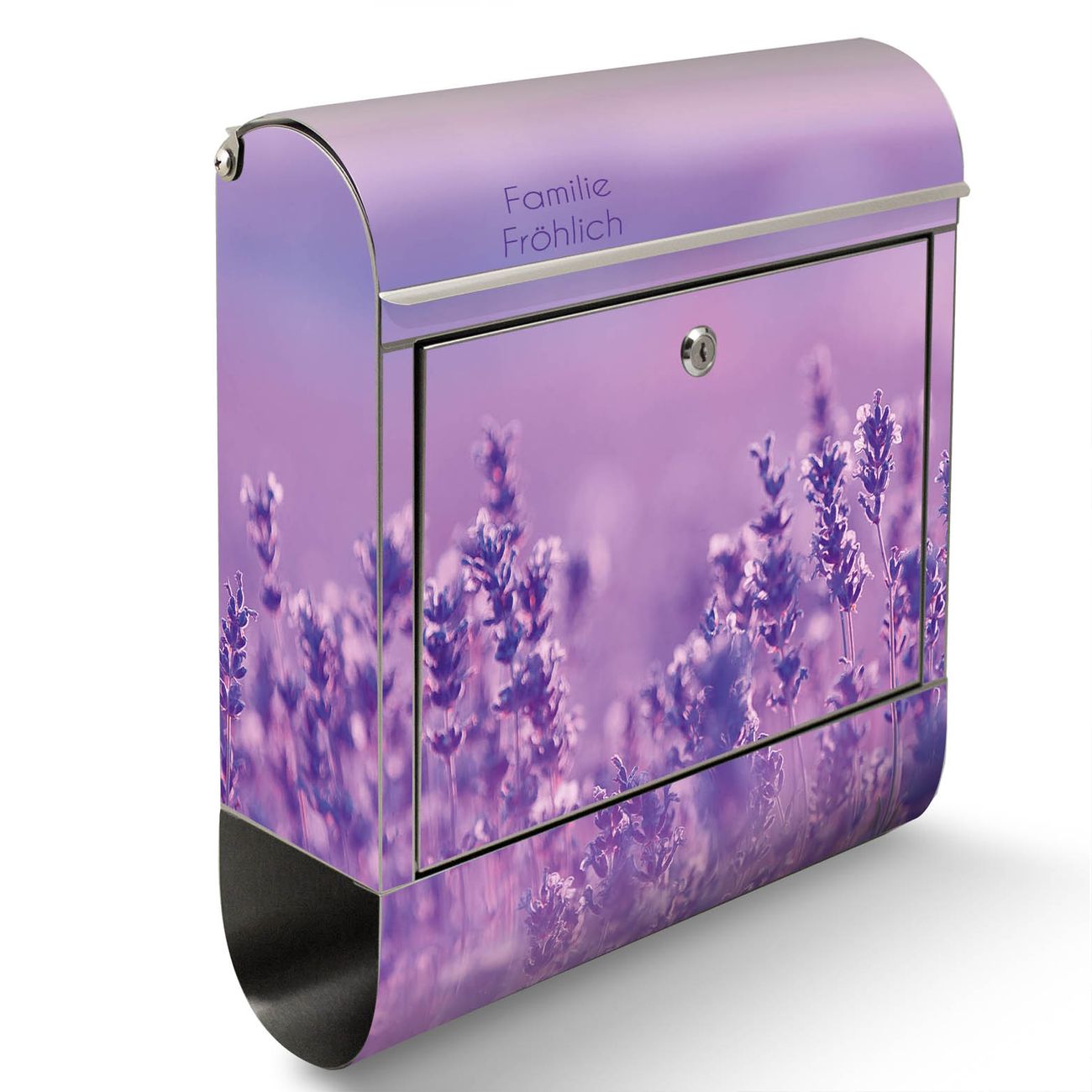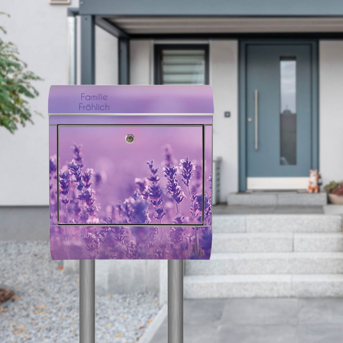 Der banjado Edelstahl Standbriefkasten mit Motiv Lavendelmeer und eigenem Wunschtext bietet Ihnen mit seinem Fassungsvermögen genügend Platz auch für große A4 Sendungen. Das integrierte Zeitungsfach eignet sich hervorragend, um unkompliziert die Tageszeitung zu fassen.