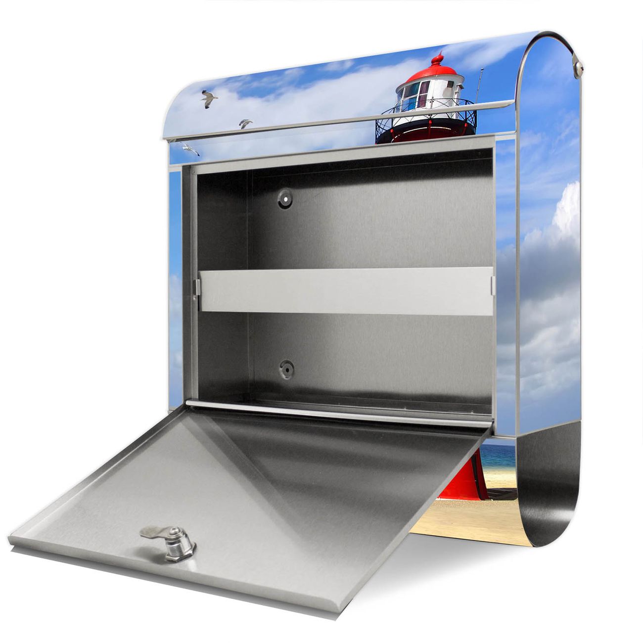 Der banjado Edelstahl Standbriefkasten mit Motiv Leuchtturm Westkapelle und eigenem Wunschtext bietet Ihnen mit seinem Fassungsvermögen genügend Platz auch für große A4 Sendungen. Das integrierte Zeitungsfach eignet sich hervorragend, um unkompliziert die Tageszeitung zu fassen.
