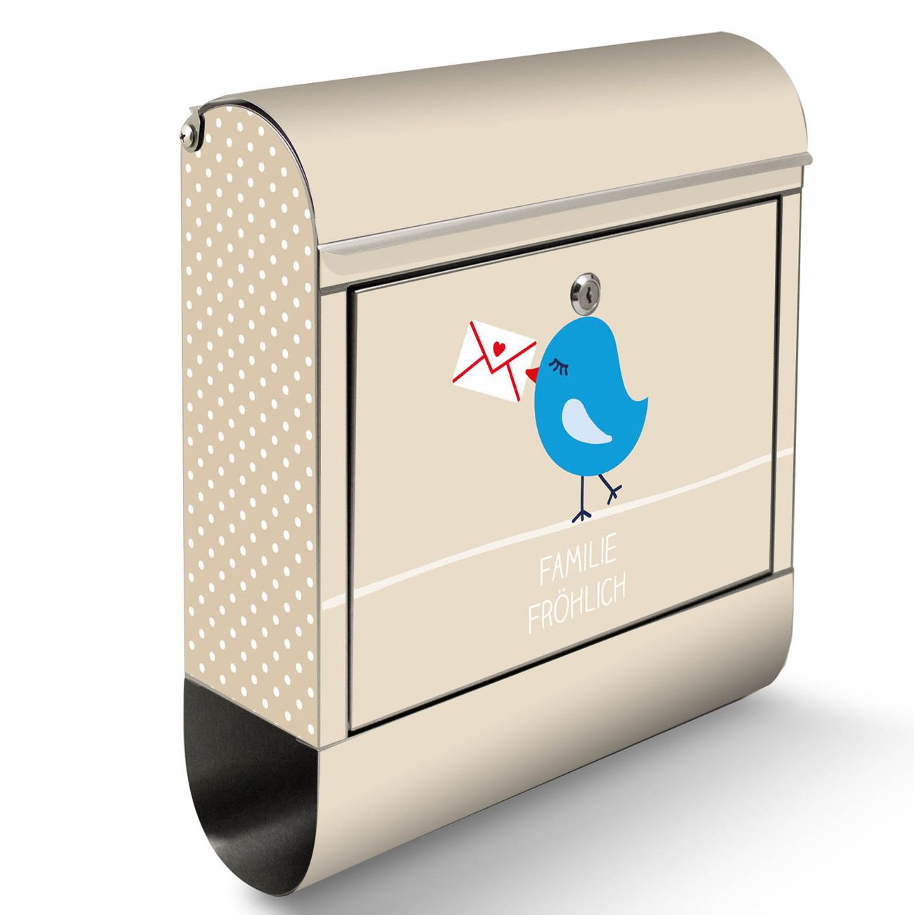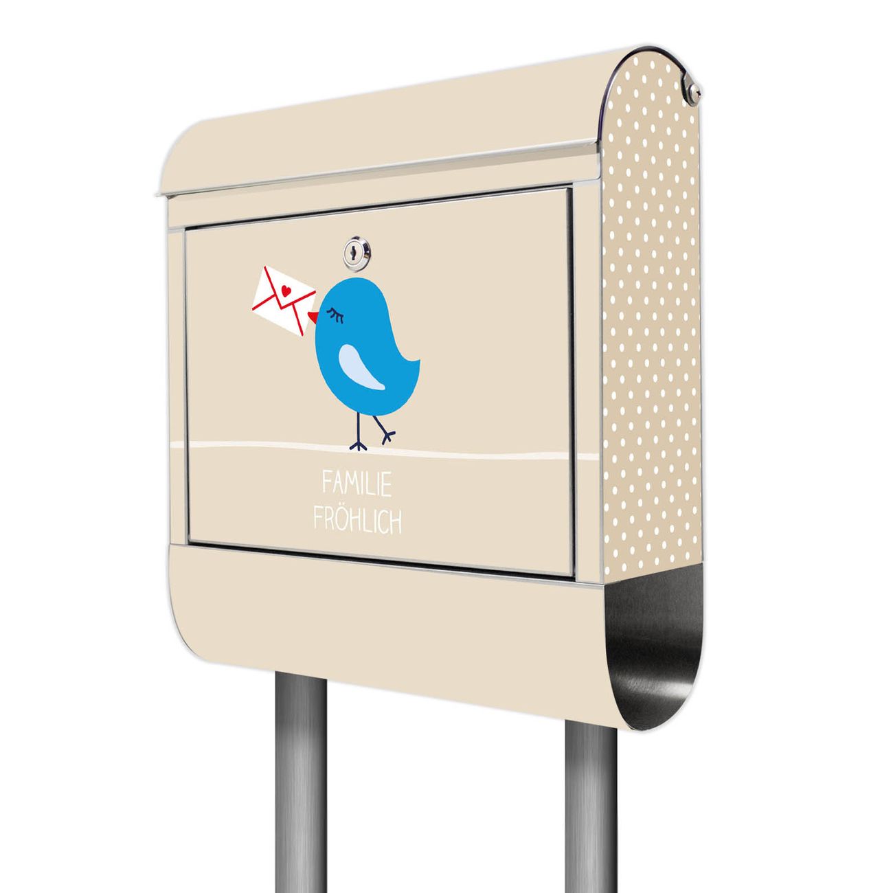 Der Motivstandbriefkasten hat ein sehr ansprechendes und ausgefallenes Design, damit entlocken Sie Ihren Nachbarn und dem Postboten ein Lächeln. Heben Sie Sich ab von der tristen grauen Masse, ohne auf Funktionalität zu verzichten. Der Briefkasten besteht aus hochwertigem 18/0 Edelstahl und die Wetter- und UV-resistenten Folie mit Liebesbrief Motiv ist zusätzlich mit einem Schutzlaminat überzogen. Der Standbriefkasten wird mit Montagematerial und zwei Schlüsseln geliefert.
