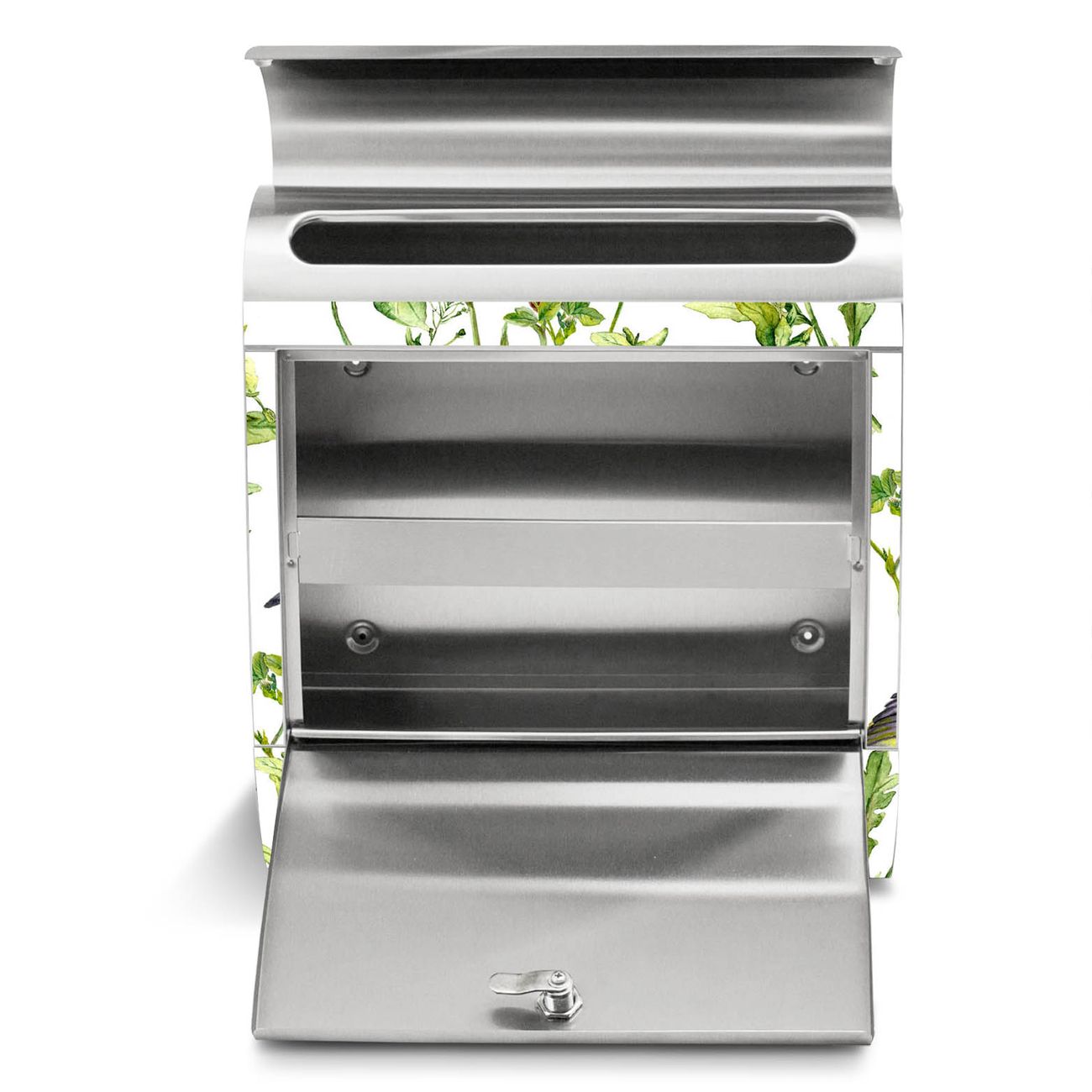 Der banjado Edelstahl Standbriefkasten mit Motiv Meisen im Klee und eigenem Wunschtext bietet Ihnen mit seinem Fassungsvermögen genügend Platz auch für große A4 Sendungen. Das integrierte Zeitungsfach eignet sich hervorragend, um unkompliziert die Tageszeitung zu fassen.