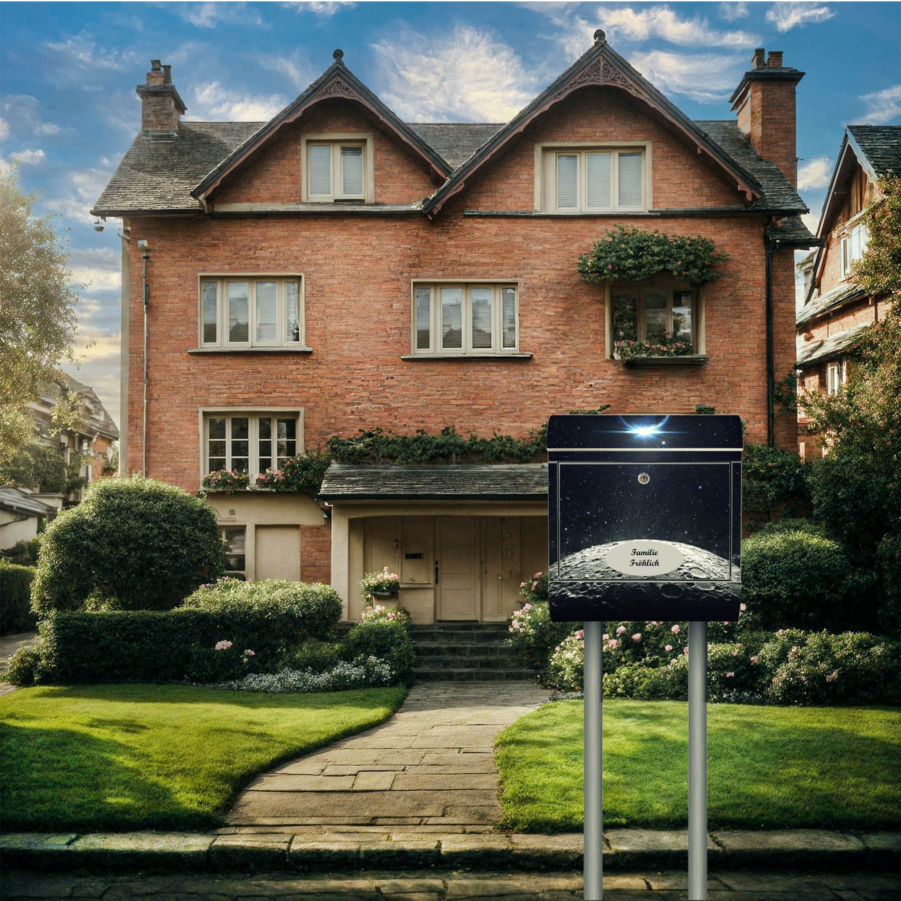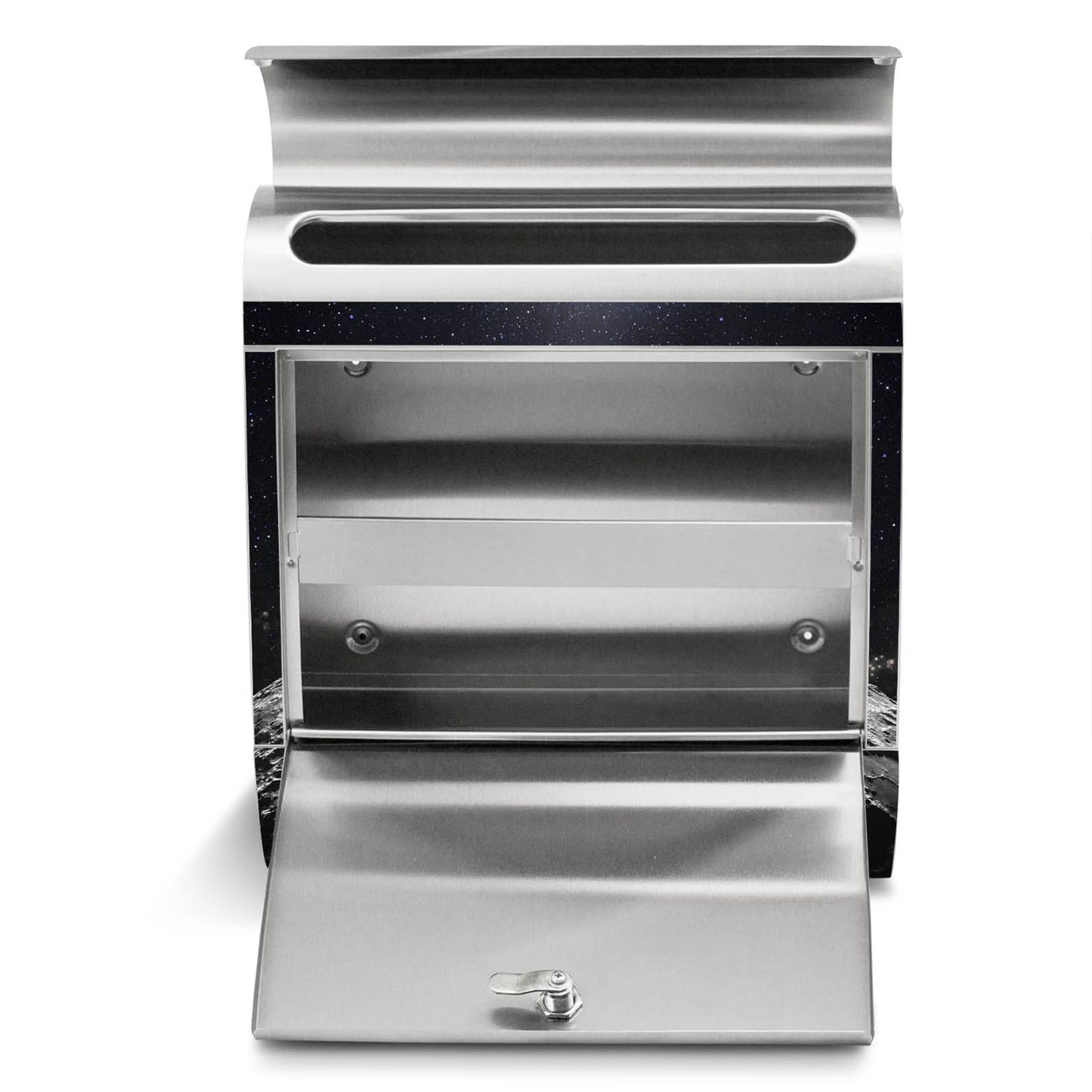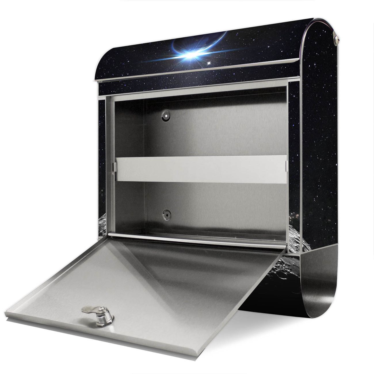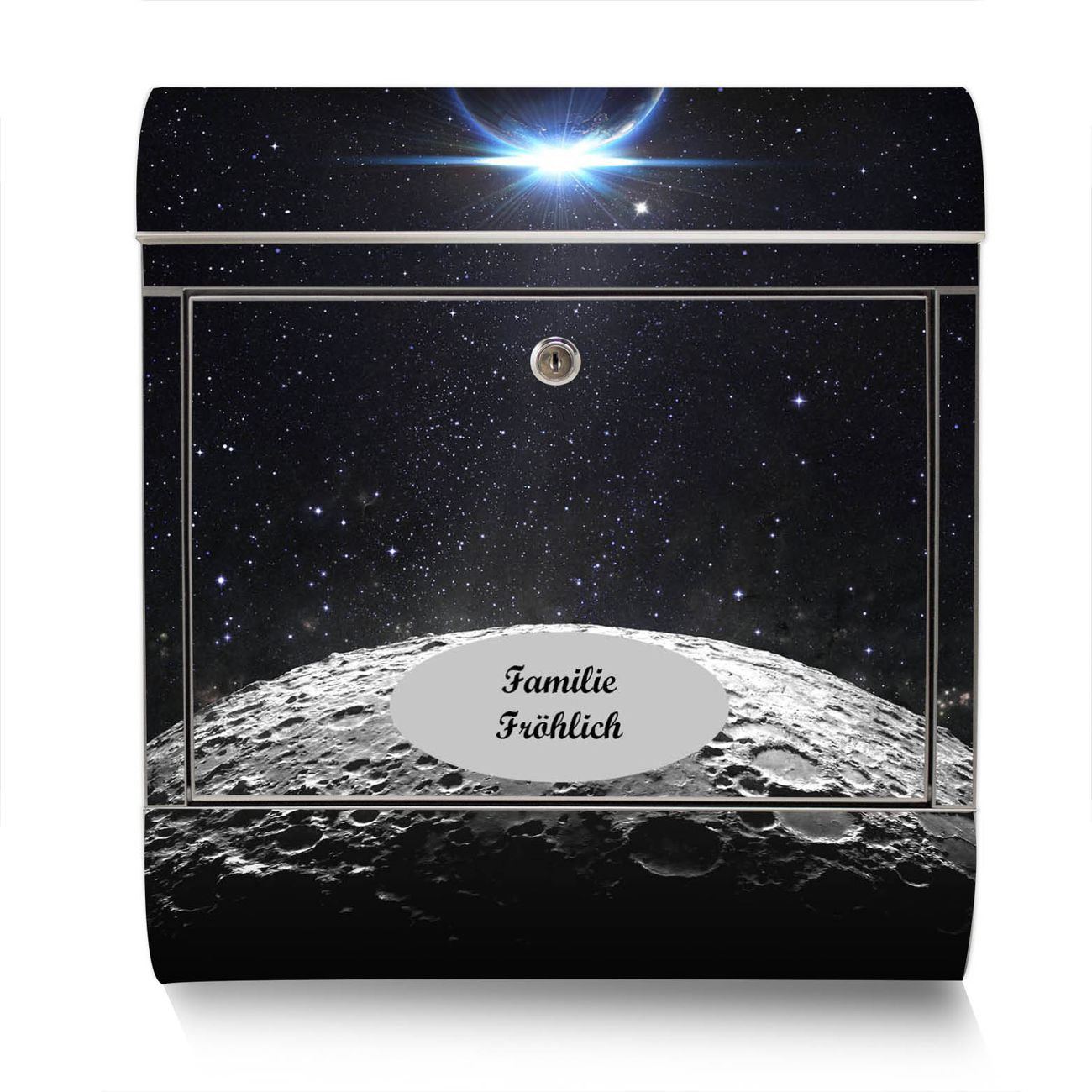 Der Motivstandbriefkasten hat ein sehr ansprechendes und ausgefallenes Design, damit entlocken Sie Ihren Nachbarn und dem Postboten ein Lächeln. Heben Sie Sich ab von der tristen grauen Masse, ohne auf Funktionalität zu verzichten. Der Briefkasten besteht aus hochwertigem 18/0 Edelstahl und die Wetter- und UV-resistenten Folie mit Mondlandschaft Motiv ist zusätzlich mit einem Schutzlaminat überzogen. Der Standbriefkasten wird mit Montagematerial und zwei Schlüsseln geliefert.