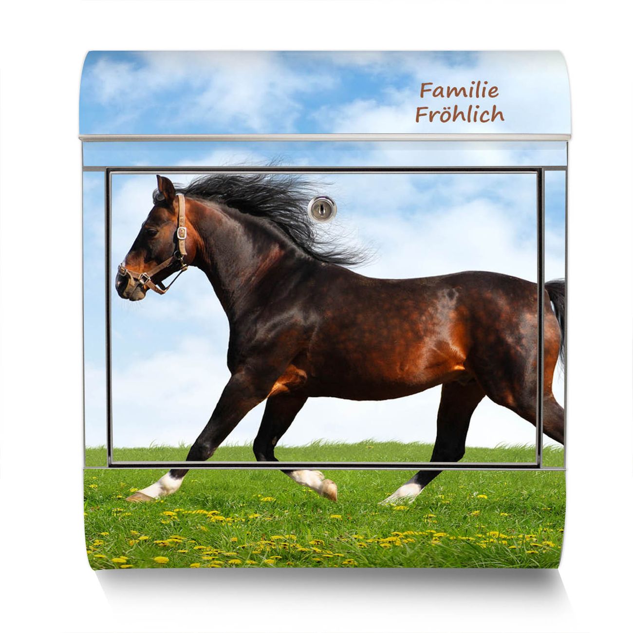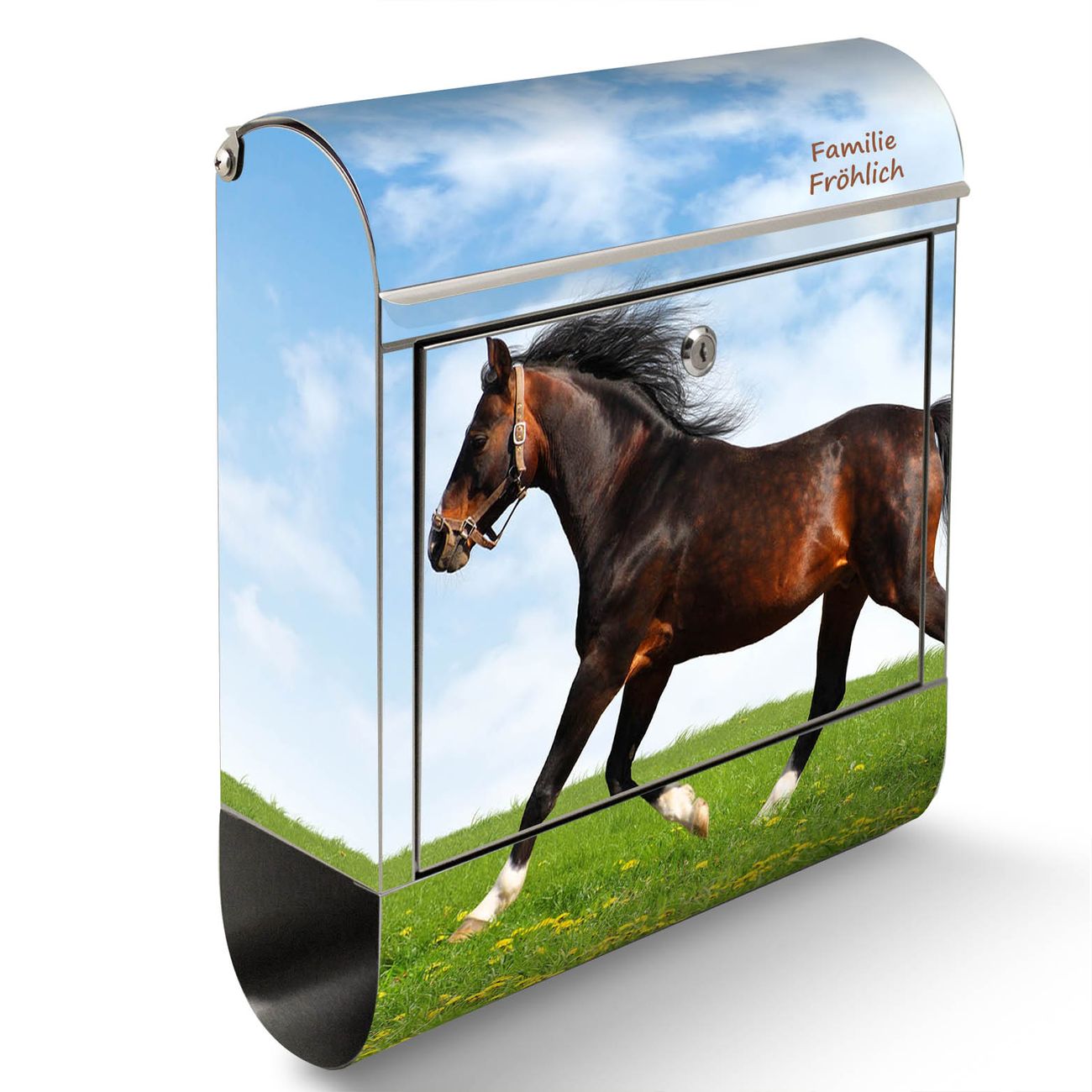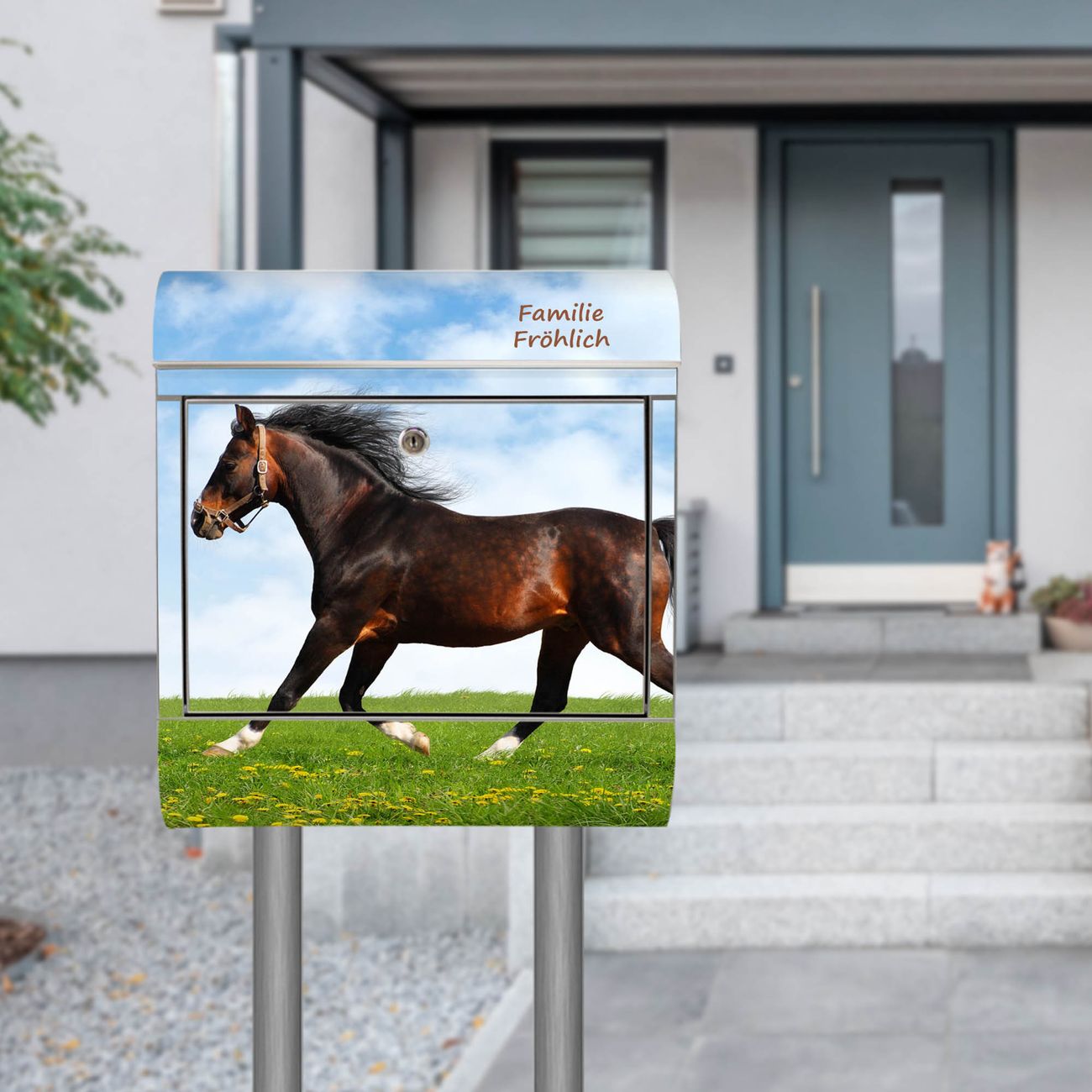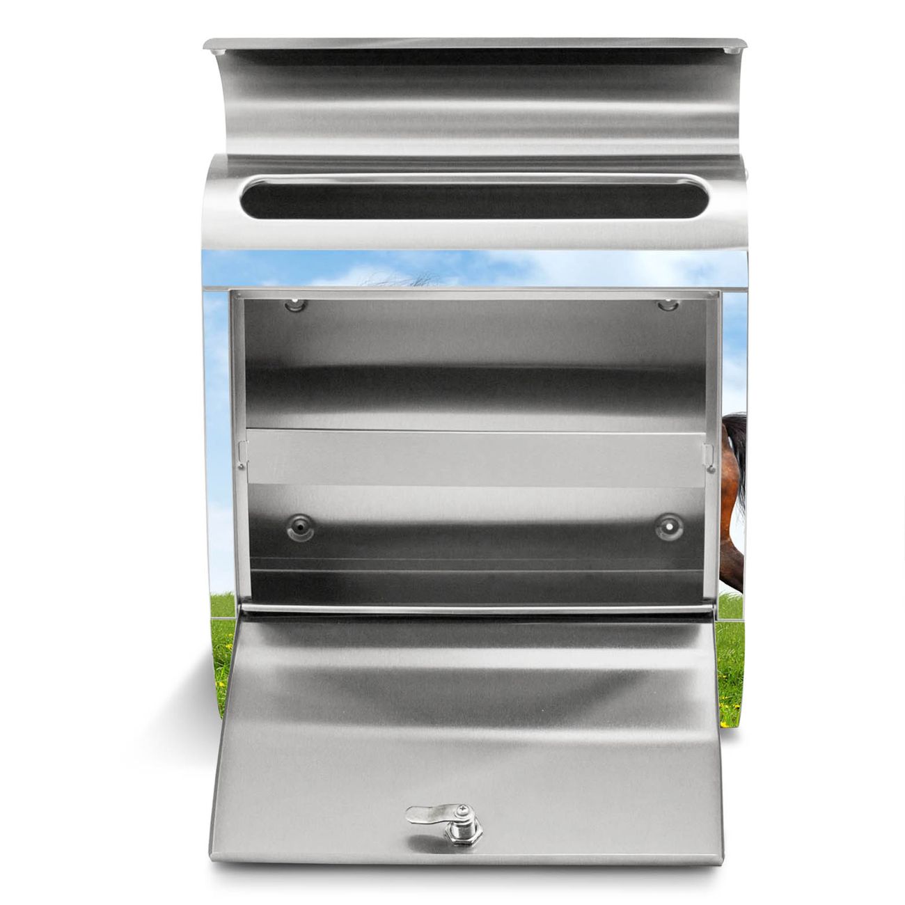 Der Motivstandbriefkasten hat ein sehr ansprechendes und ausgefallenes Design, damit entlocken Sie Ihren Nachbarn und dem Postboten ein Lächeln. Heben Sie Sich ab von der tristen grauen Masse, ohne auf Funktionalität zu verzichten. Der Briefkasten besteht aus hochwertigem 18/0 Edelstahl und die Wetter- und UV-resistenten Folie mit Pferd Motiv ist zusätzlich mit einem Schutzlaminat überzogen. Der Standbriefkasten wird mit Montagematerial und zwei Schlüsseln geliefert.