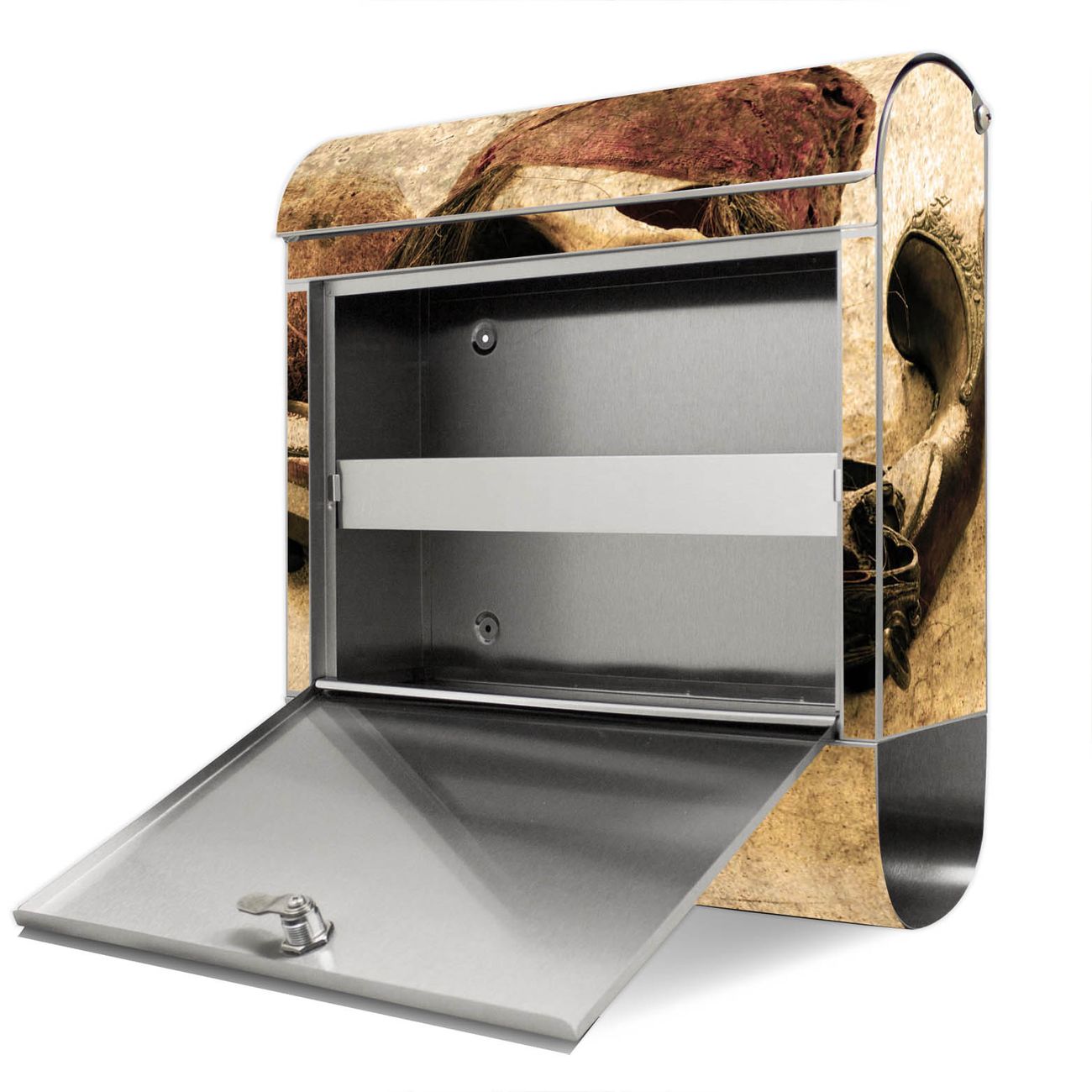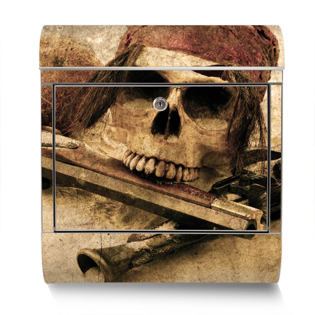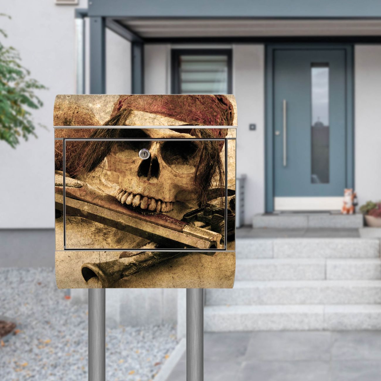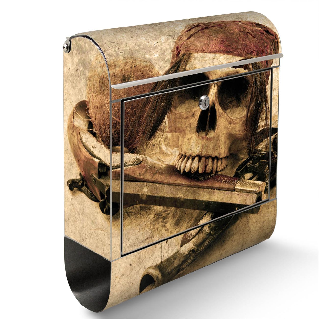 Der Motivstandbriefkasten hat ein sehr ansprechendes und ausgefallenes Design, damit entlocken Sie Ihren Nachbarn und dem Postboten ein Lächeln. Heben Sie Sich ab von der tristen grauen Masse, ohne auf Funktionalität zu verzichten. Der Briefkasten besteht aus hochwertigem 18/0 Edelstahl und die Wetter- und UV-resistenten Folie mit Pirat Motiv ist zusätzlich mit einem Schutzlaminat überzogen. Der Standbriefkasten wird mit Montagematerial und zwei Schlüsseln geliefert.