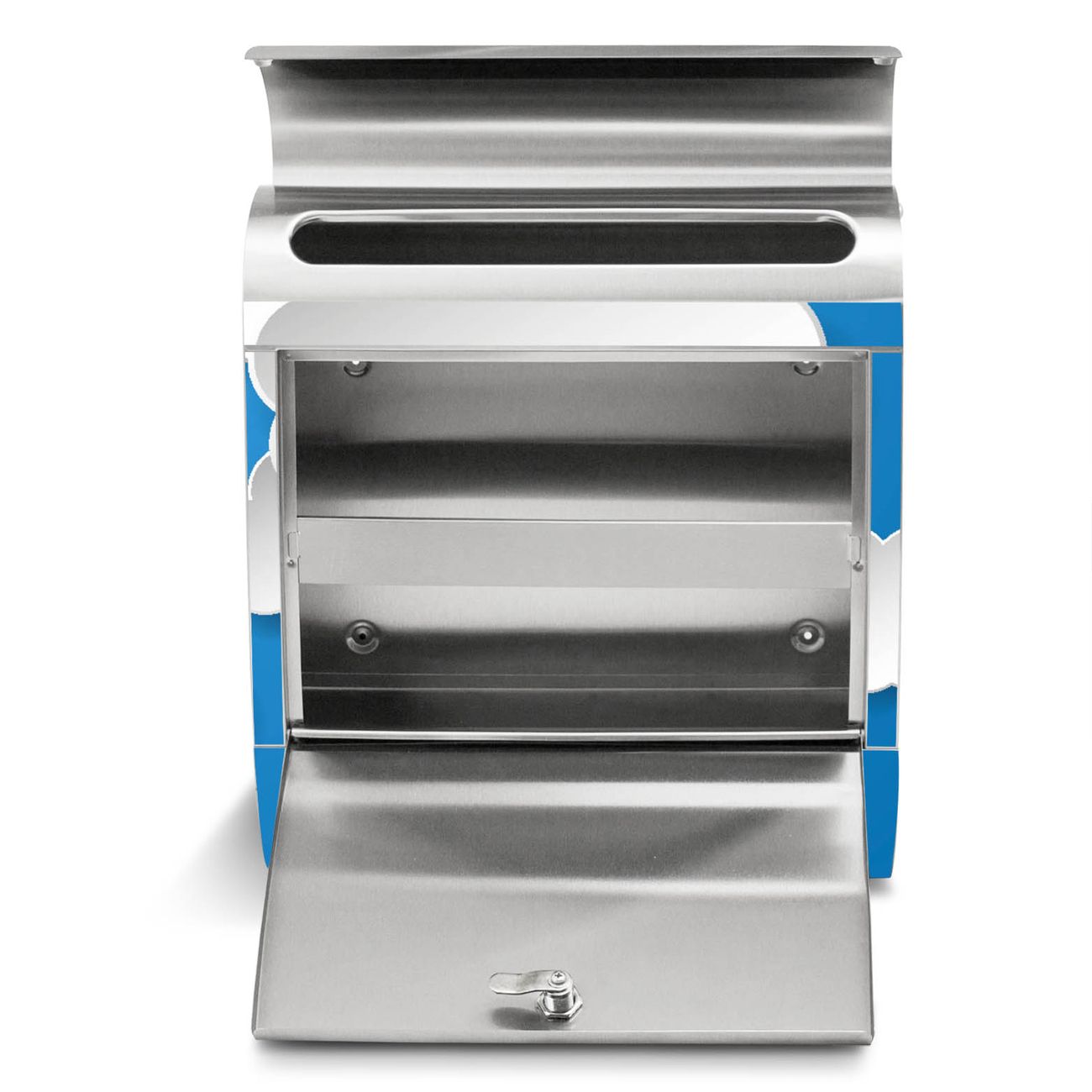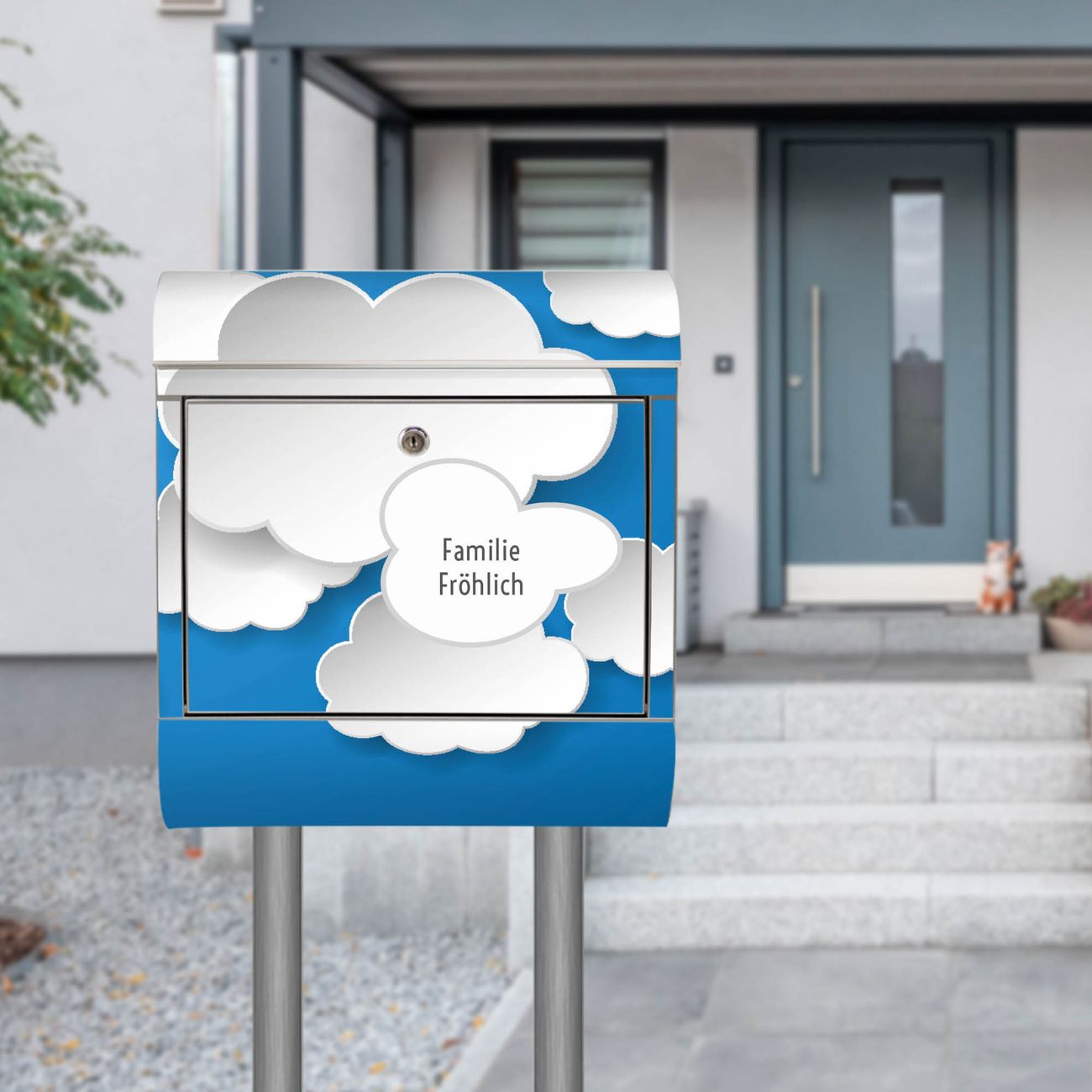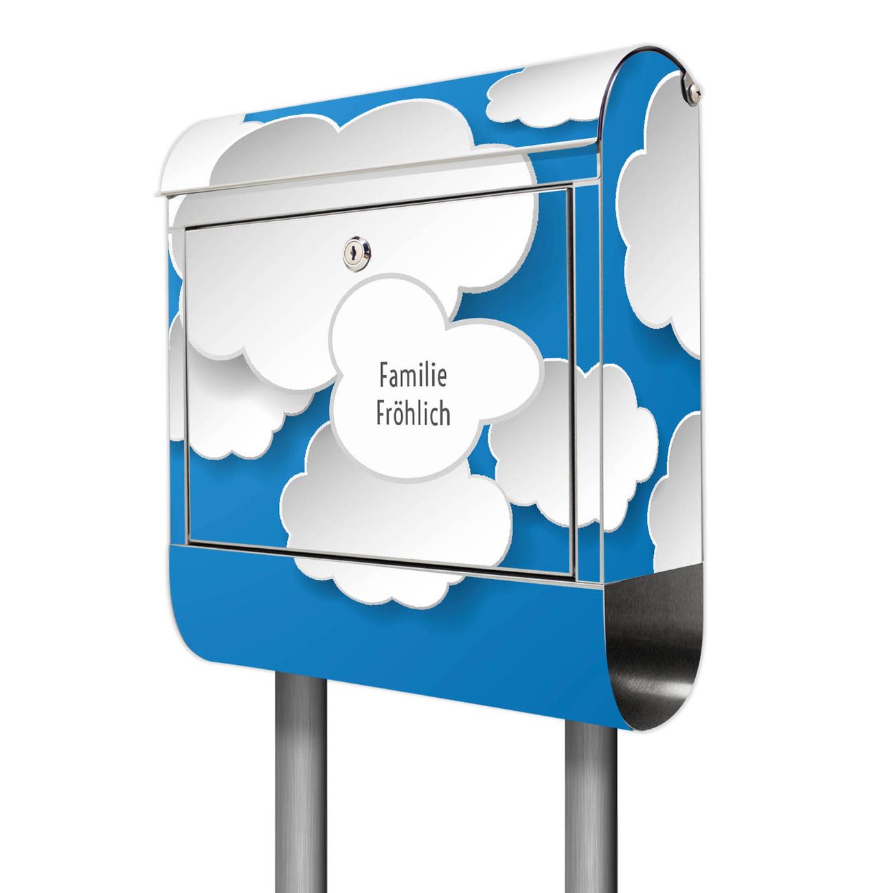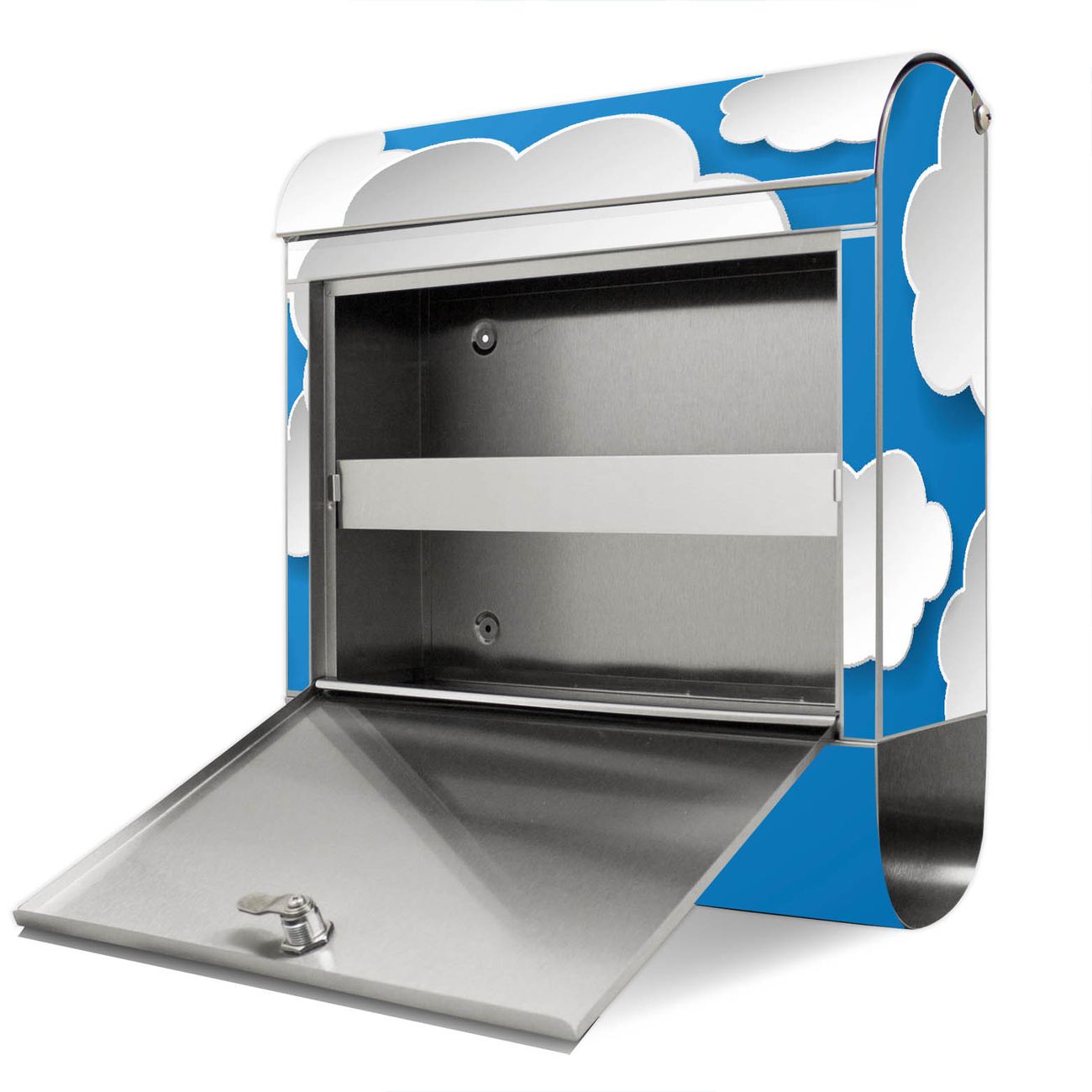 Der Motivstandbriefkasten hat ein sehr ansprechendes und ausgefallenes Design, damit entlocken Sie Ihren Nachbarn und dem Postboten ein Lächeln. Heben Sie Sich ab von der tristen grauen Masse, ohne auf Funktionalität zu verzichten. Der Briefkasten besteht aus hochwertigem 18/0 Edelstahl und die Wetter- und UV-resistenten Folie mit Plastische Wolken Motiv ist zusätzlich mit einem Schutzlaminat überzogen. Der Standbriefkasten wird mit Montagematerial und zwei Schlüsseln geliefert.
